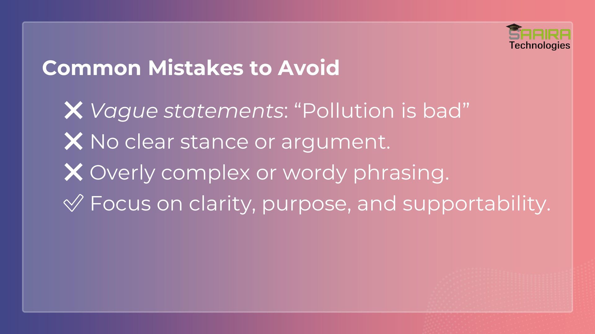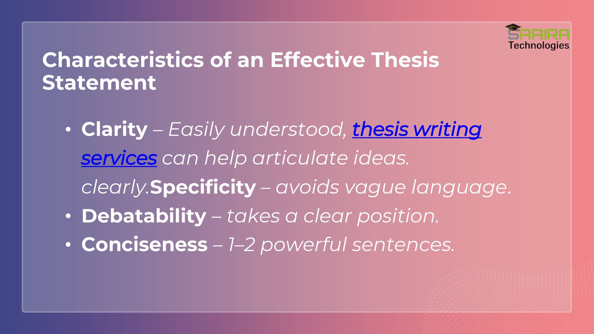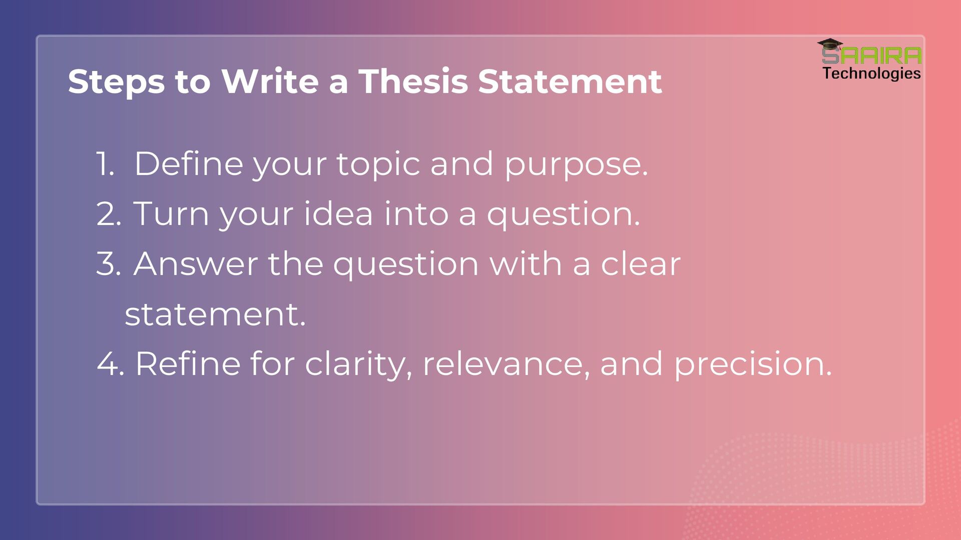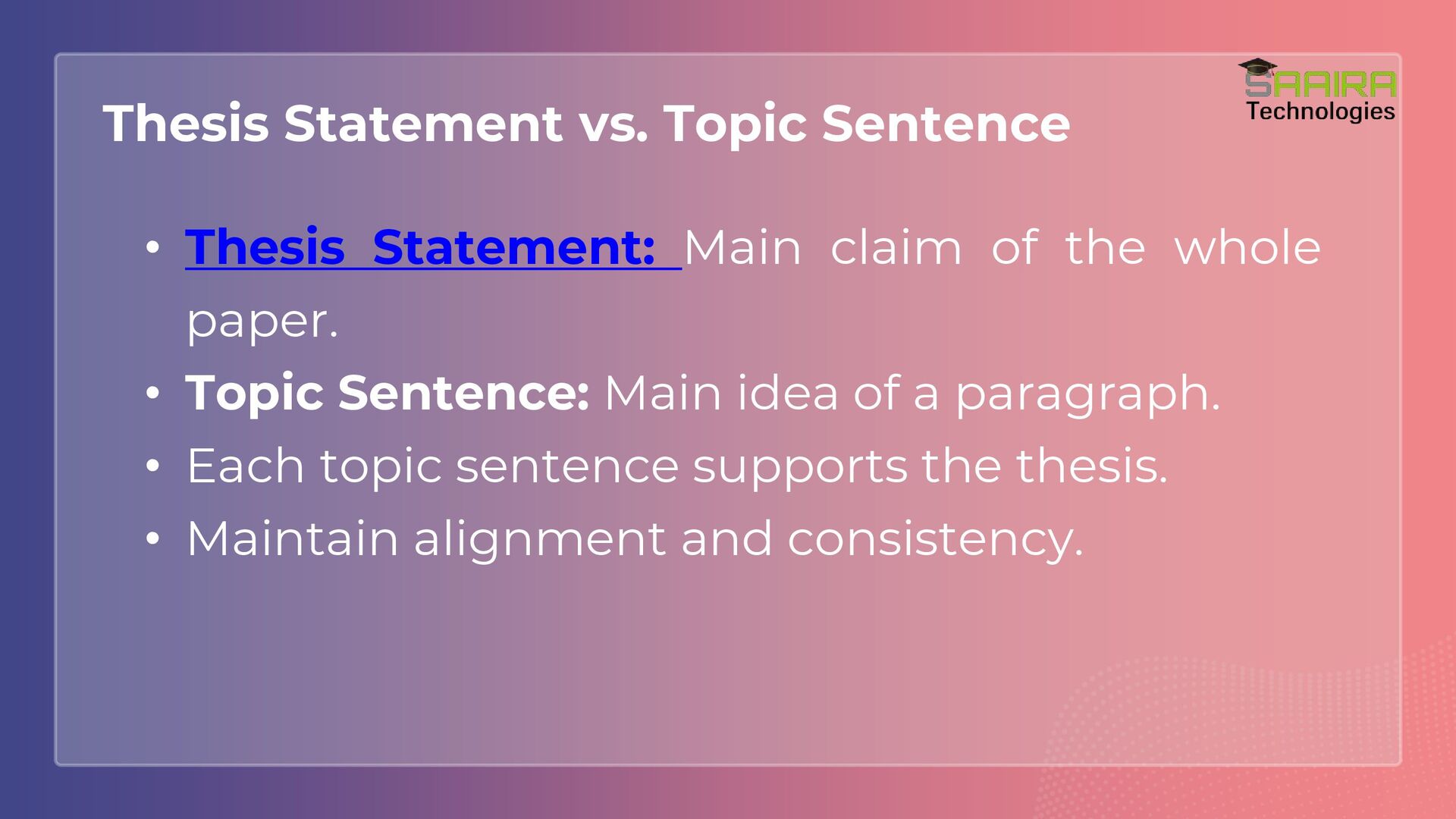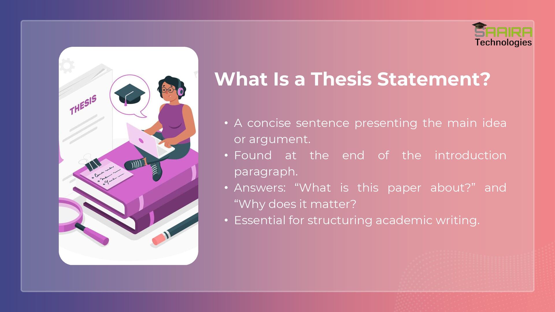 the main idea or argument. • Found at the end of the introduction paragraph. • Answers: “What is this paper about?” and “Why does it matter? • Essential for structuring academic writing.