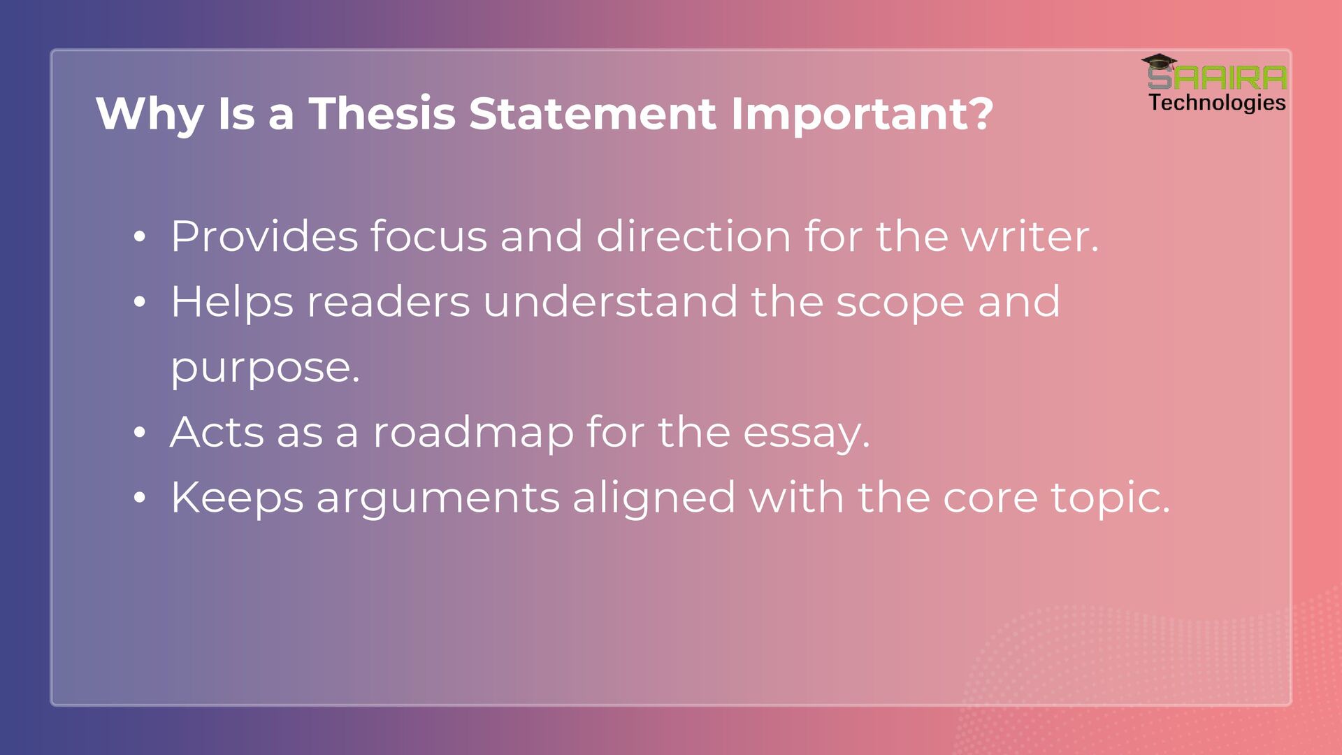 direction for the writer. • Helps readers understand the scope and purpose. • Acts as a roadmap for the essay. • Keeps arguments aligned with the core topic.