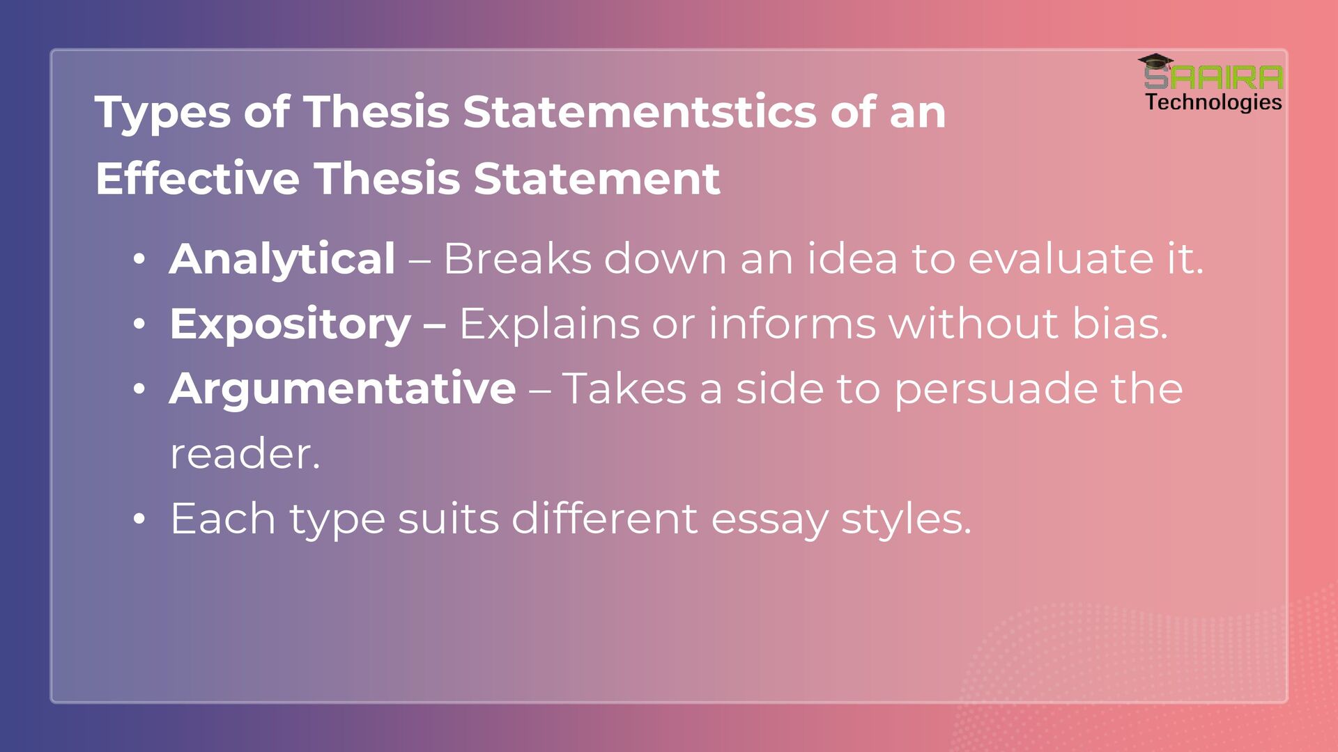 Analytical – Breaks down an idea to evaluate it. • Expository – Explains or informs without bias. • Argumentative – Takes a side to persuade the reader. • Each type suits different essay styles.