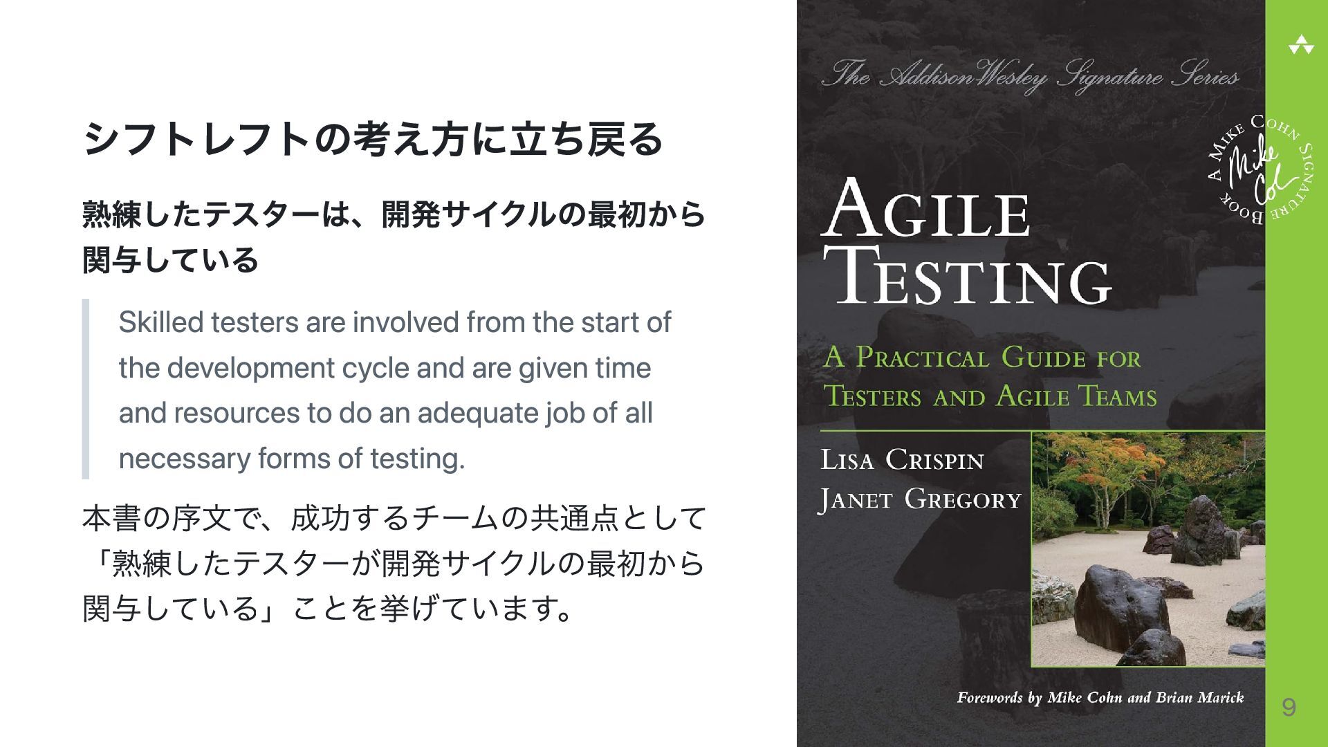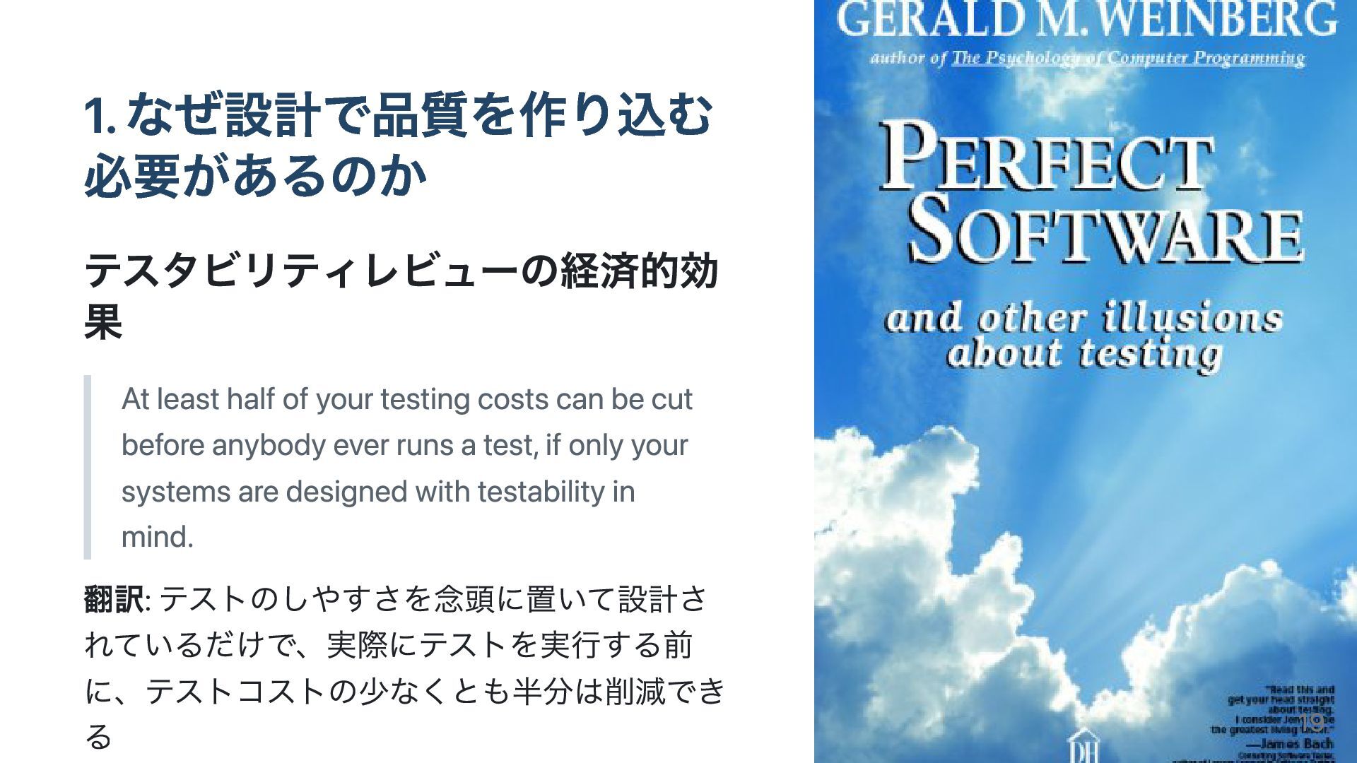 cycle decreases the cost and complexity of fixing bugs because they are found closer to when they were created, which establishes more of a context for what could have caused things to go wrong. 翻訳: 早い段階でテストを行うことは、バグ修 正のコストと複雑さを低減させます。なぜな ら、バグが作られた時点に近い場所で発見され るため、何が問題を引き起こしたかの文脈がよ り明確になるからです。 7