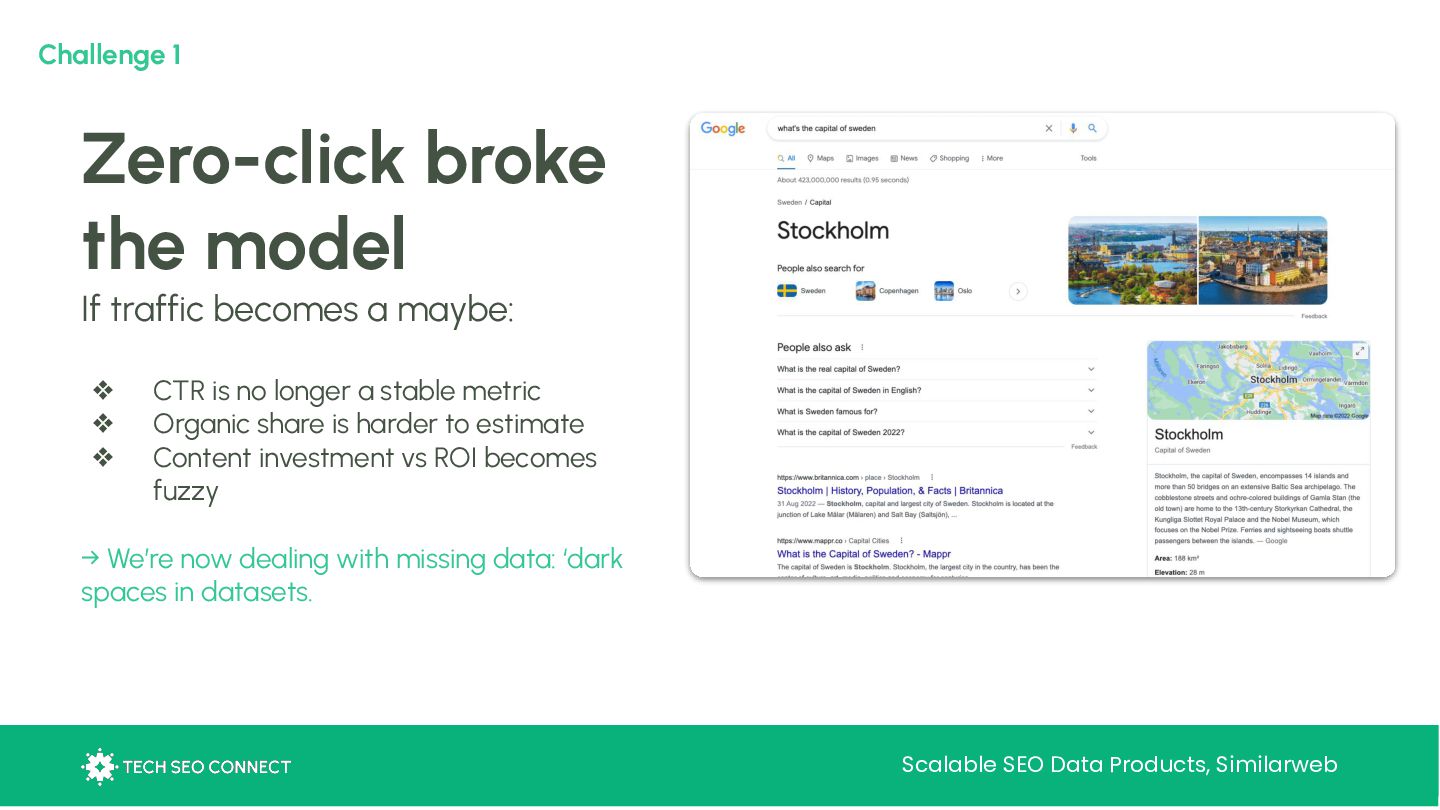 CTR is no longer a stable metric ❖ Organic share is harder to estimate ❖ Content investment vs ROI becomes fuzzy → We’re now dealing with missing data: ʻdark spaces in datasets. Scalable SEO Data Products, Similarweb Challenge 1