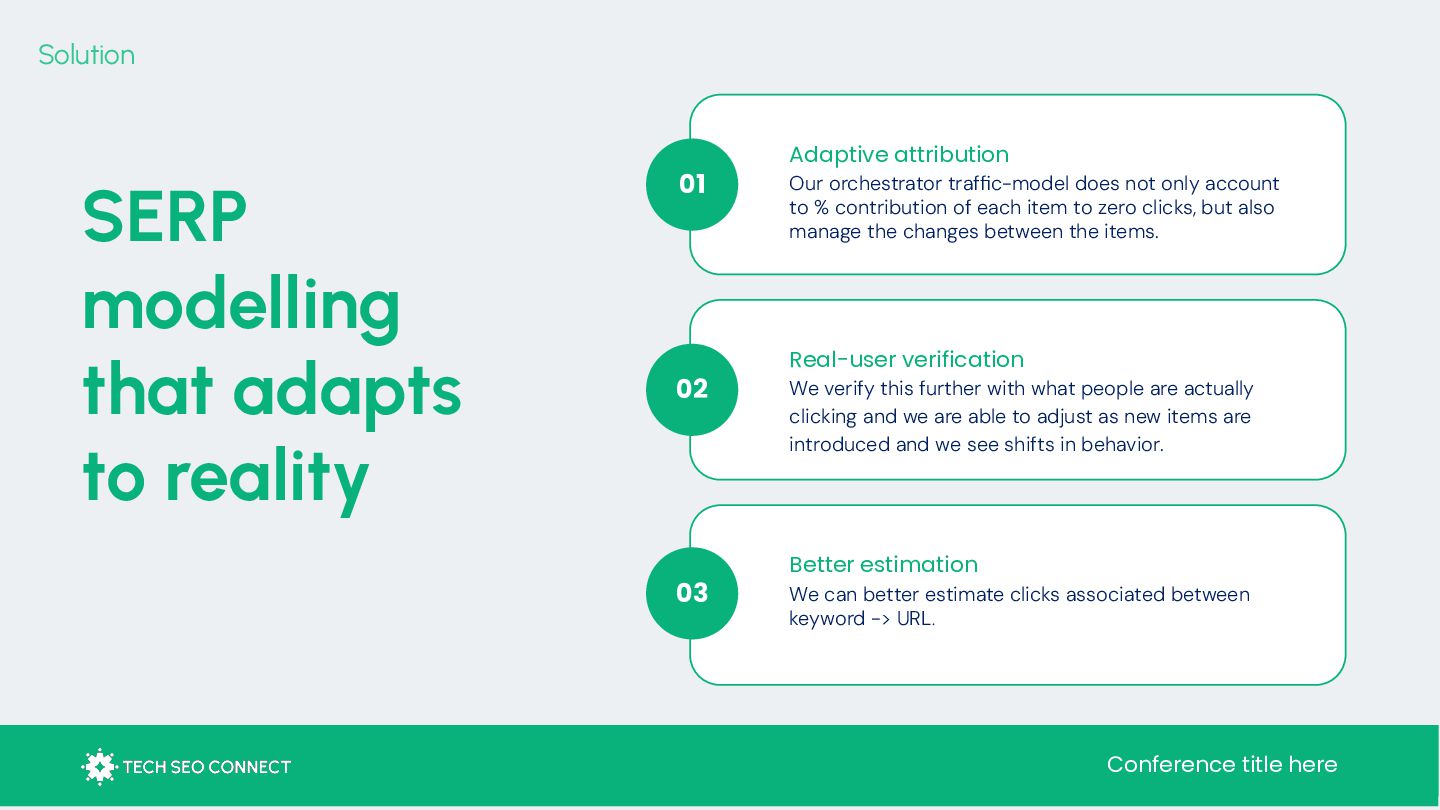 traffic-model does not only account to % contribution of each item to zero clicks, but also manage the changes between the items. Real-user verification We verify this further with what people are actually clicking and we are able to adjust as new items are introduced and we see shifts in behavior. Better estimation We can better estimate clicks associated between keyword -> URL. Conference title here 01 02 03 Solution