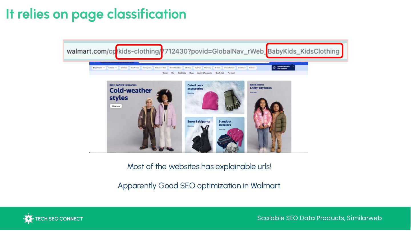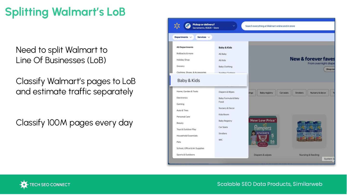 Walmart’s pages to LoB and estimate traffic separately Classify 100M pages every day Scalable SEO Data Products, Similarweb Splitting Walmart’s LoB