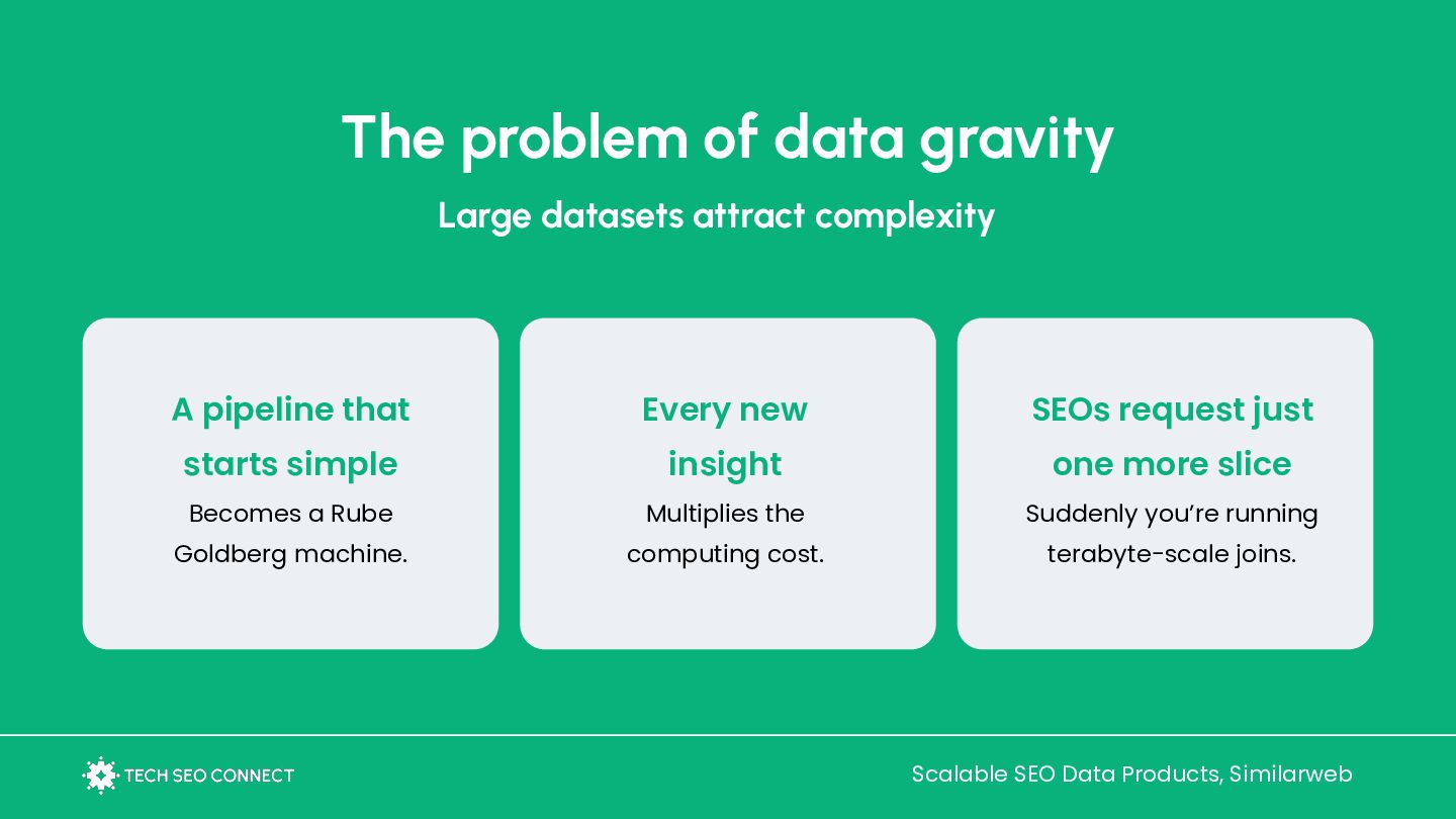 A pipeline that starts simple Becomes a Rube Goldberg machine. Large datasets attract complexity Every new insight Multiplies the computing cost. SEOs request just one more slice Suddenly you’re running terabyte-scale joins.