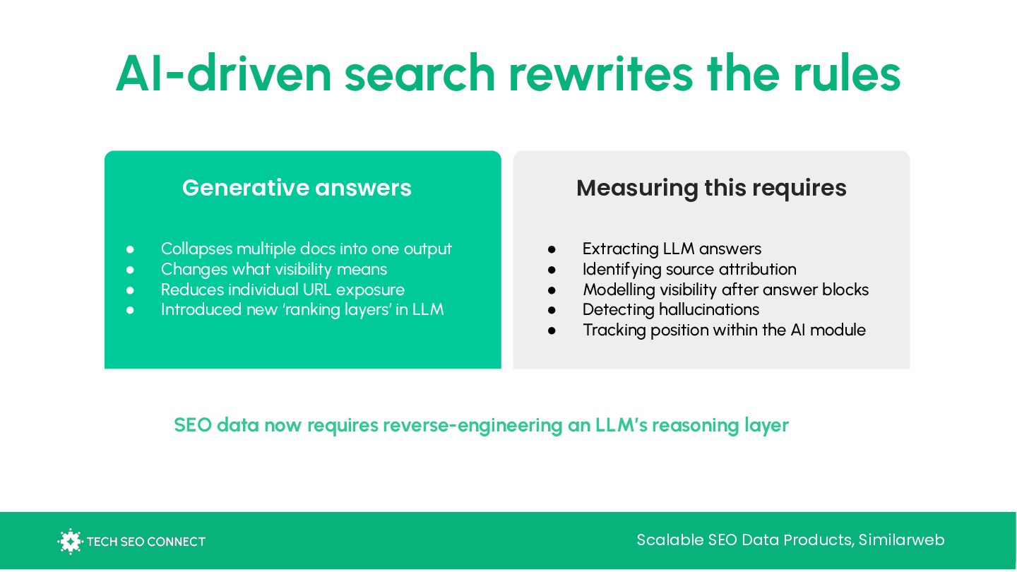 Generative answers Measuring this requires • Collapses multiple docs into one output • Changes what visibility means • Reduces individual URL exposure • Introduced new ʻranking layers’ in LLM • Extracting LLM answers • Identifying source attribution • Modelling visibility after answer blocks • Detecting hallucinations • Tracking position within the AI module SEO data now requires reverse-engineering an LLM’s reasoning layer