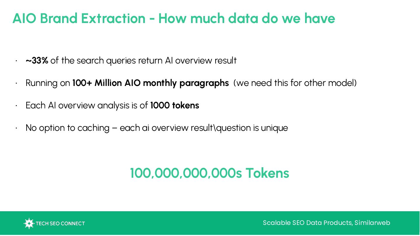 much data do we have 100,000,000,000s Tokens • ~33% of the search queries return AI overview result • Running on 100+ Million AIO monthly paragraphs (we need this for other model) • Each AI overview analysis is of 1000 tokens • No option to caching – each ai overview result\question is unique 100,000,000,000s Tokens