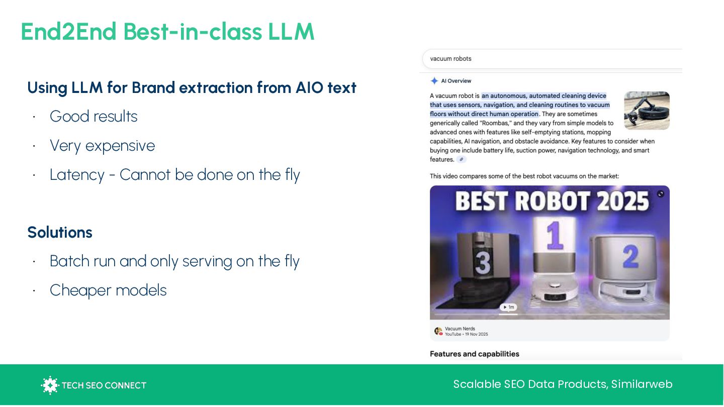 for Brand extraction from AIO text • Good results • Very expensive • Latency - Cannot be done on the fly Solutions • Batch run and only serving on the fly • Cheaper models