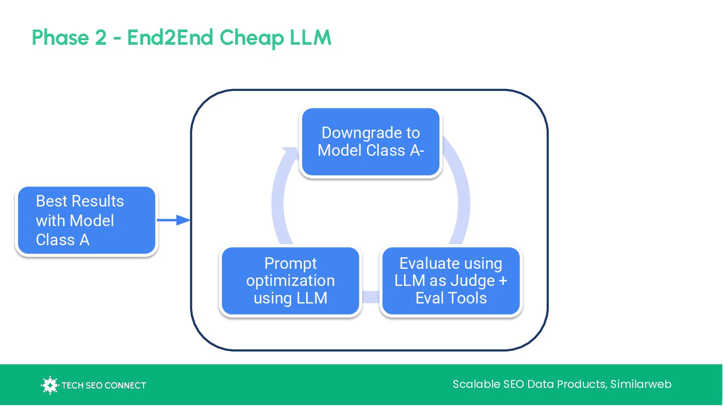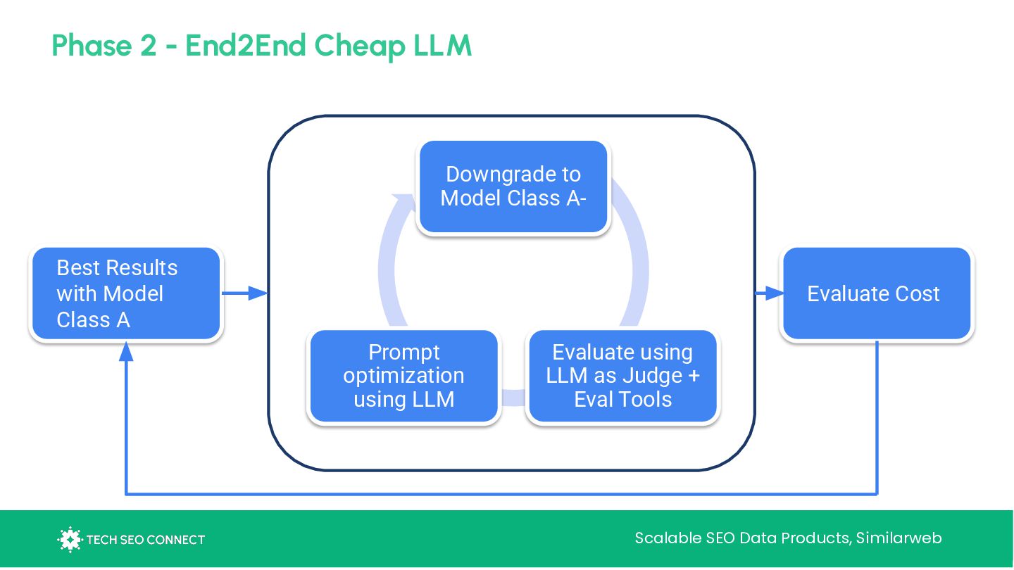 LLM Downgrade to Model Class A- Evaluate using LLM as Judge + Eval Tools Prompt optimization using LLM Best Results with Model Class A Evaluate Cost