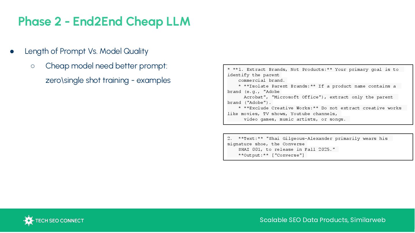 LLM • Length of Prompt Vs. Model Quality ◦ Cheap model need better prompt: zero\single shot training - examples 2. **Text:** "Shai Gilgeous-Alexander primarily wears his signature shoe, the Converse SHAI 001, to release in Fall 2025." **Output:** ["Converse"] * **1. Extract Brands, Not Products:** Your primary goal is to identify the parent commercial brand. * **Isolate Parent Brands:** If a product name contains a brand (e.g., "Adobe Acrobat", "Microsoft Office"), extract only the parent brand ("Adobe"). * **Exclude Creative Works:** Do not extract creative works like movies, TV shows, Youtube channels, video games, music artists, or songs.