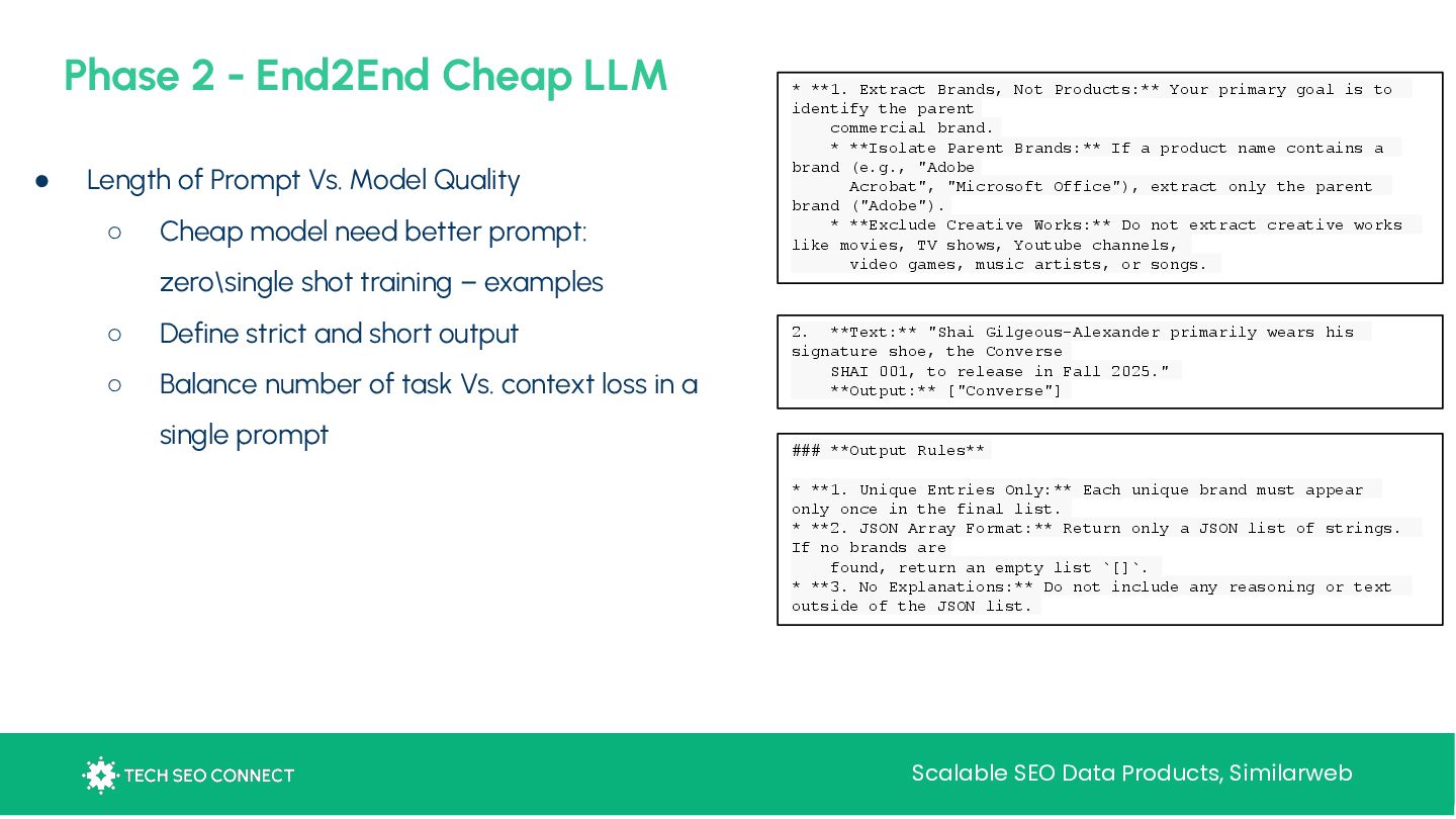 LLM • Length of Prompt Vs. Model Quality ◦ Cheap model need better prompt: zero\single shot training – examples ◦ Define strict and short output ◦ Balance number of task Vs. context loss in a single prompt 2. **Text:** "Shai Gilgeous-Alexander primarily wears his signature shoe, the Converse SHAI 001, to release in Fall 2025." **Output:** ["Converse"] * **1. Extract Brands, Not Products:** Your primary goal is to identify the parent commercial brand. * **Isolate Parent Brands:** If a product name contains a brand (e.g., "Adobe Acrobat", "Microsoft Office"), extract only the parent brand ("Adobe"). * **Exclude Creative Works:** Do not extract creative works like movies, TV shows, Youtube channels, video games, music artists, or songs. ### **Output Rules** * **1. Unique Entries Only:** Each unique brand must appear only once in the final list. * **2. JSON Array Format:** Return only a JSON list of strings. If no brands are found, return an empty list `[]`. * **3. No Explanations:** Do not include any reasoning or text outside of the JSON list.