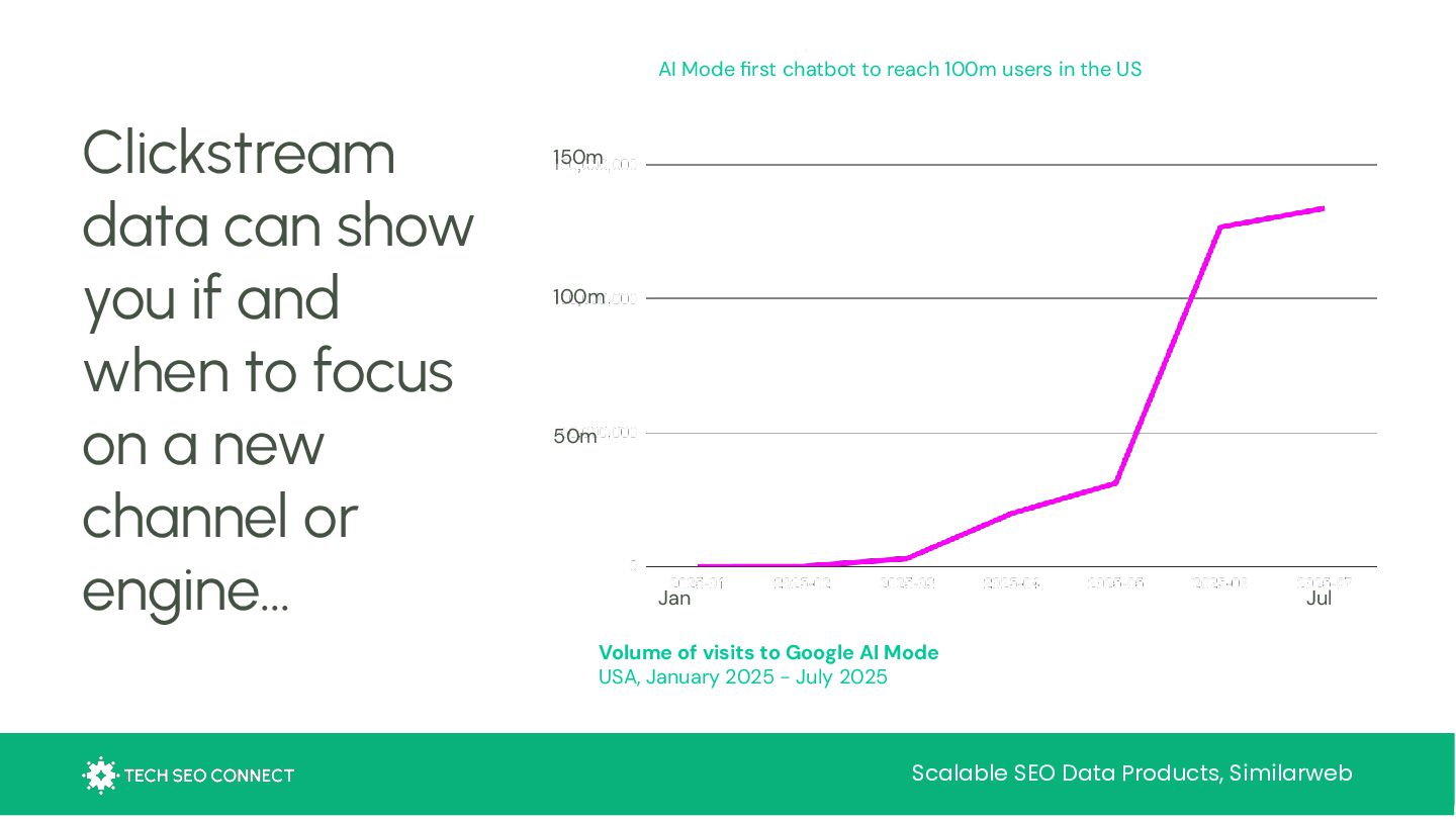 on a new channel or engine… Scalable SEO Data Products, Similarweb Volume of visits to Google AI Mode USA, January 2025 - July 2025 AI Mode first chatbot to reach 100m users in the US 50m 100m 150m Jan Jul