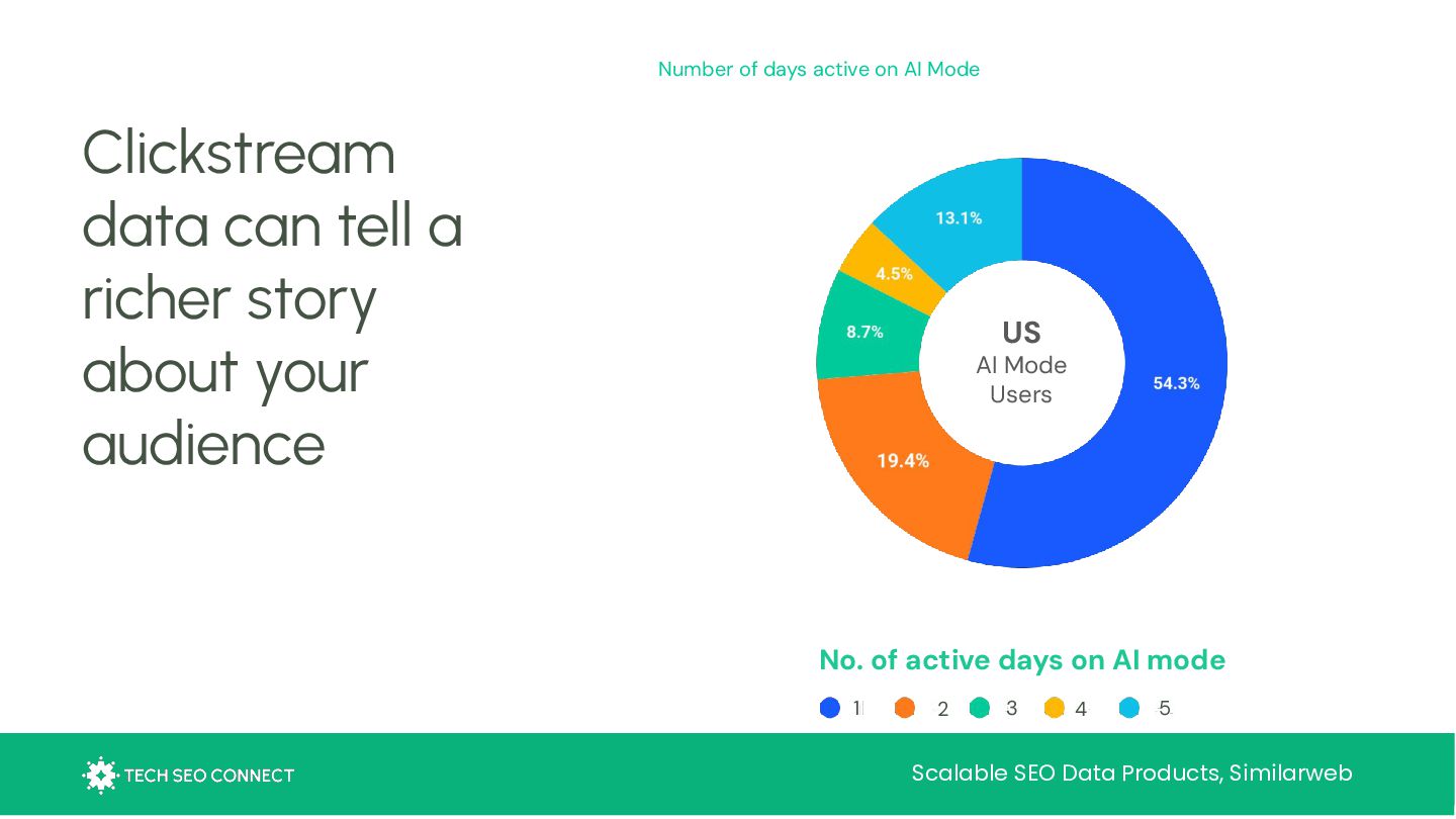 Scalable SEO Data Products, Similarweb Number of days active on AI Mode US AI Mode Users No. of active days on AI mode 1 2 3 4 5