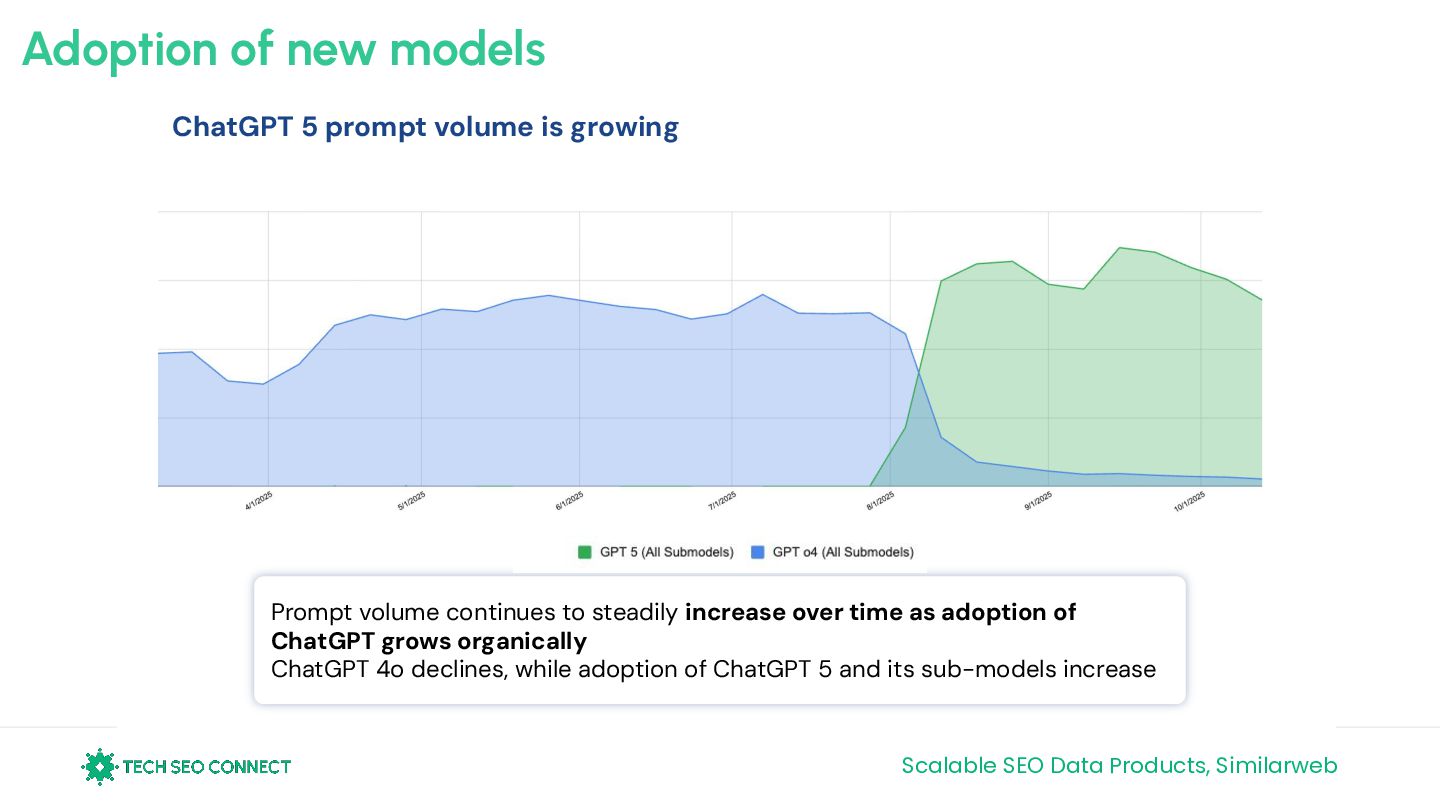 volume continues to steadily increase over time as adoption of ChatGPT grows organically ChatGPT 4o declines, while adoption of ChatGPT 5 and its sub-models increase ChatGPT 5 prompt volume is growing
