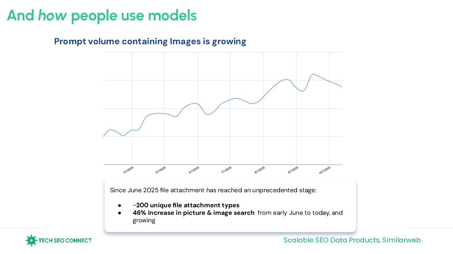 Since June 2025 file attachment has reached an unprecedented stage: • ~200 unique file attachment types • 46% increase in picture & image search from early June to today, and growing Prompt volume containing Images is growing