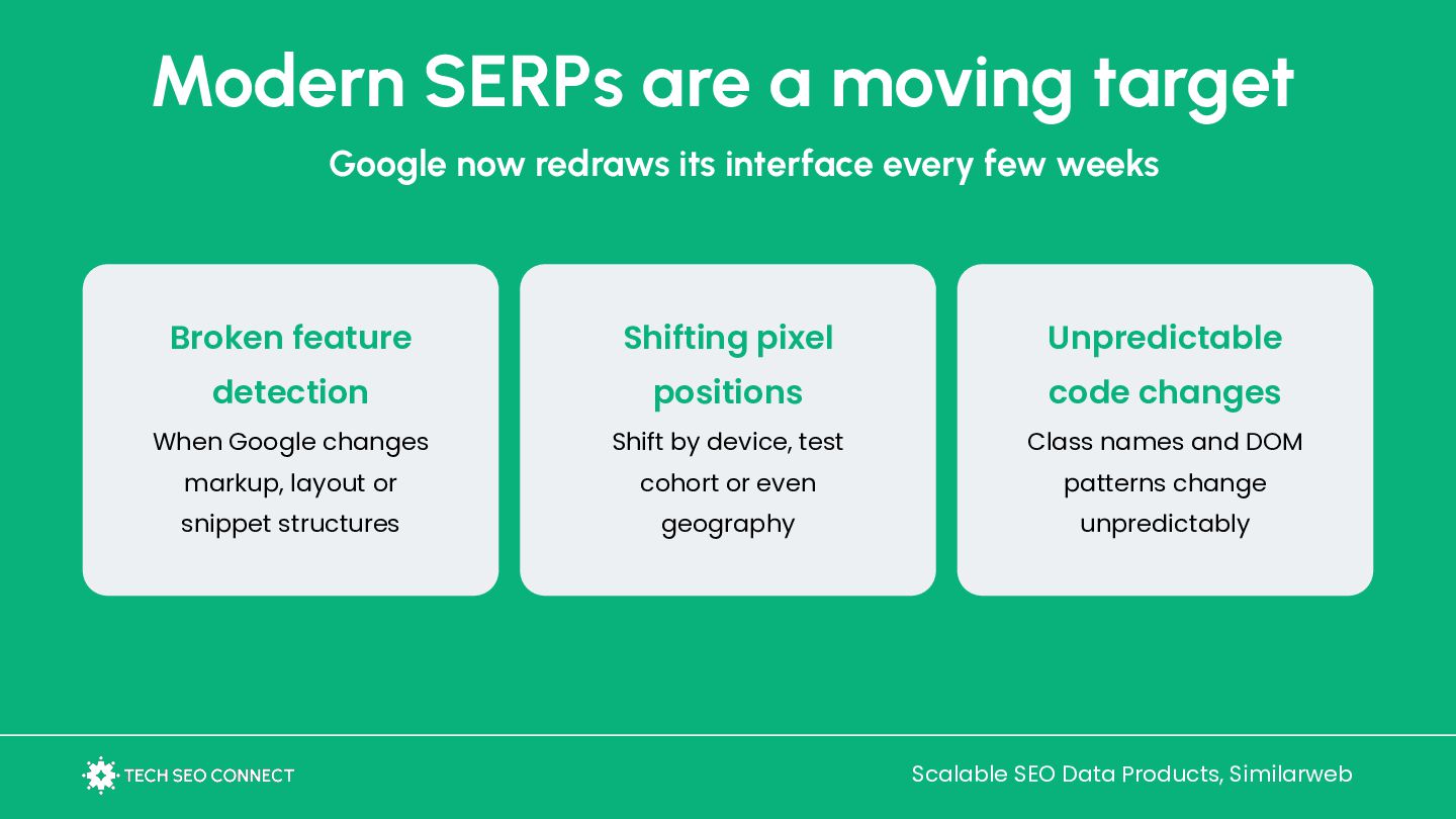 interface every few weeks Scalable SEO Data Products, Similarweb Shifting pixel positions Shift by device, test cohort or even geography Broken feature detection When Google changes markup, layout or snippet structures Unpredictable code changes Class names and DOM patterns change unpredictably