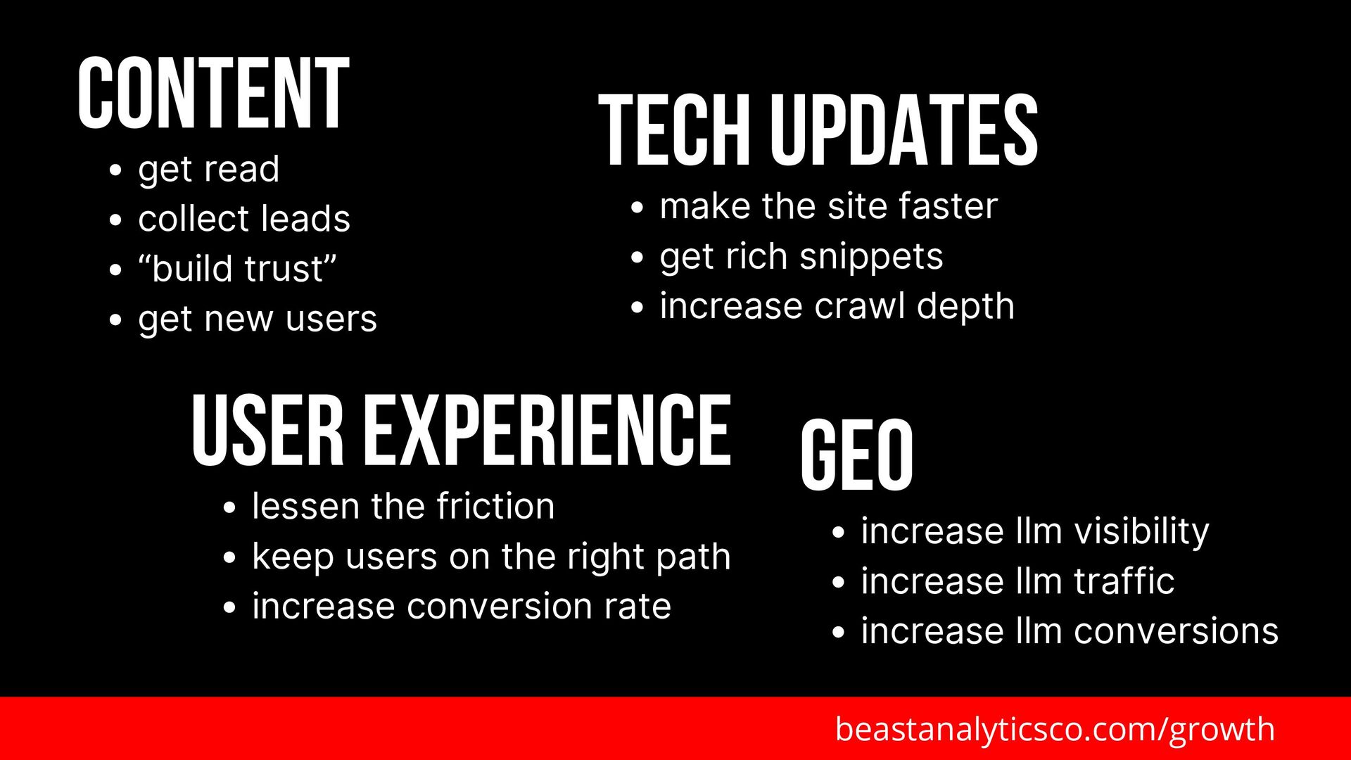 make the site faster get rich snippets increase crawl depth tech updates lessen the friction keep users on the right path increase conversion rate User experience increase llm visibility increase llm traffic increase llm conversions GEO beastanalyticsco.com/growth