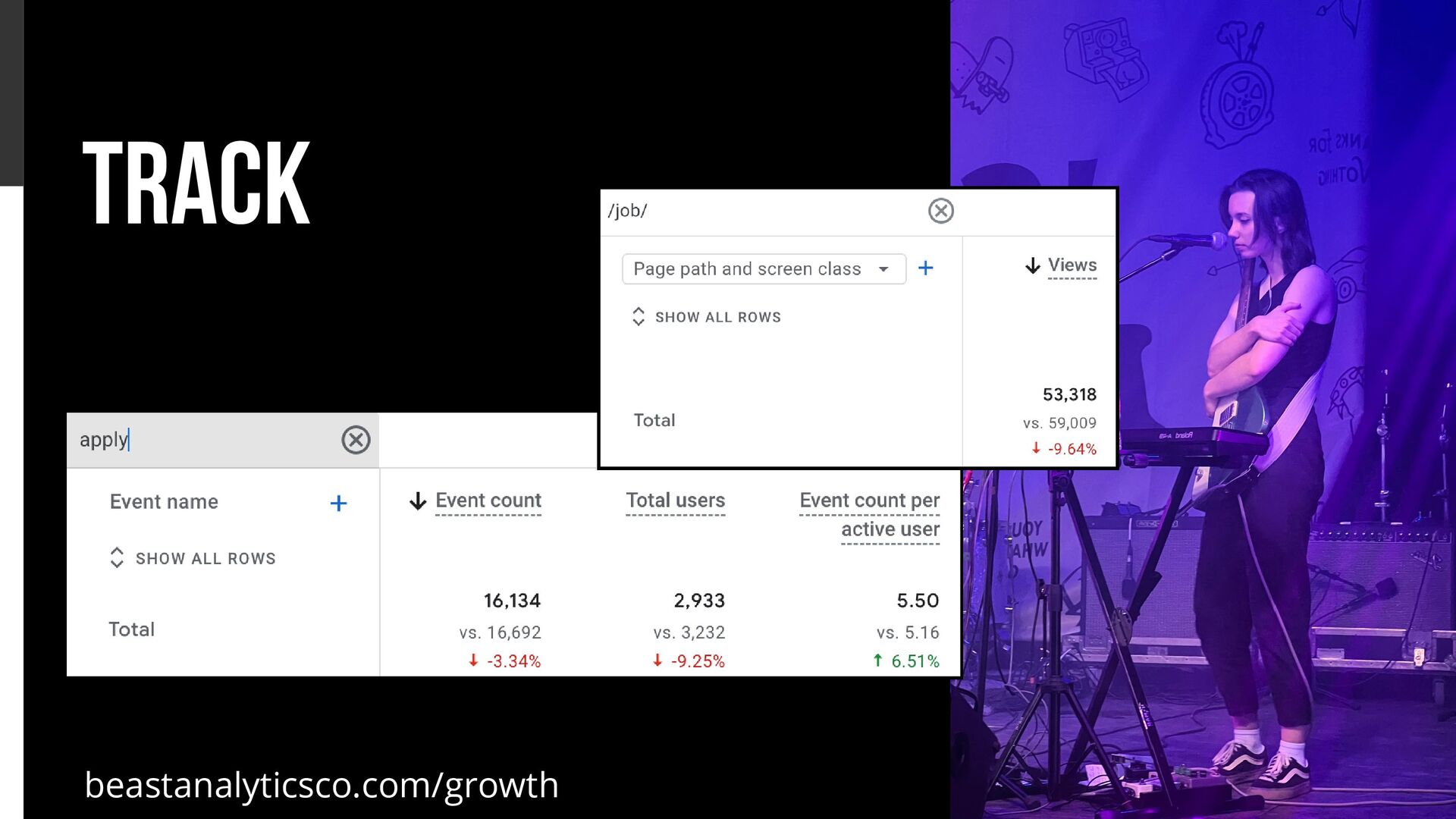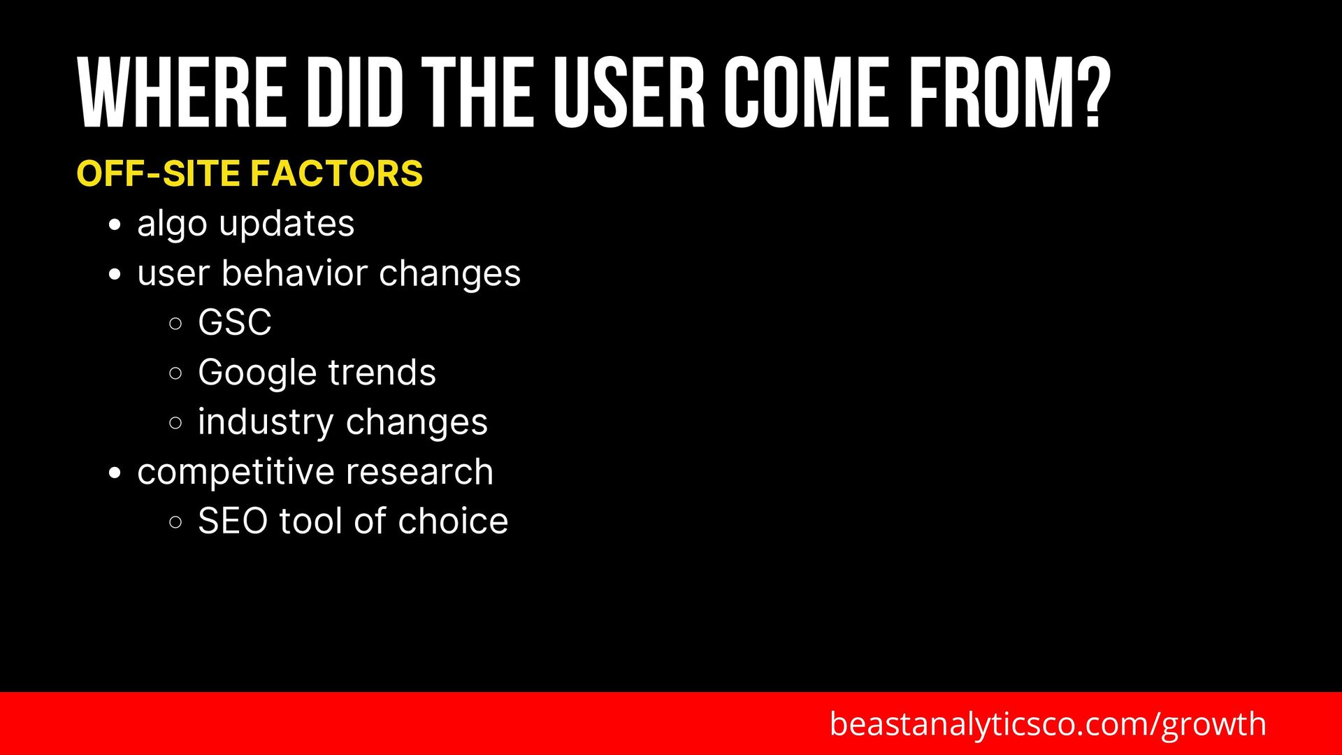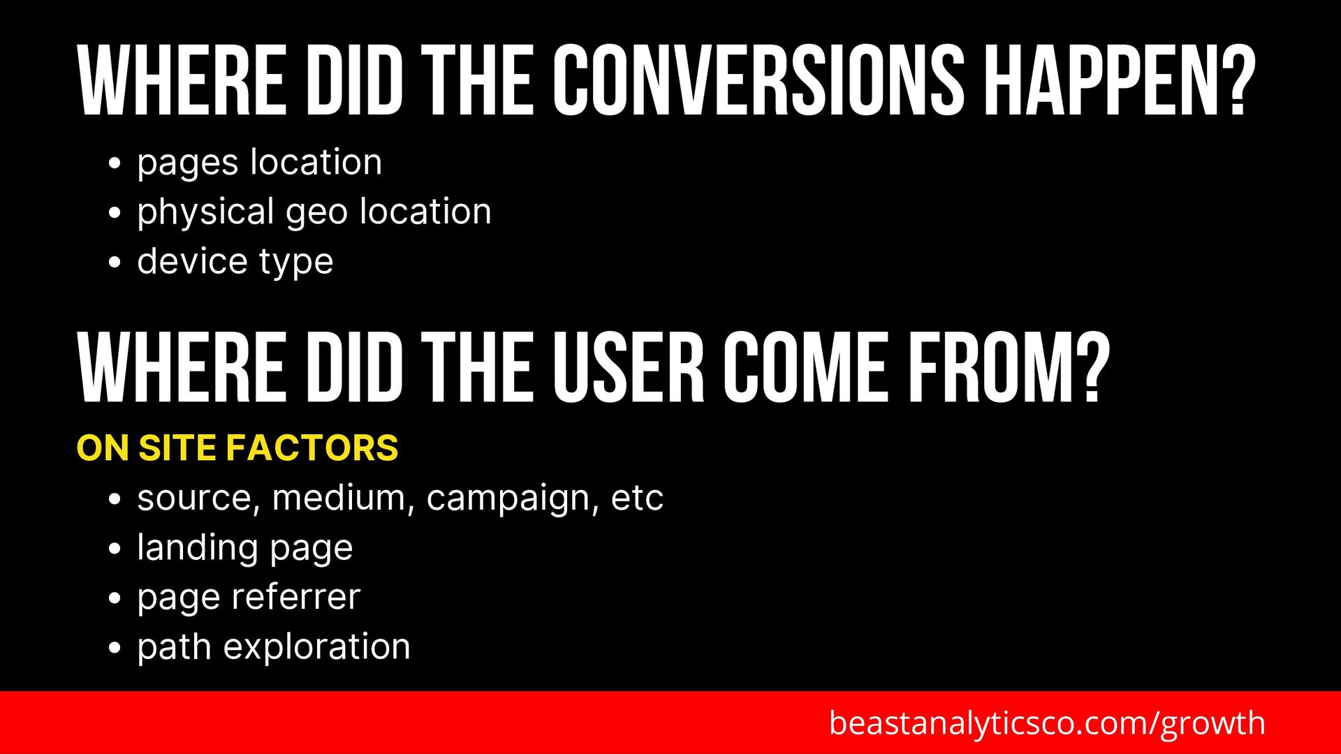 conversions happen? ON SITE FACTORS source, medium, campaign, etc landing page page referrer path exploration where did the user come from? beastanalyticsco.com/growth