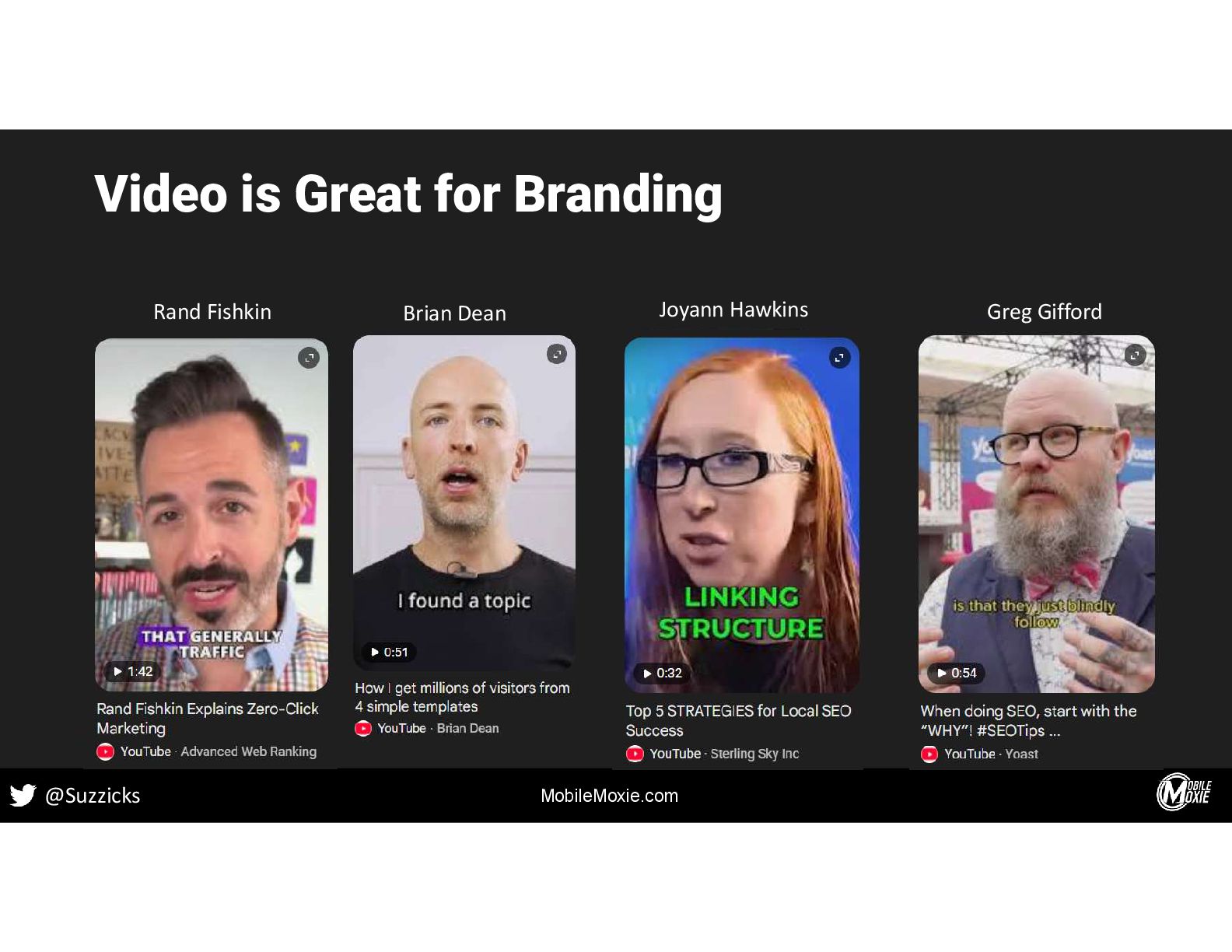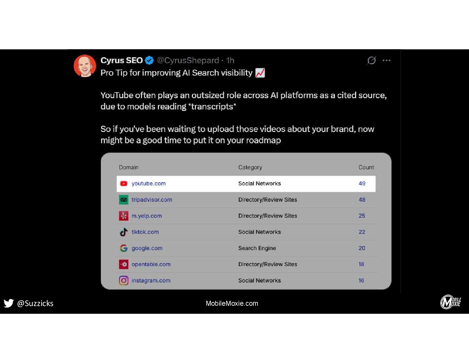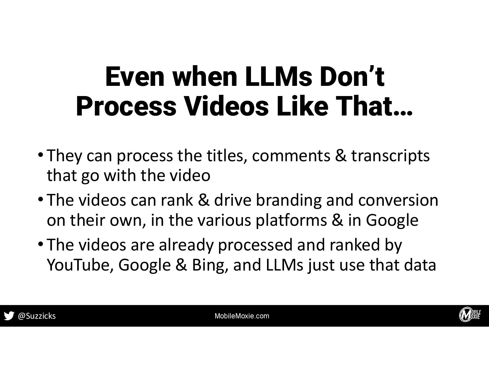 can process the titles, comments & transcripts that go with the video • The videos can rank & drive branding and conversion on their own, in the various platforms & in Google • The videos are already processed and ranked by YouTube, Google & Bing, and LLMs just use that data MobileMoxie.com @Suzzicks