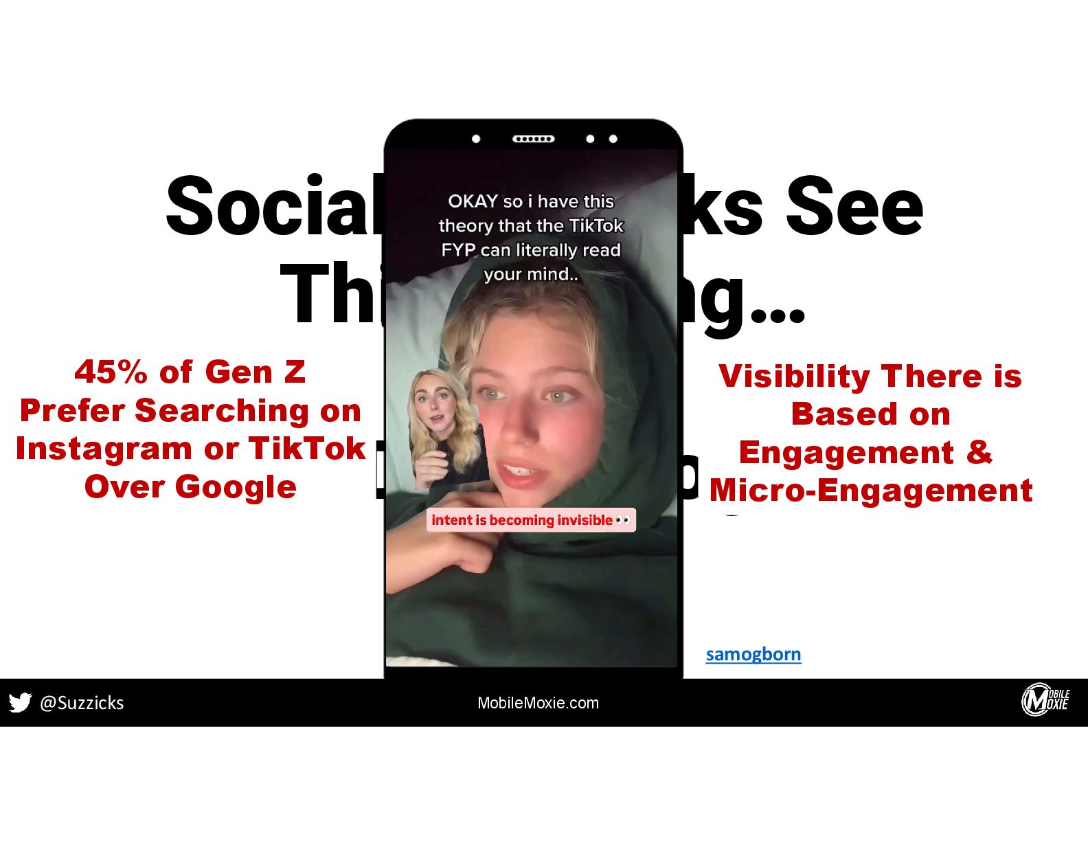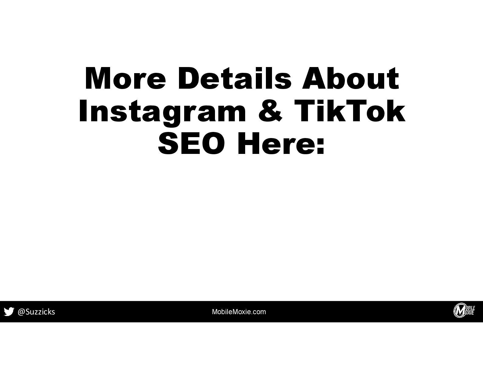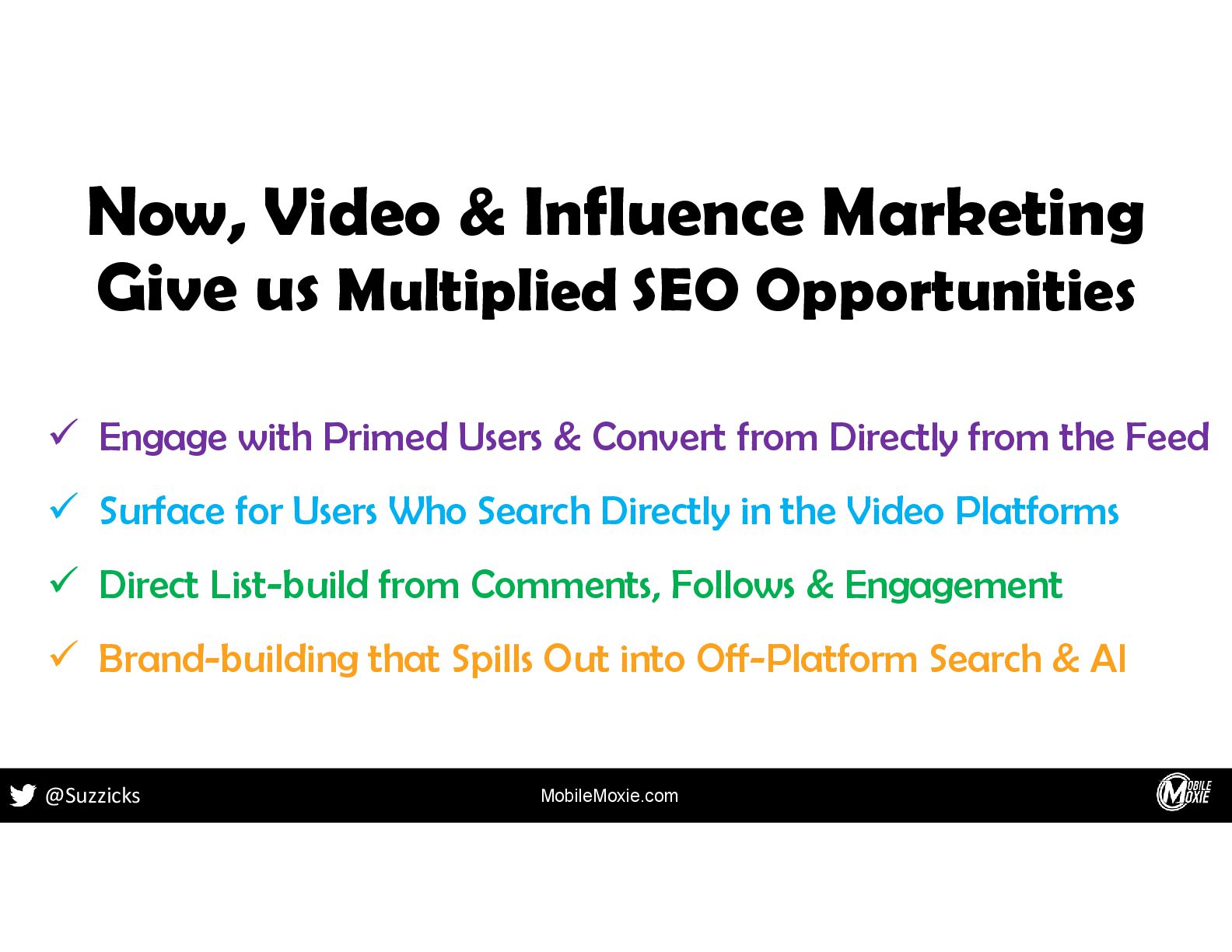 MobileMoxie.com @Suzzicks  Engage with Primed Users & Convert from Directly from the Feed  Surface for Users Who Search Directly in the Video Platforms  Direct List-build from Comments, Follows & Engagement  Brand-building that Spills Out into Off-Platform Search & AI