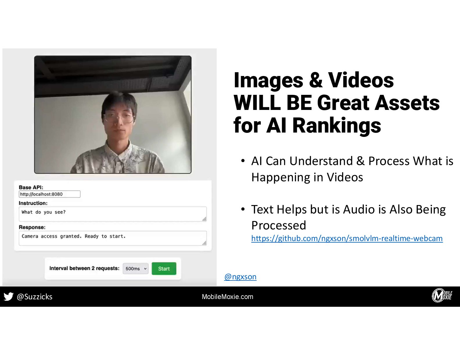 Happening in Videos • Text Helps but is Audio is Also Being Processed https://github.com/ngxson/smolvlm-realtime-webcam @ngxson Images & Videos WILL BE Great Assets for AI Rankings