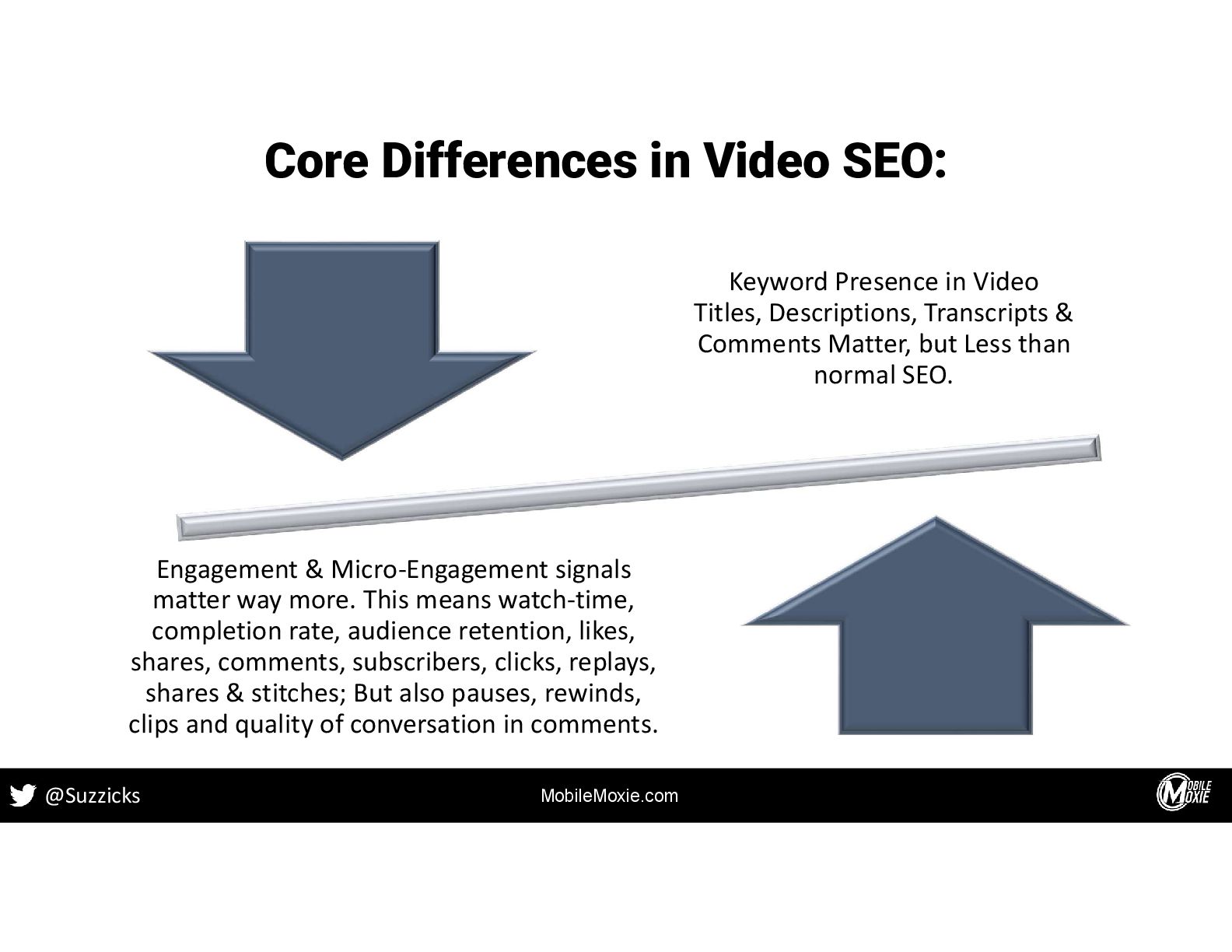 Comments Matter, but Less than normal SEO. Engagement & Micro-Engagement signals matter way more. This means watch-time, completion rate, audience retention, likes, shares, comments, subscribers, clicks, replays, shares & stitches; But also pauses, rewinds, clips and quality of conversation in comments. Core Differences in Video SEO: