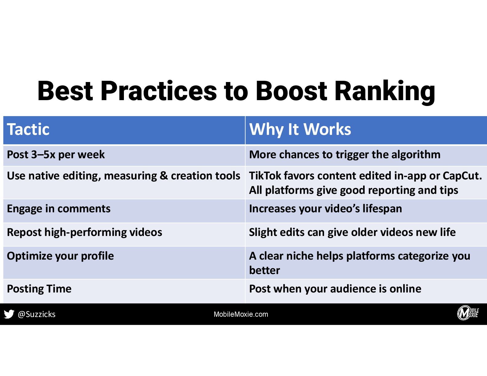 chances to trigger the algorithm Post 3–5x per week TikTok favors content edited in-app or CapCut. All platforms give good reporting and tips Use native editing, measuring & creation tools Increases your video’s lifespan Engage in comments Slight edits can give older videos new life Repost high-performing videos A clear niche helps platforms categorize you better Optimize your profile Post when your audience is online Posting Time MobileMoxie.com @Suzzicks