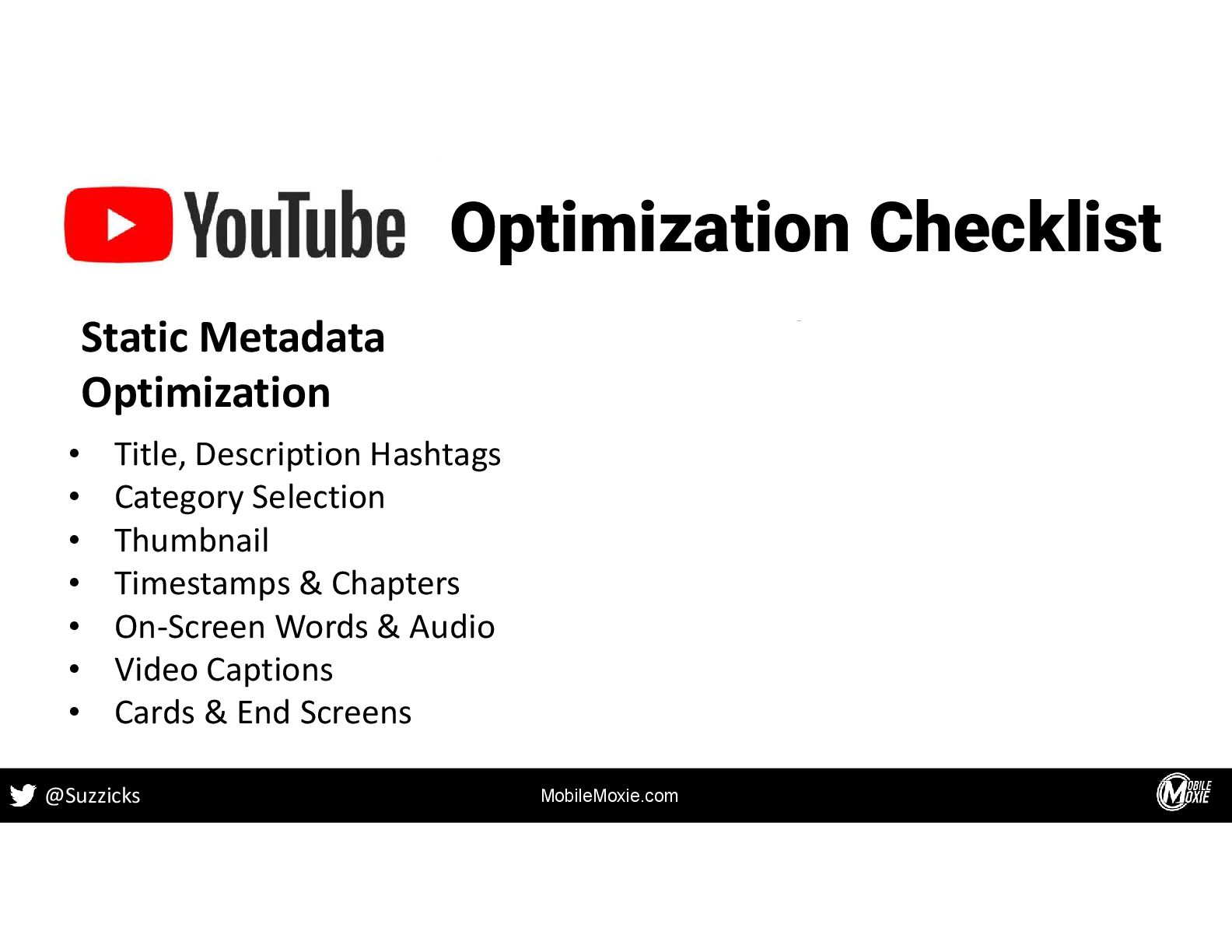 13. MobileMoxie.com @Suzzicks Optimization Checklist Static Metadata Optimization Dynamic Optimization •