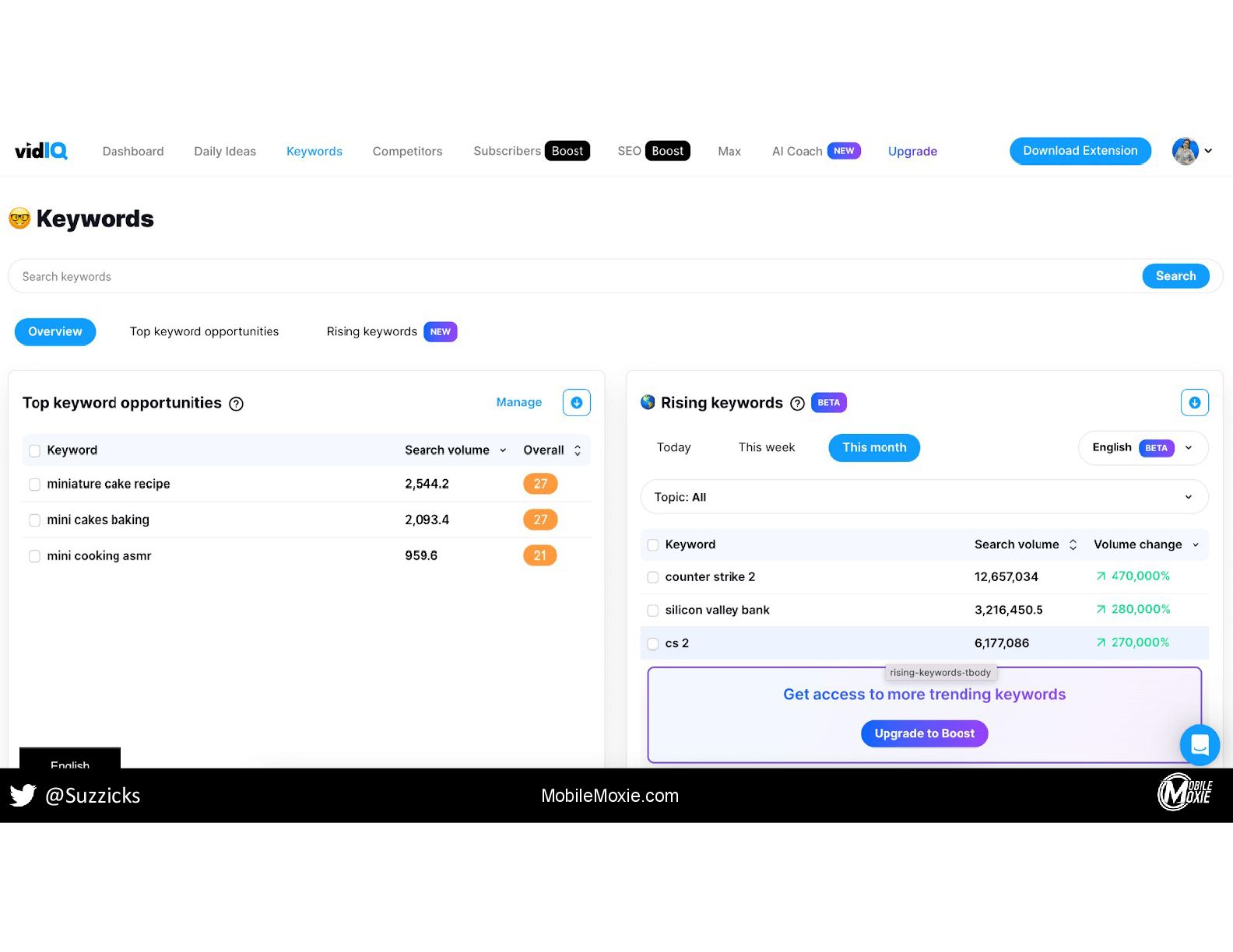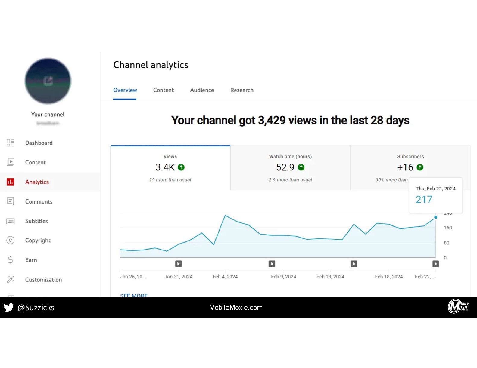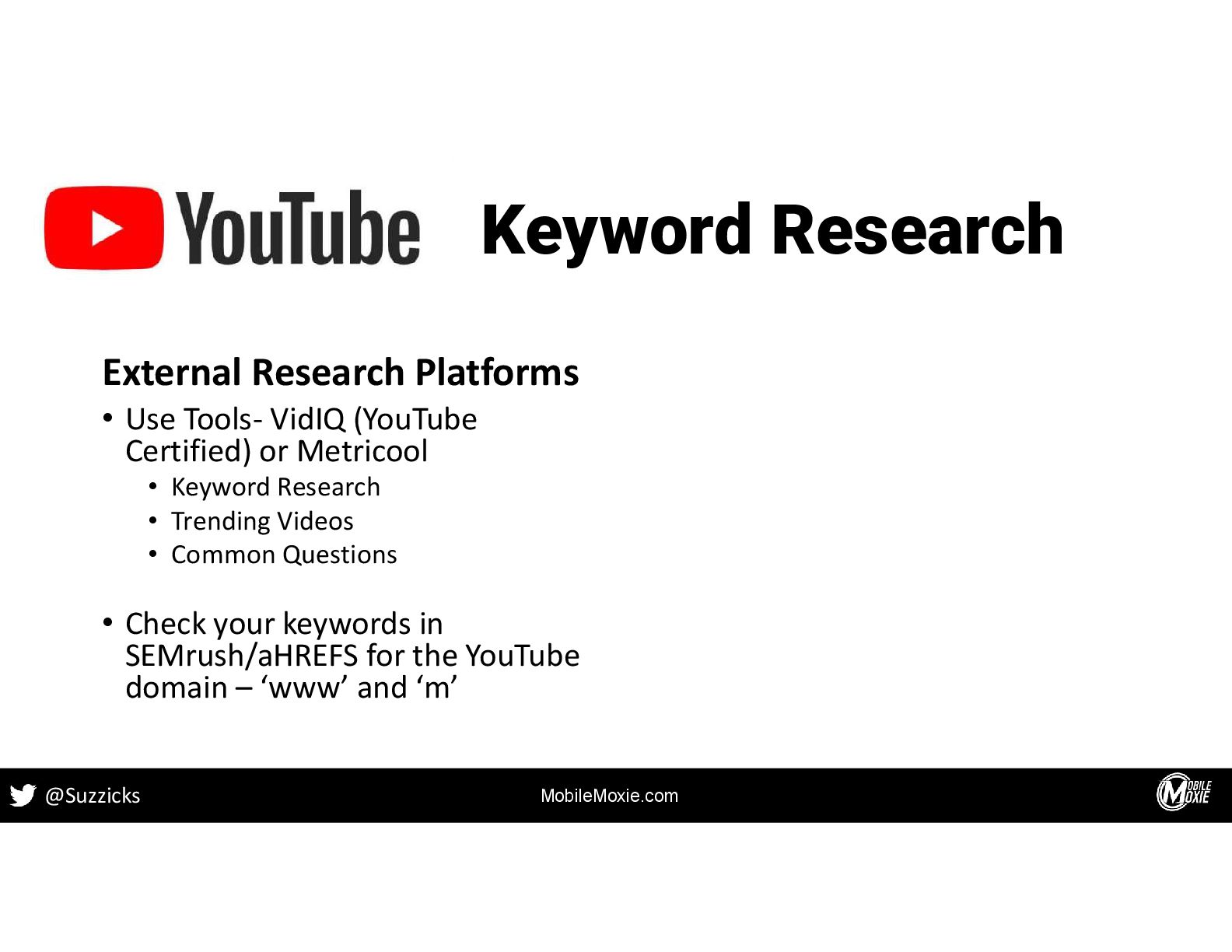 on New & Repeat Viewers – Ignore Casual • Find Top Channel in Your Niche & Sort Videos by Views • Mimic Content & Keyword Targets • YouTube Auto-Complete – Ordered by Search Volume (Next Slide) External Research Platforms • Use Tools- VidIQ (YouTube Certified) or Metricool • Keyword Research • Trending Videos • Common Questions • Check your keywords in SEMrush/aHREFS for the YouTube domain – ‘www’ and ‘m’ MobileMoxie.com @Suzzicks