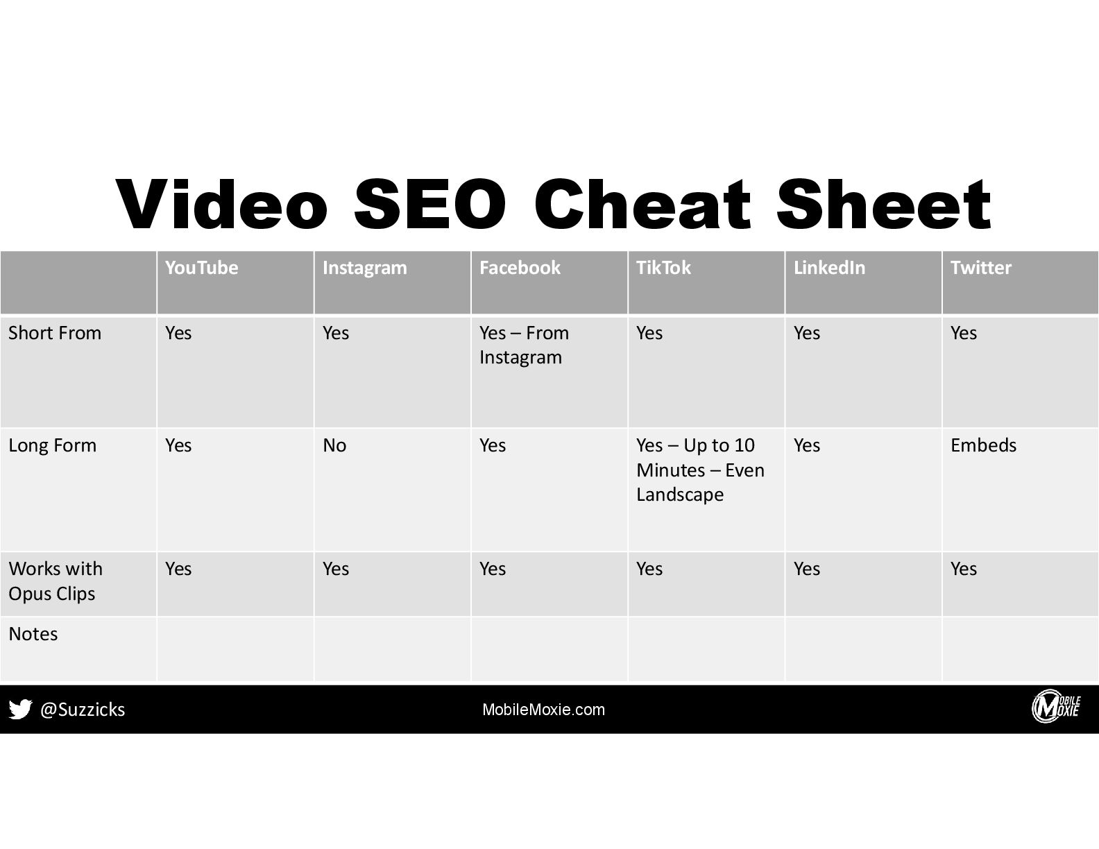Yes Yes – From Instagram Yes Yes Short From Embeds Yes Yes – Up to 10 Minutes – Even Landscape Yes No Yes Long Form Yes Yes Yes Yes Yes Yes Works with Opus Clips Notes Video SEO Cheat Sheet