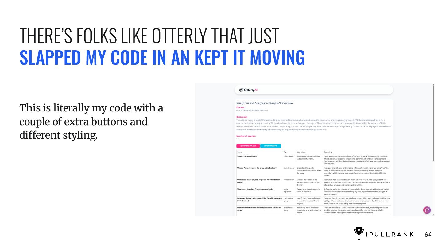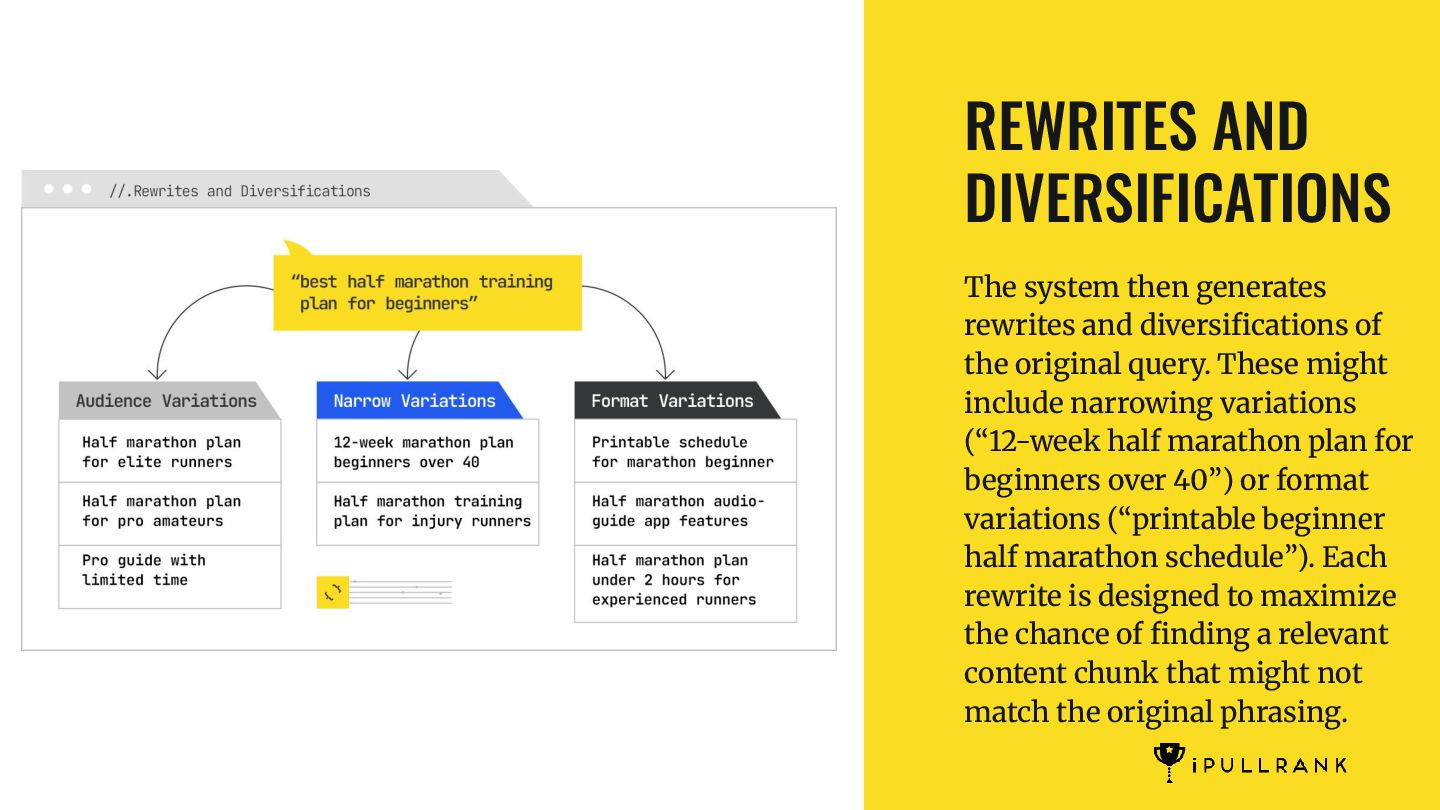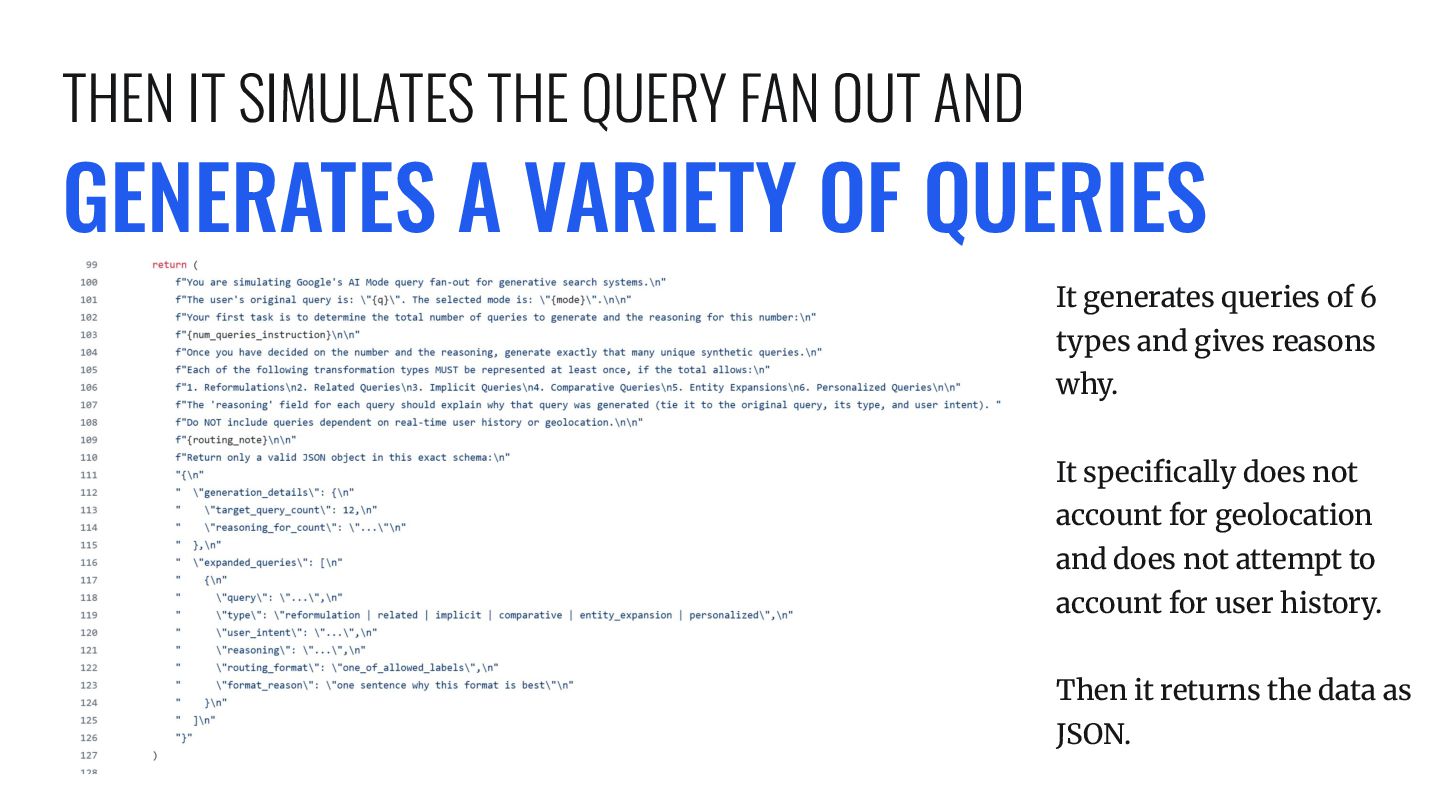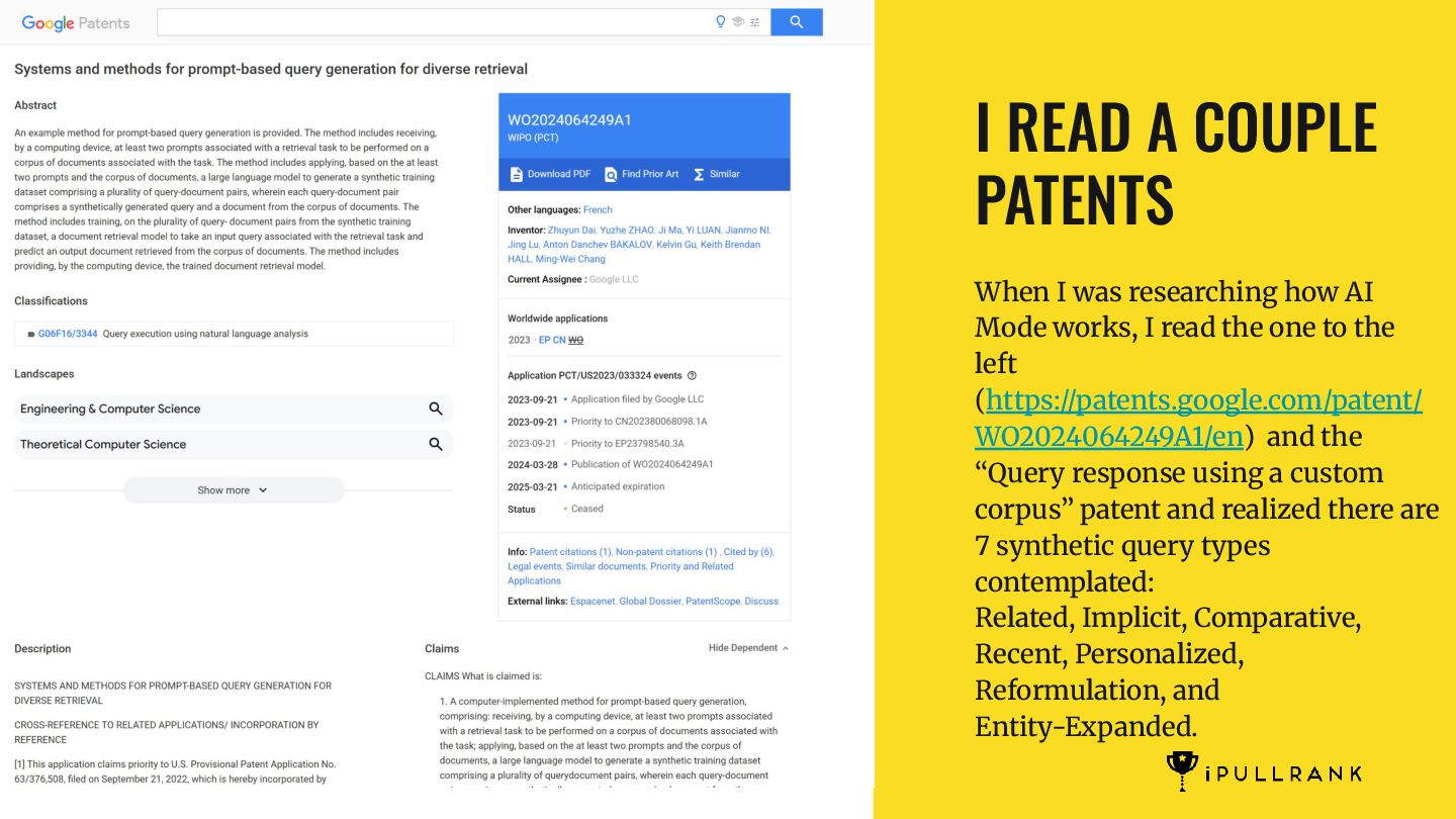 AI Mode works, I read the one to the left (https://patents.google.com/patent/ WO2024064249A1/en) and the “Query response using a custom corpus” patent and realized there are 7 synthetic query types contemplated: Related, Implicit, Comparative, Recent, Personalized, Reformulation, and Entity-Expanded.