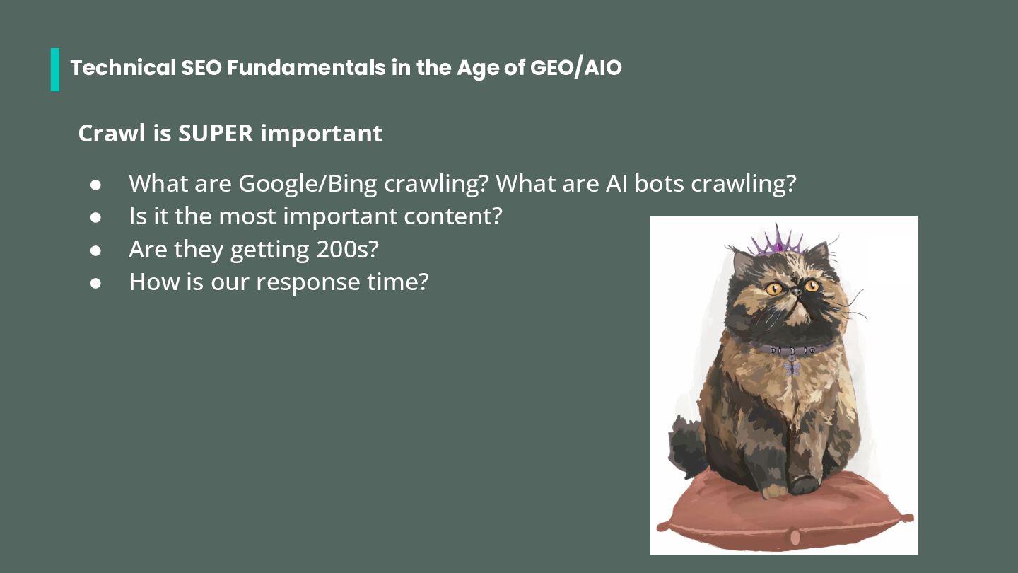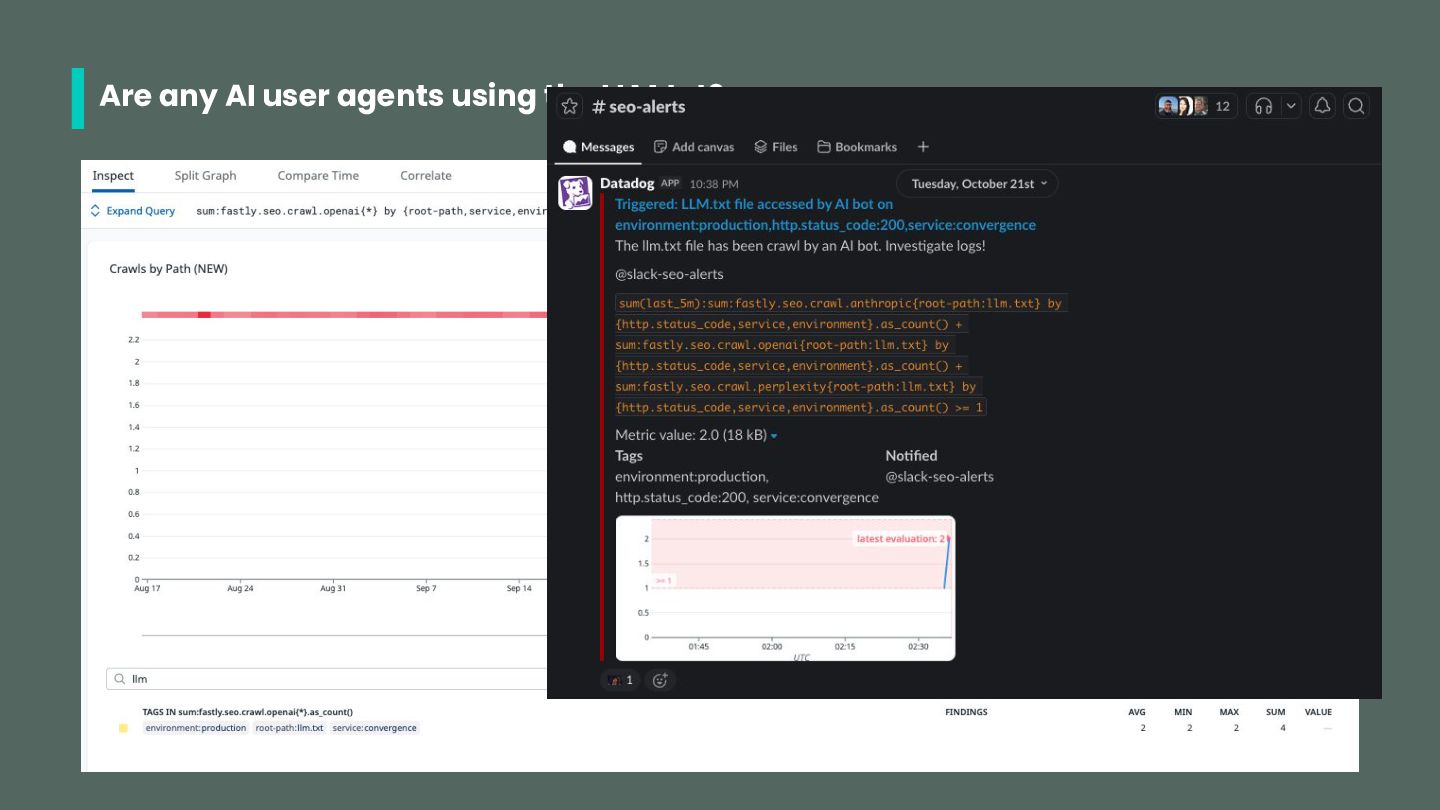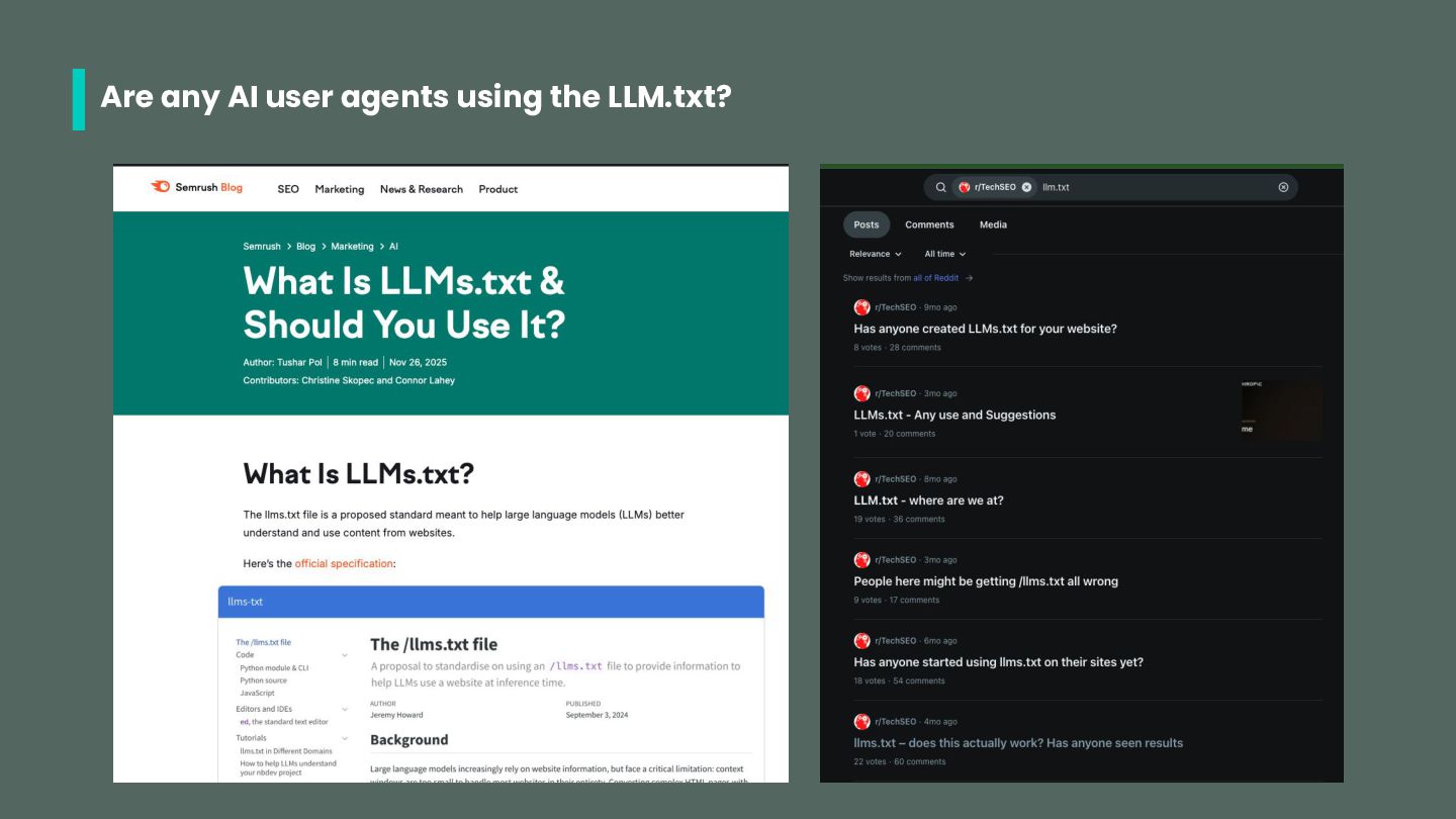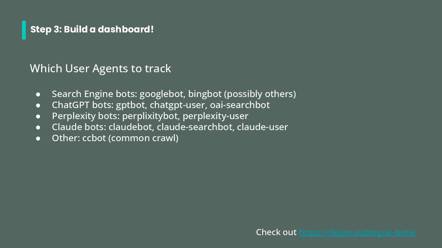 • Search Engine bots: googlebot, bingbot (possibly others) • ChatGPT bots: gptbot, chatgpt-user, oai-searchbot • Perplexity bots: perplixitybot, perplexity-user • Claude bots: claudebot, claude-searchbot, claude-user • Other: ccbot (common crawl) Check out https://dejan.ai/blog/ai-bots/