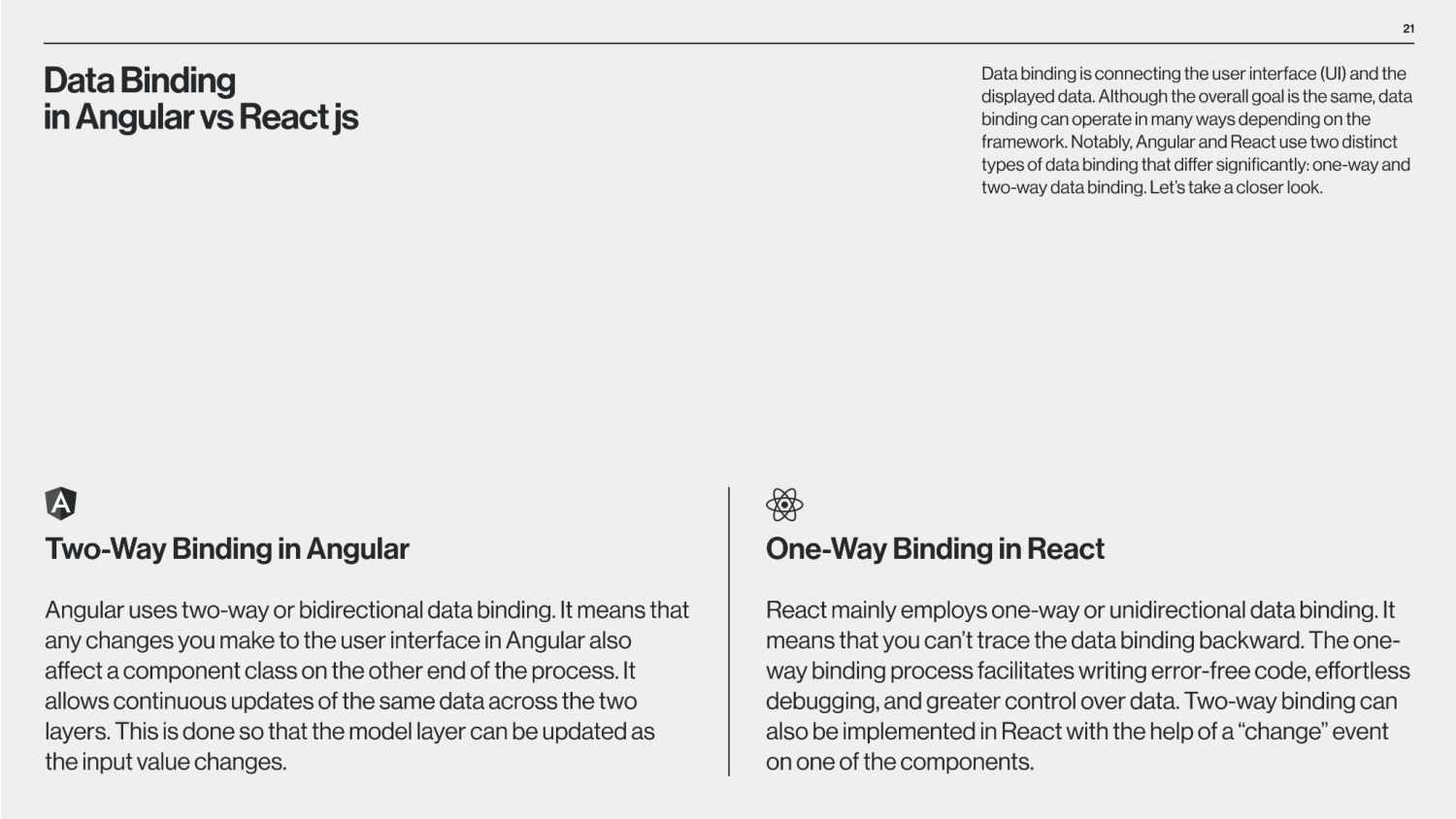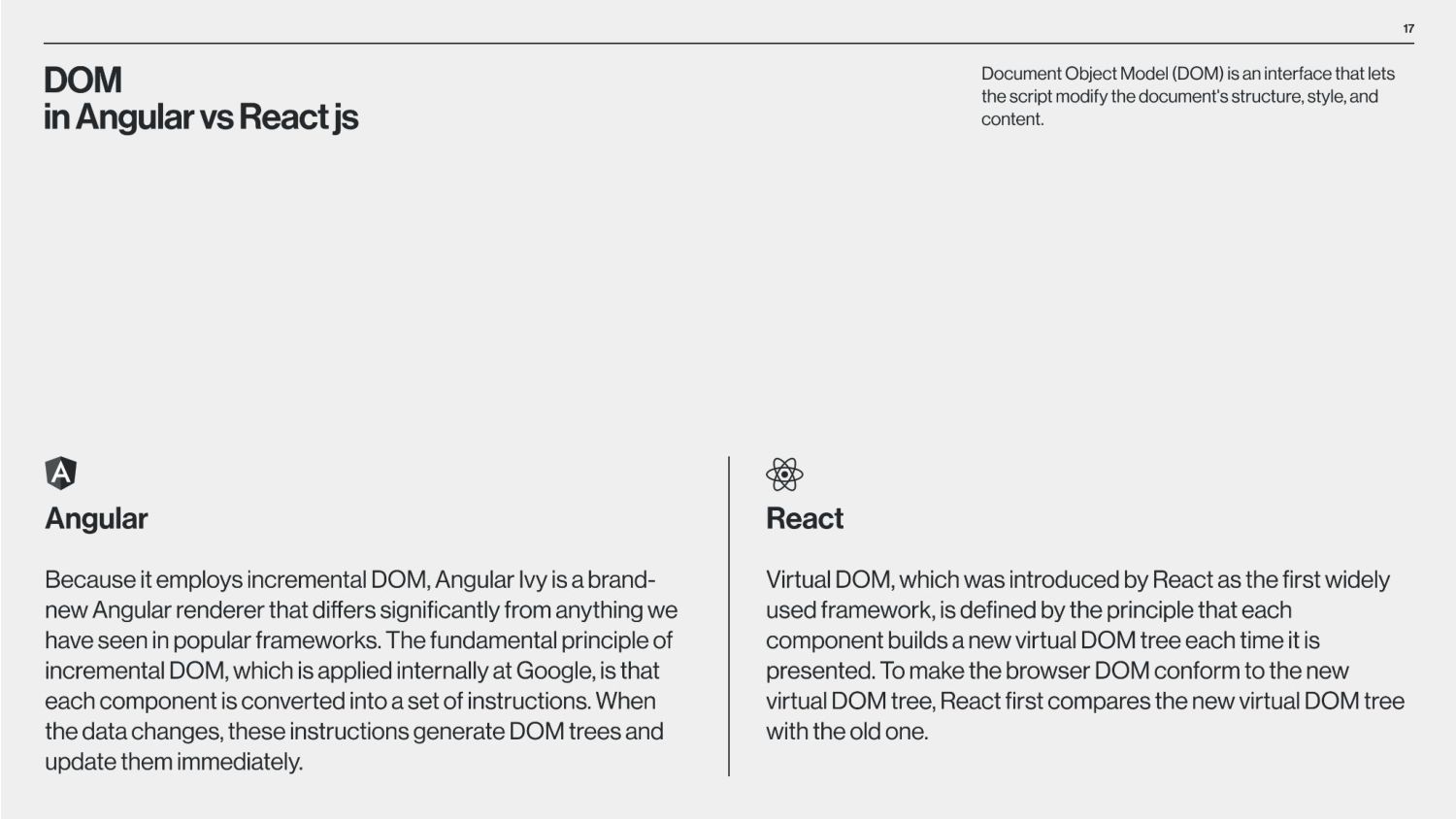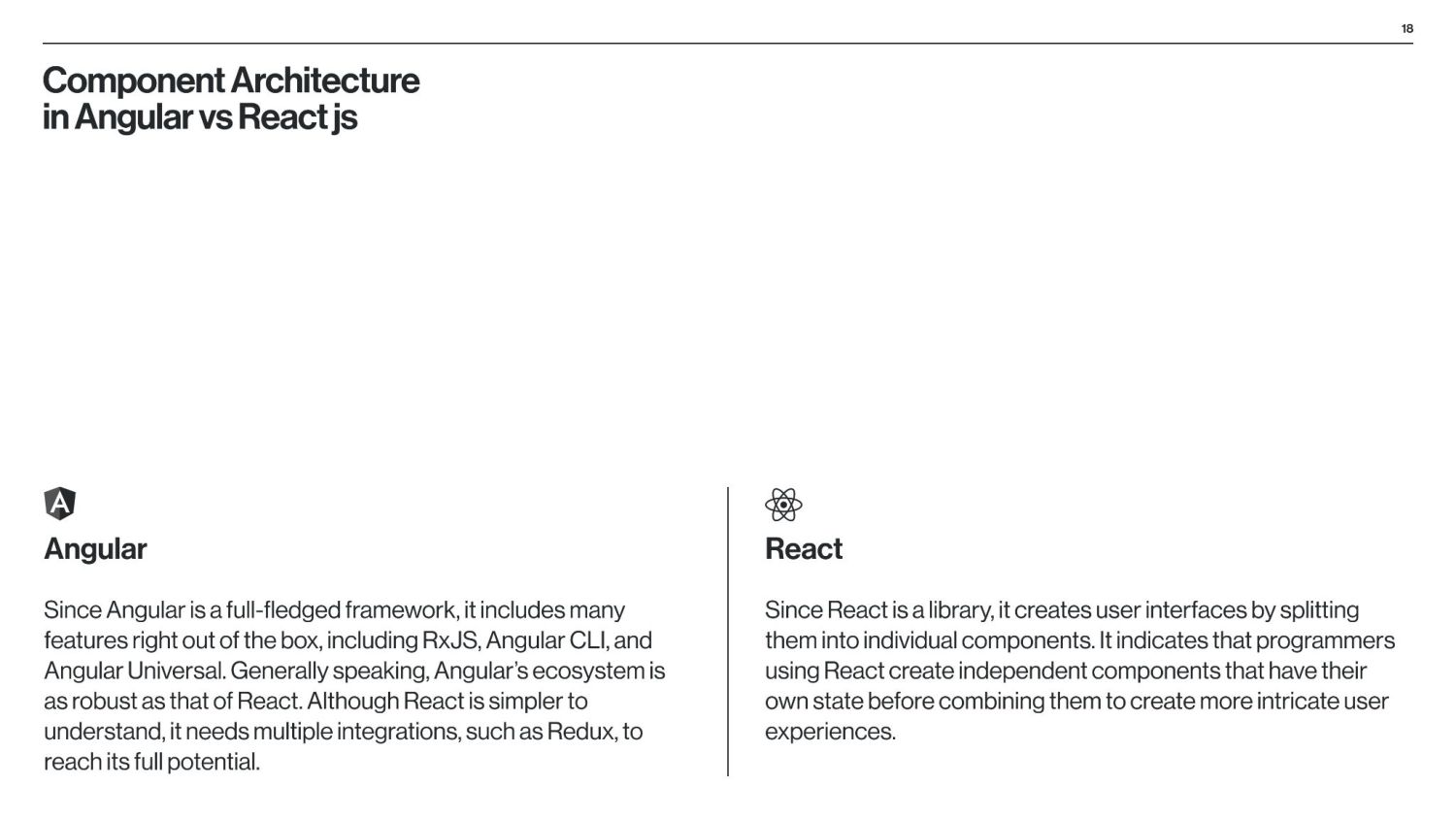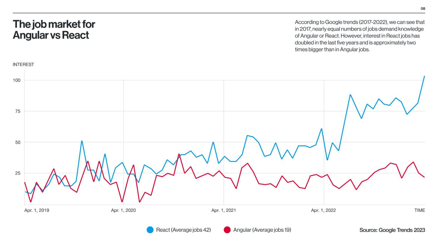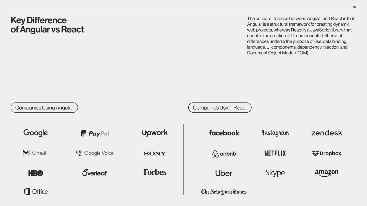 between Angular and React is that Angular is a structural framework for creating dynamic web projects, whereas React is a JavaScript library that enables the creation of UI components. Other vital differences underlie the purpose of use, data binding, language, UI components, dependency injection, and Document Object Model (DOM). React is used by numerous social media platforms, including Facebook, Instagram, and Skype. Uber, Airbnb, Netflix, The New York Times, Dropbox, Zendesk, and Amazon are additional companies that have created apps utilizing React. Companies Using React Companies Using Angular Angular is used by Google, Microsoft Office Home, Upwork, Sony, and PayPal. Forbes, HBO, and Overleaf are examples of well-known applications created with Angular. The framework is also used by many Google applications, including Gmail and Google Voice. The job market for Angular vs React According to Google trends (2017-2022), we can see that in 2017, nearly equal numbers of jobs demand knowledge of Angular or React. However, interest in React jobs has doubled in the last five years and is approximately two times bigger than in Angular jobs.