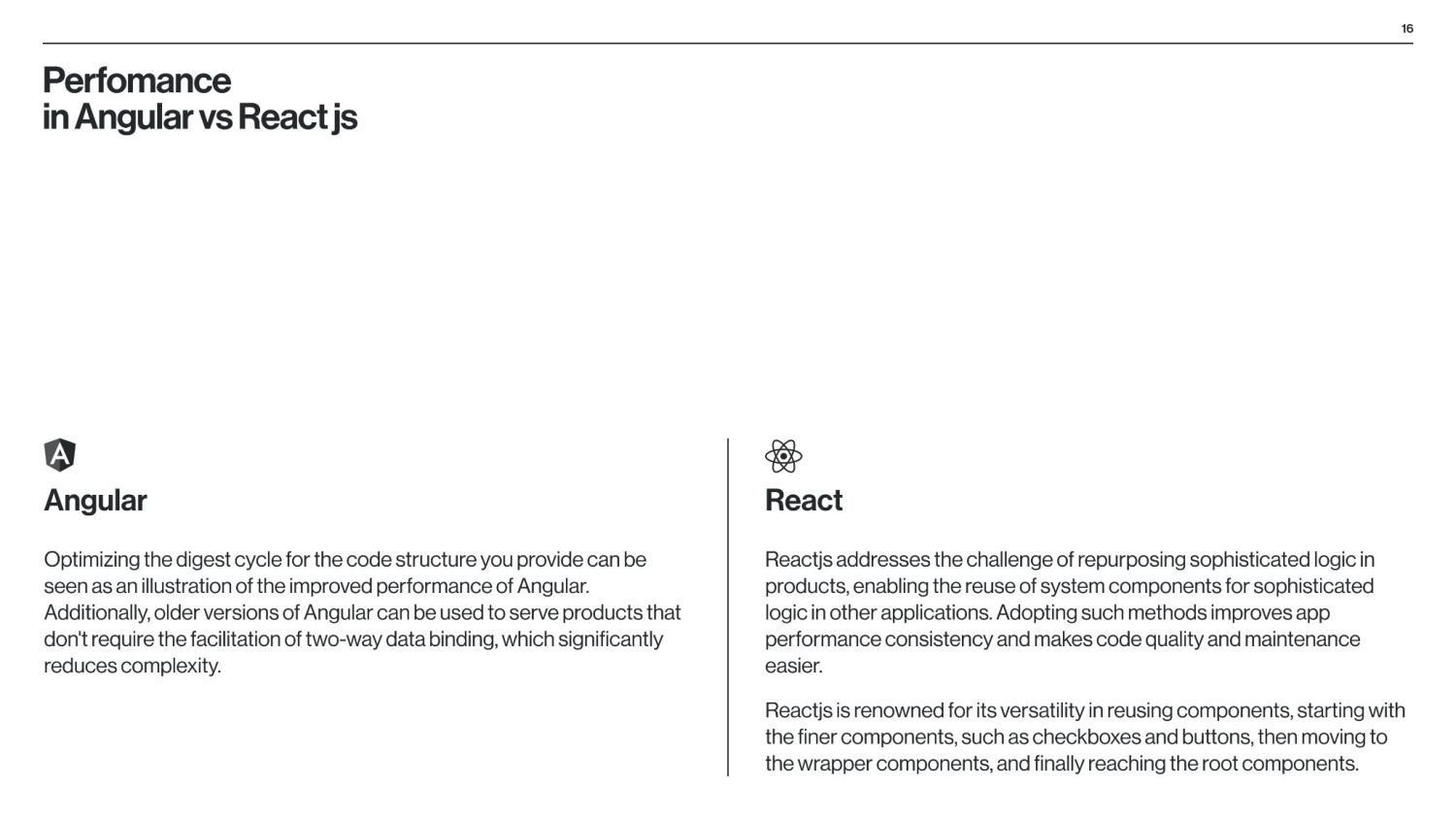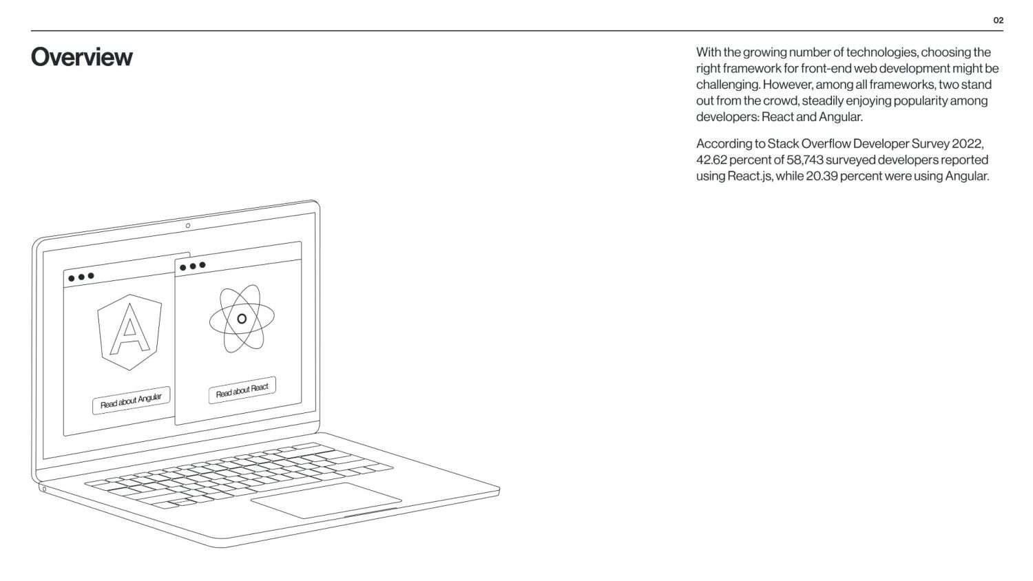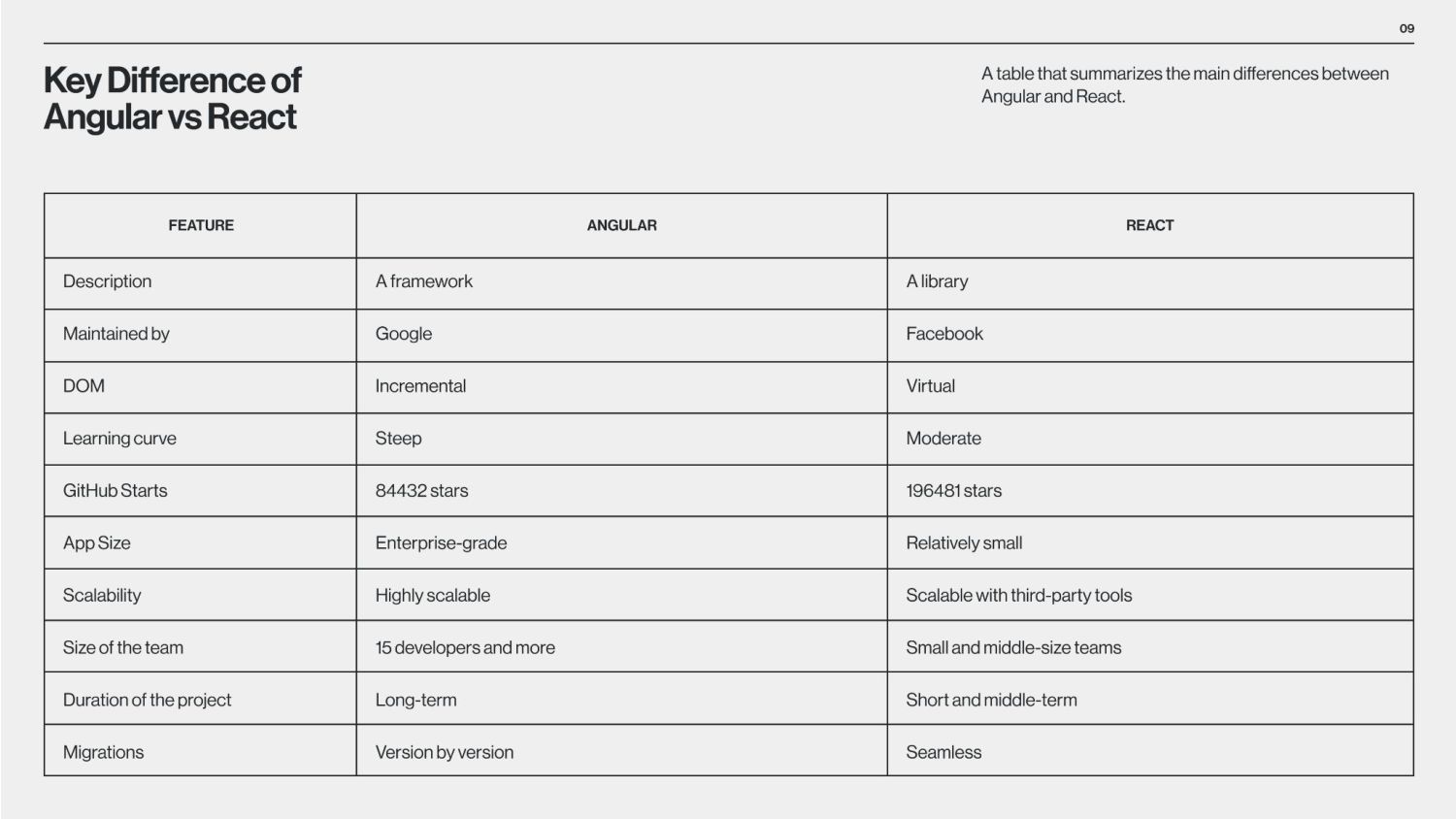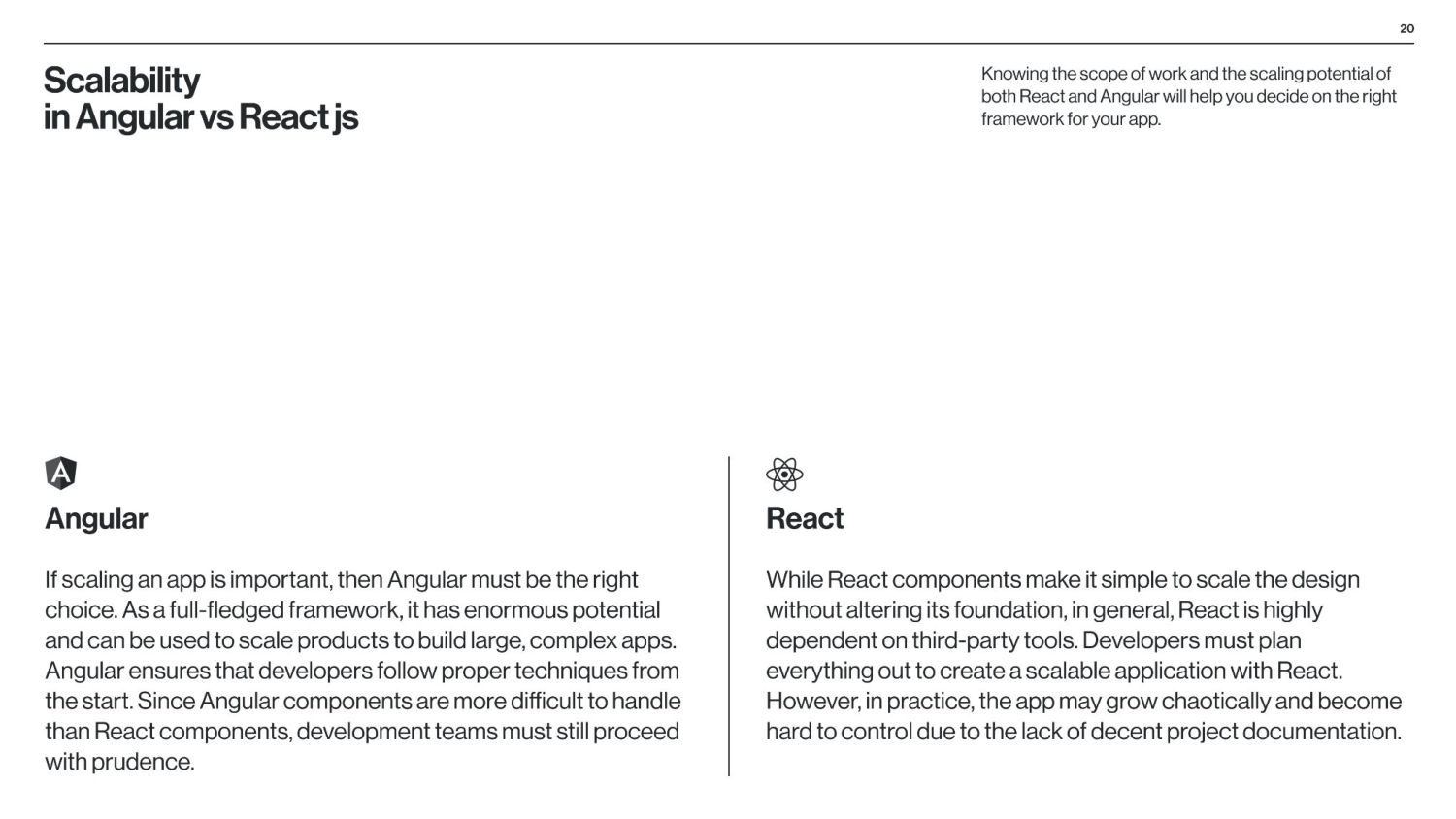 between Angular and React is that Angular is a structural framework for creating dynamic web projects, whereas React is a JavaScript library that enables the creation of UI components. Other vital differences underlie the purpose of use, data binding, language, UI components, dependency injection, and Document Object Model (DOM). React is used by numerous social media platforms, including Facebook, Instagram, and Skype. Uber, Airbnb, Netflix, The New York Times, Dropbox, Zendesk, and Amazon are additional companies that have created apps utilizing React. Companies Using React Companies Using Angular Angular is used by Google, Microsoft Office Home, Upwork, Sony, and PayPal. Forbes, HBO, and Overleaf are examples of well-known applications created with Angular. The framework is also used by many Google applications, including Gmail and Google Voice. The job market for Angular vs React According to Google trends (2017-2022), we can see that in 2017, nearly equal numbers of jobs demand knowledge of Angular or React. However, interest in React jobs has doubled in the last five years and is approximately two times bigger than in Angular jobs.