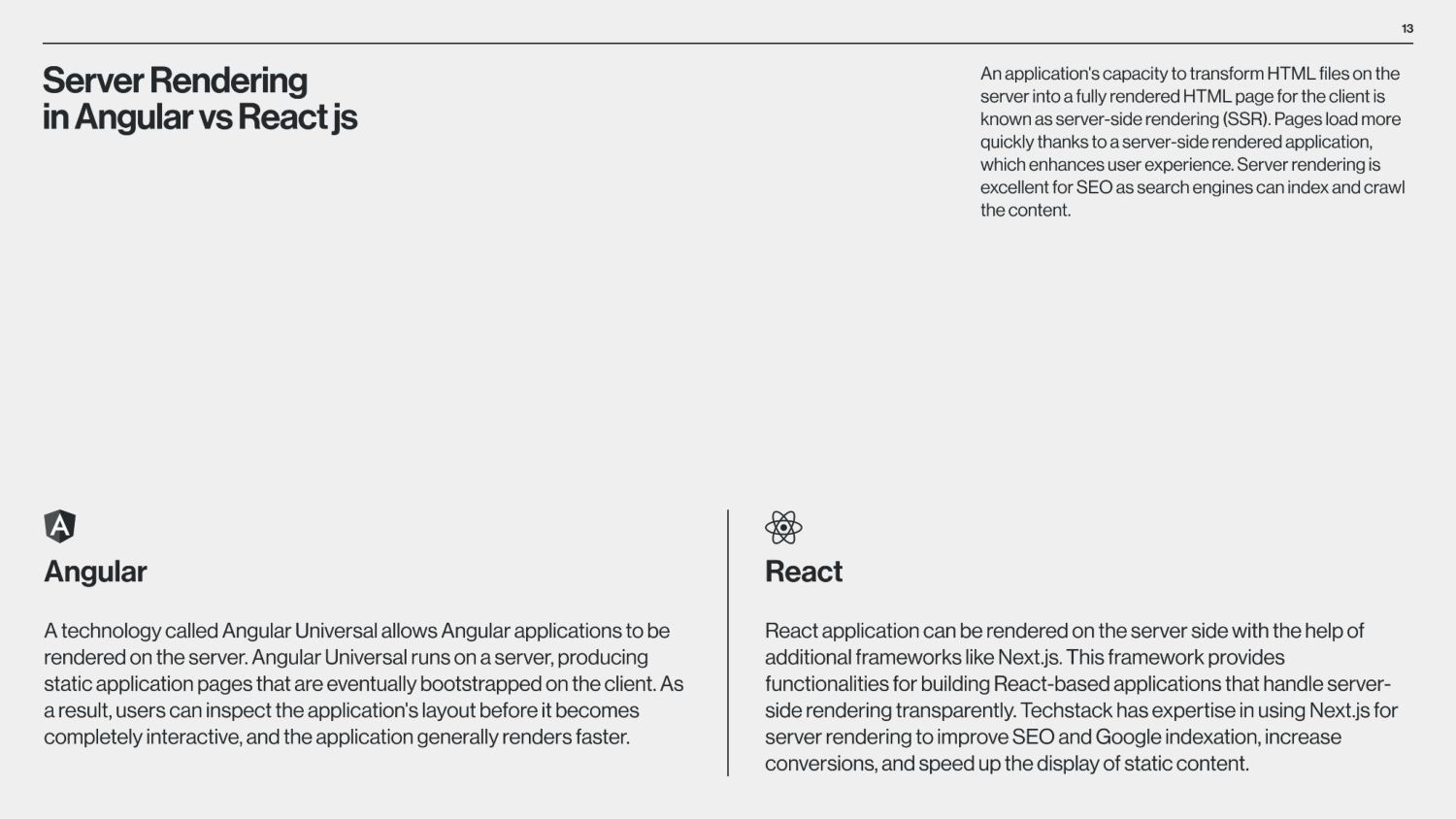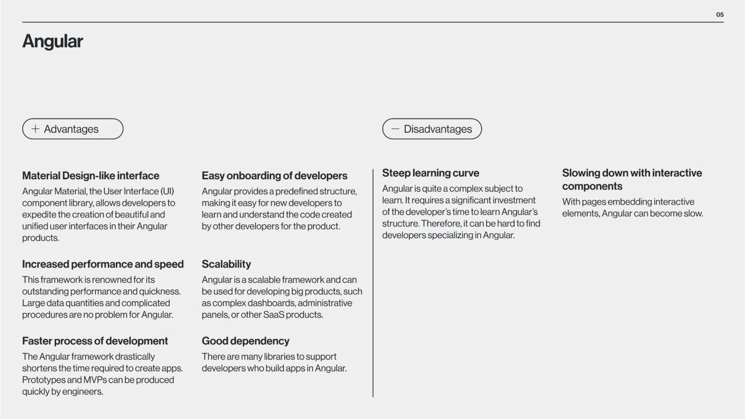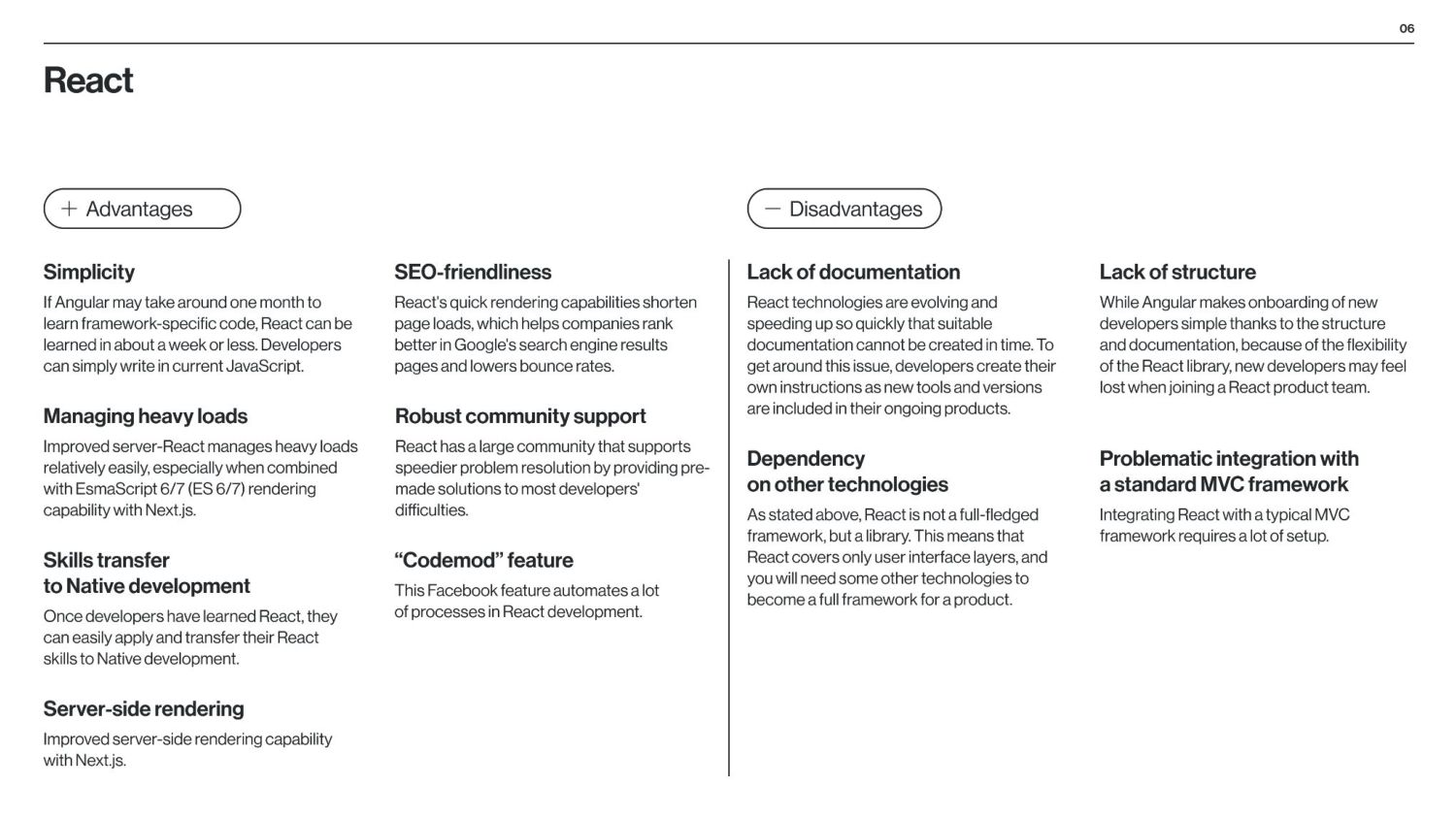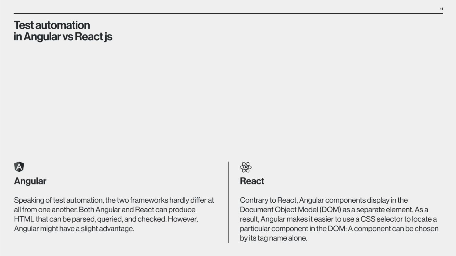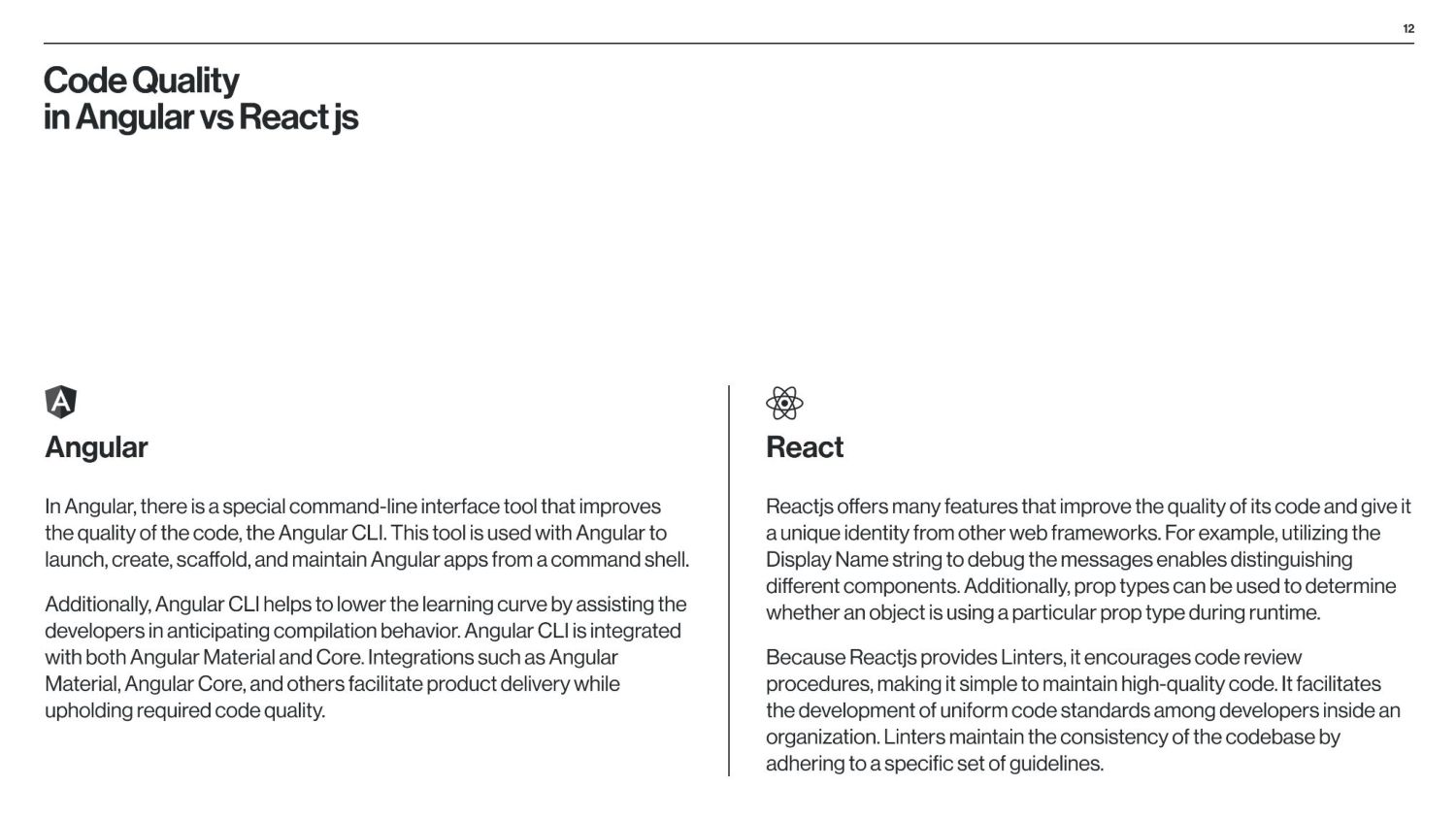 between Angular and React is that Angular is a structural framework for creating dynamic web projects, whereas React is a JavaScript library that enables the creation of UI components. Other vital differences underlie the purpose of use, data binding, language, UI components, dependency injection, and Document Object Model (DOM). React is used by numerous social media platforms, including Facebook, Instagram, and Skype. Uber, Airbnb, Netflix, The New York Times, Dropbox, Zendesk, and Amazon are additional companies that have created apps utilizing React. Companies Using React Companies Using Angular Angular is used by Google, Microsoft Office Home, Upwork, Sony, and PayPal. Forbes, HBO, and Overleaf are examples of well-known applications created with Angular. The framework is also used by many Google applications, including Gmail and Google Voice. The job market for Angular vs React According to Google trends (2017-2022), we can see that in 2017, nearly equal numbers of jobs demand knowledge of Angular or React. However, interest in React jobs has doubled in the last five years and is approximately two times bigger than in Angular jobs.