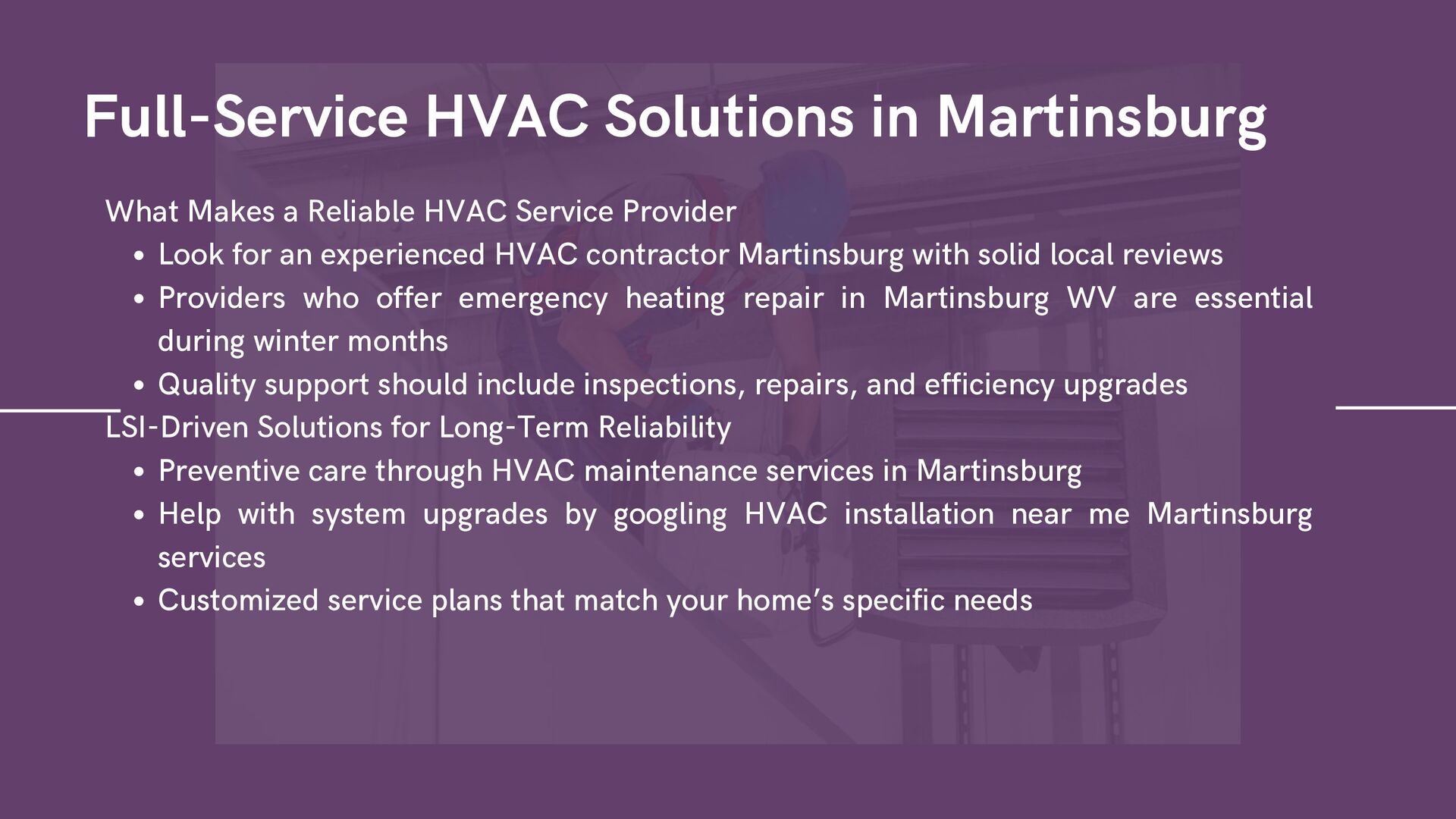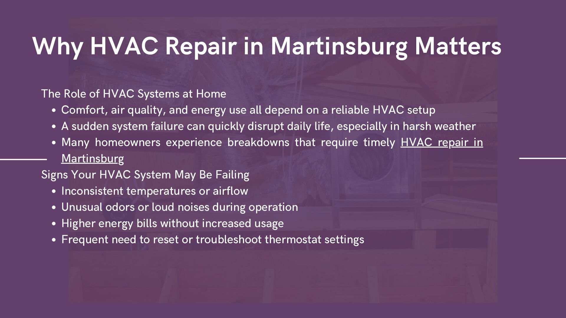 This presentation explores key insights into effective HVAC repair and maintenance in Martinsburg. From identifying early warning signs to choosing the right contractor and understanding upgrade options, it covers essential strategies for year-round comfort. Learn how to optimize your system with reliable HVAC solutions tailored to your home’s unique needs.