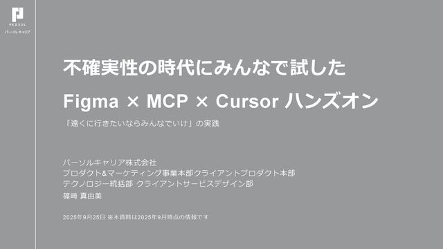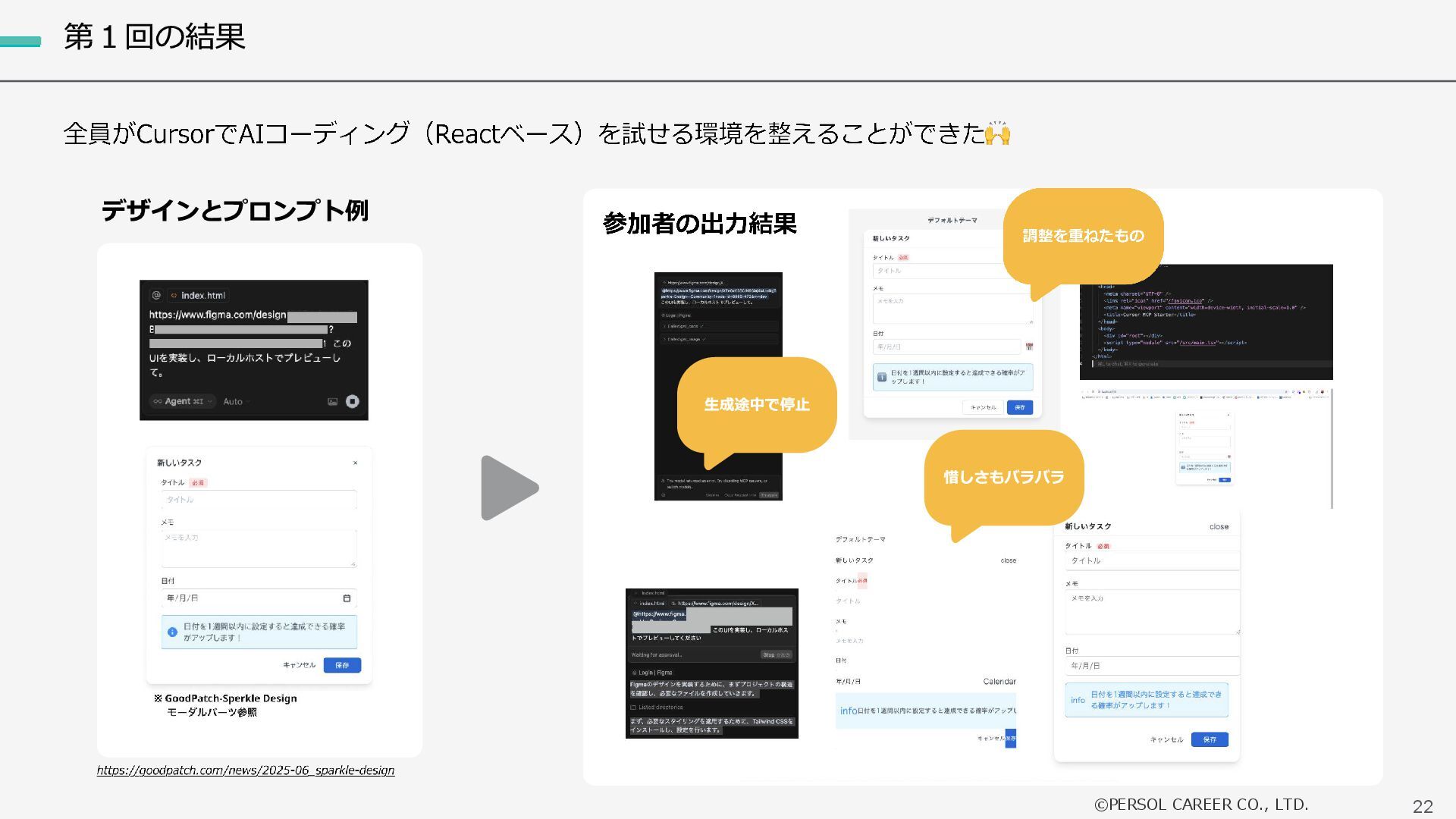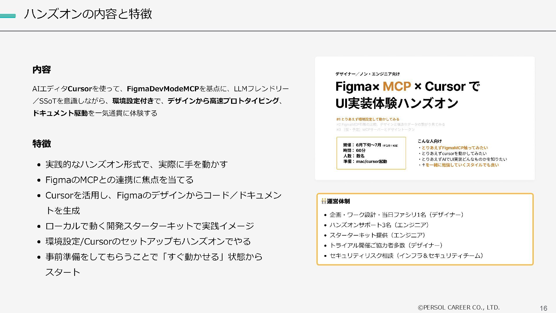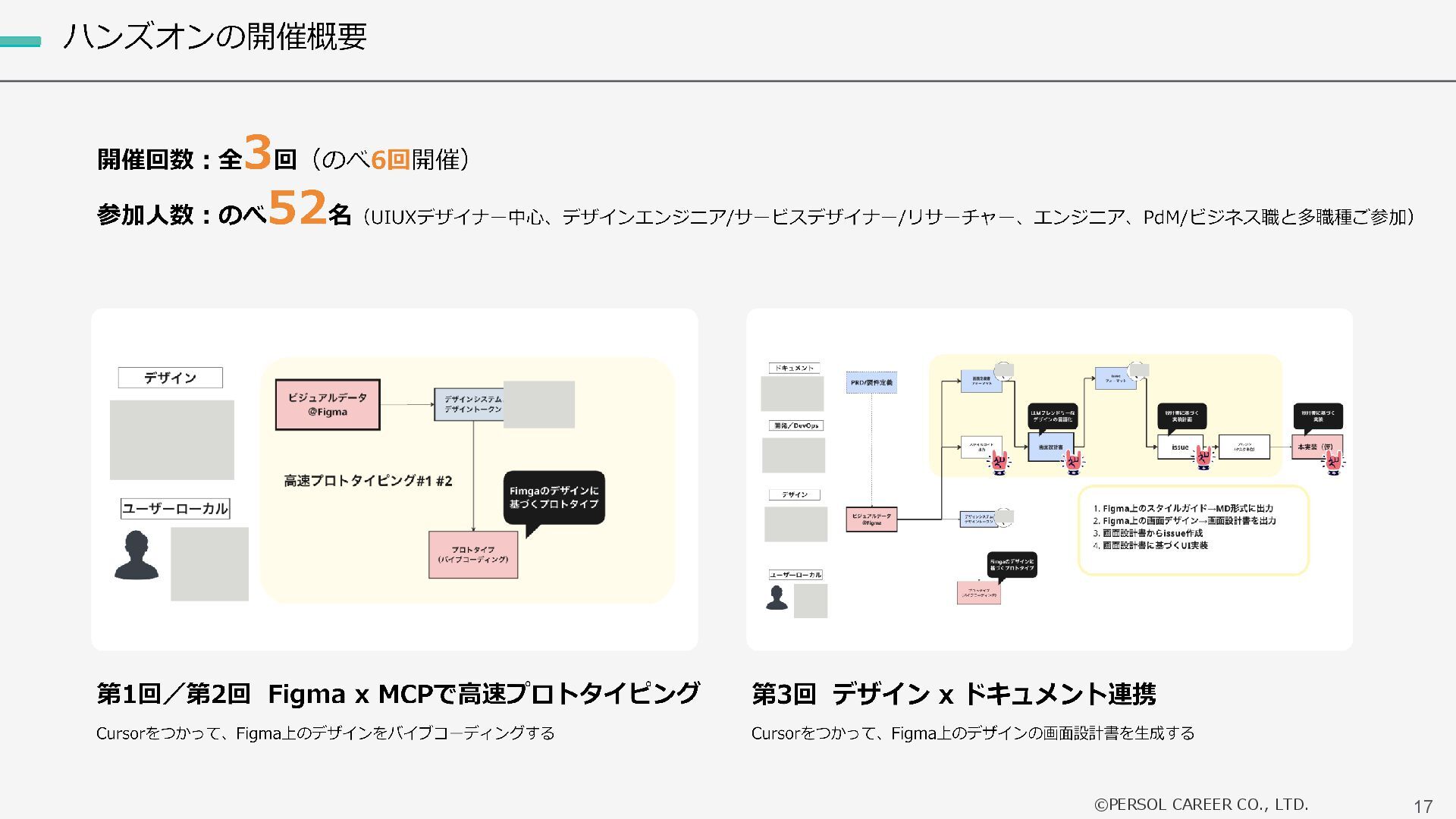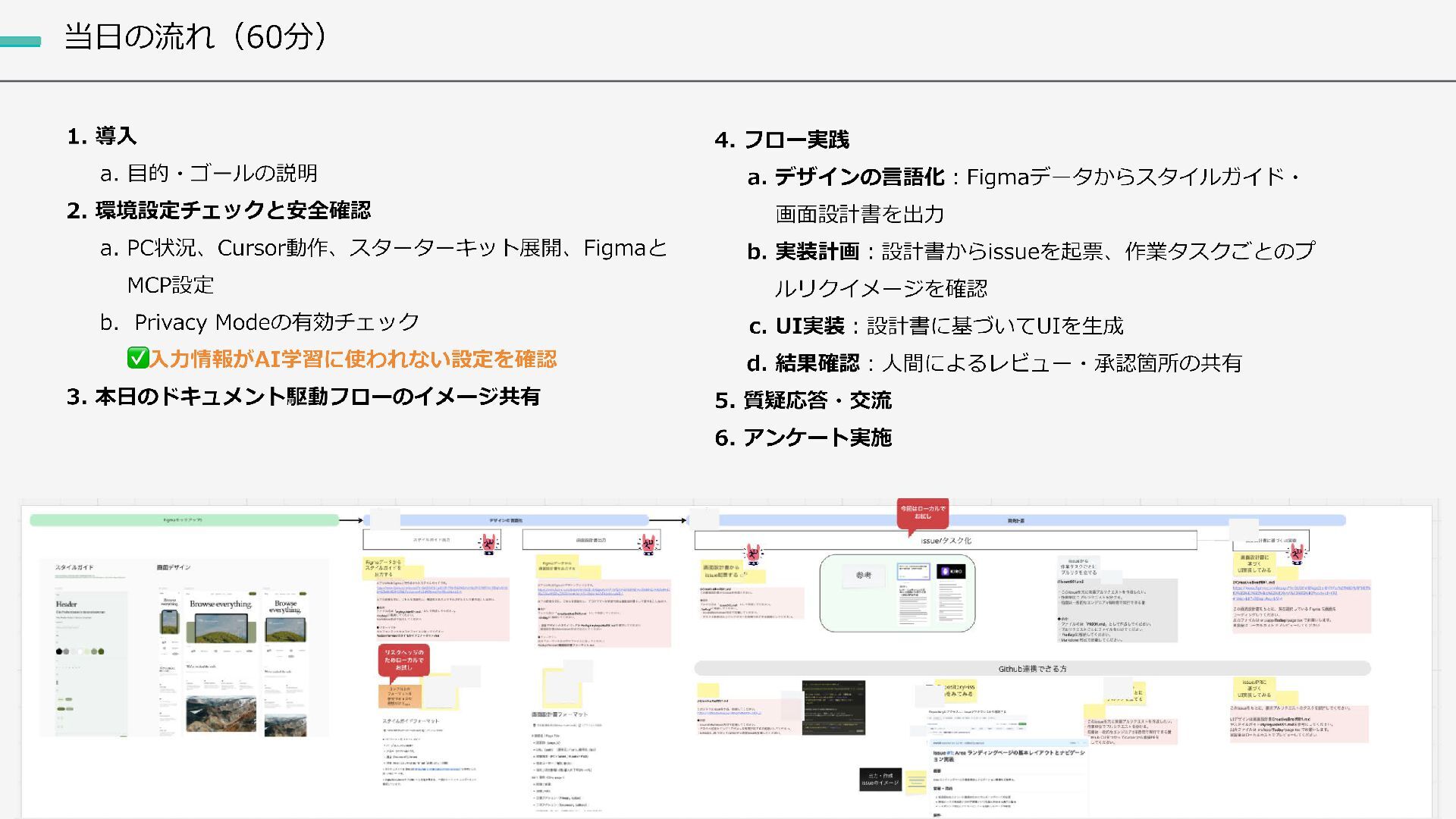 UI/UXデザインにおける生成AI活用を加速させるため、Figma×MCP×Cursorを用いたハンズオンを実施しました。デザインから実装までを一気通貫で体験し、心理的・制度的な制約を越えるには“小さく試せる場”と“専門性の持ち寄り”が重要だと再確認。協働を通じて得られた学びから、新しいデザイン実装フローの可能性を探っていく取り組みです。