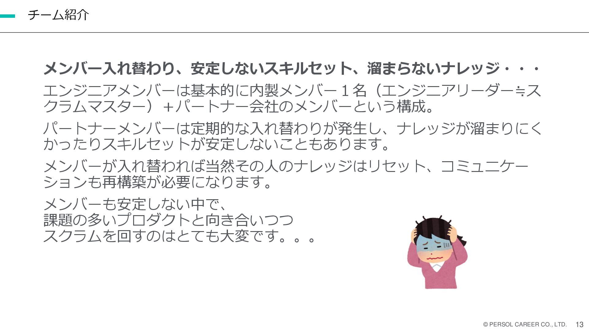 5年以上続くスクラムチームで、メンバー入れ替わりやレガシーなシステムに対して抱えている課題と、それに対するアプローチとして実践した取り組みを紹介します。