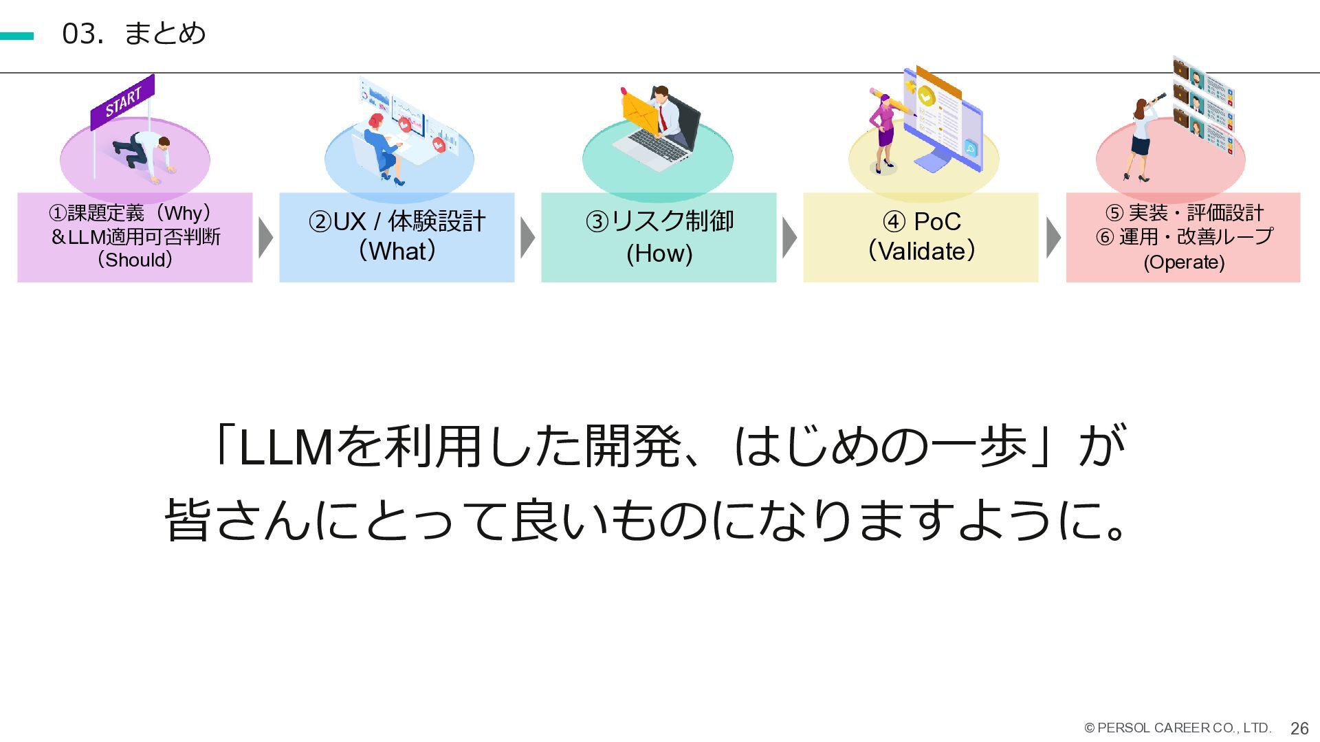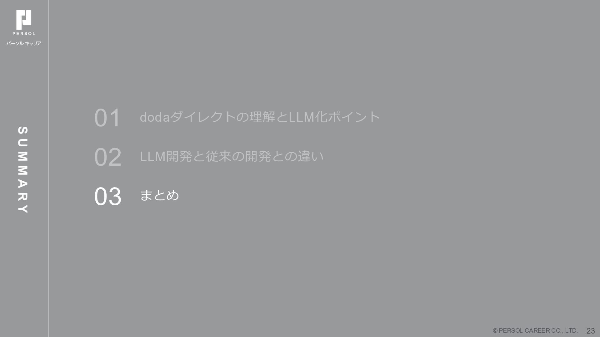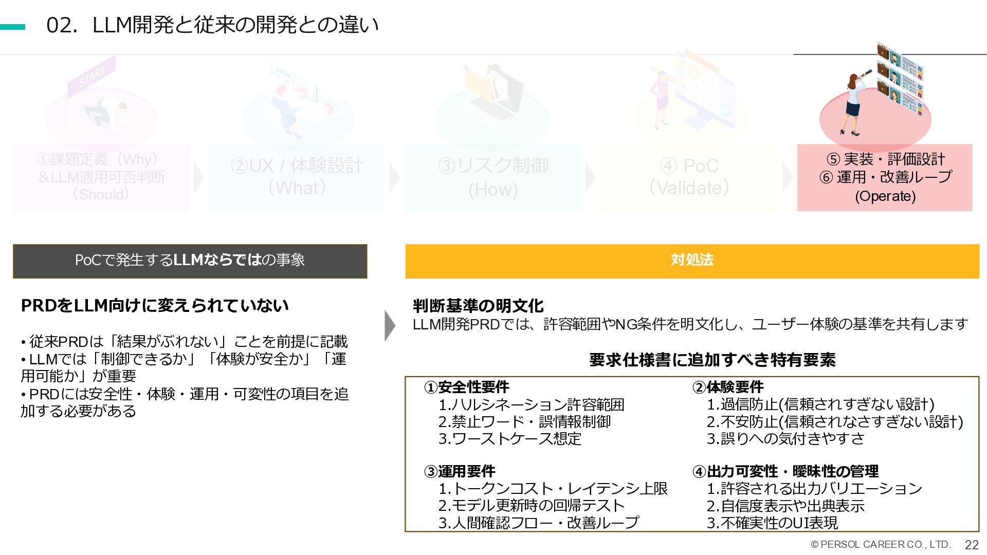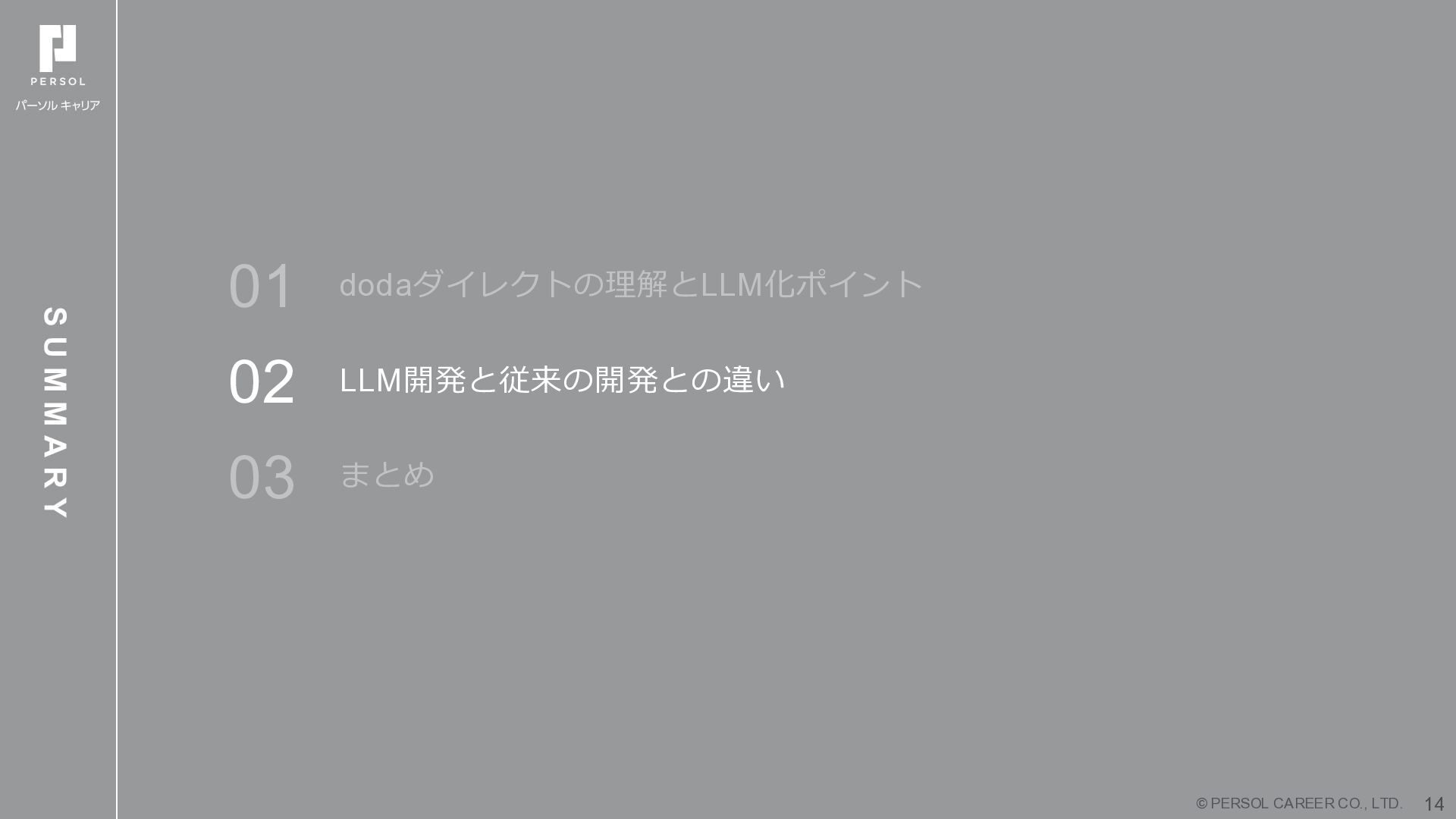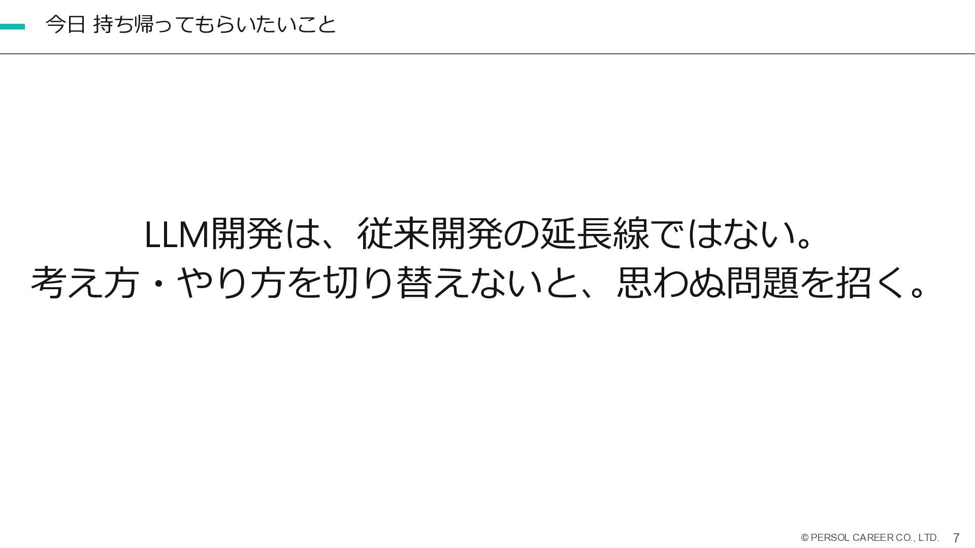 本資料は、LLM(大規模言語モデル)を使った開発をこれから始める人向けに、基本的な考え方をできる限りわかりやすくまとめたものです。dodaダイレクトの事例を通して、LLMが得意なこと・苦手なことや、従来の開発との違いを紹介しています。特に、「AIを使うこと」自体を目的にせず、ユーザーが安心して使える体験や、運用・リスクを考えながら進めることの大切さを解説しています。