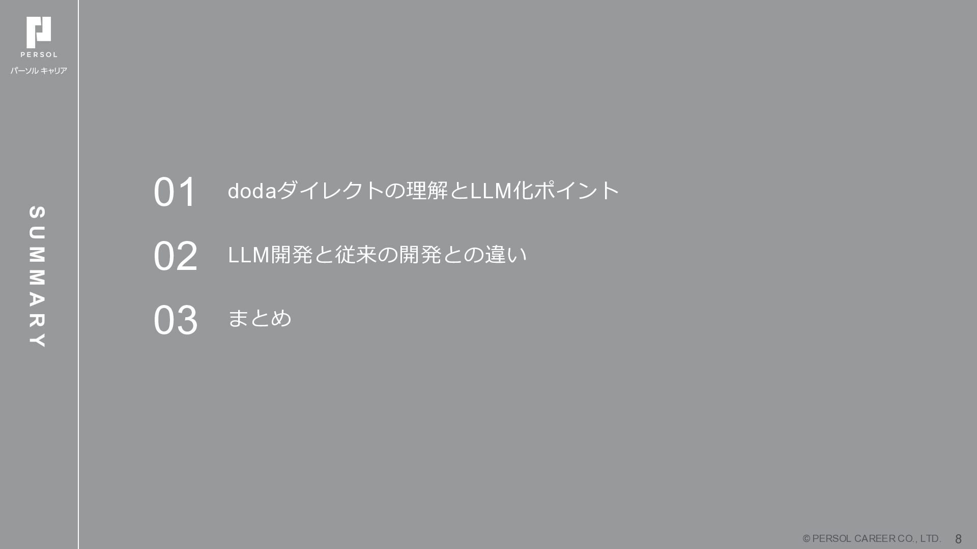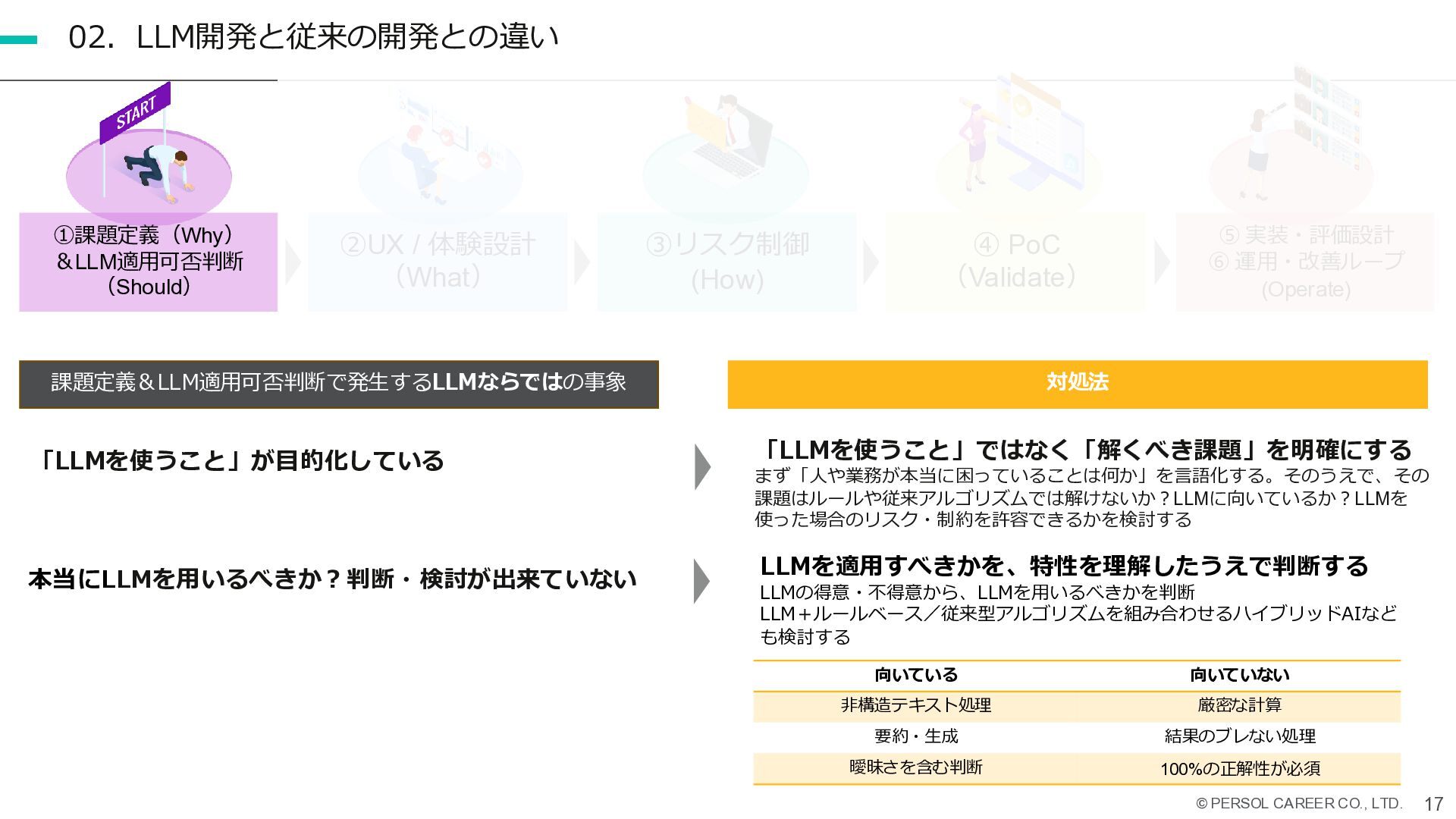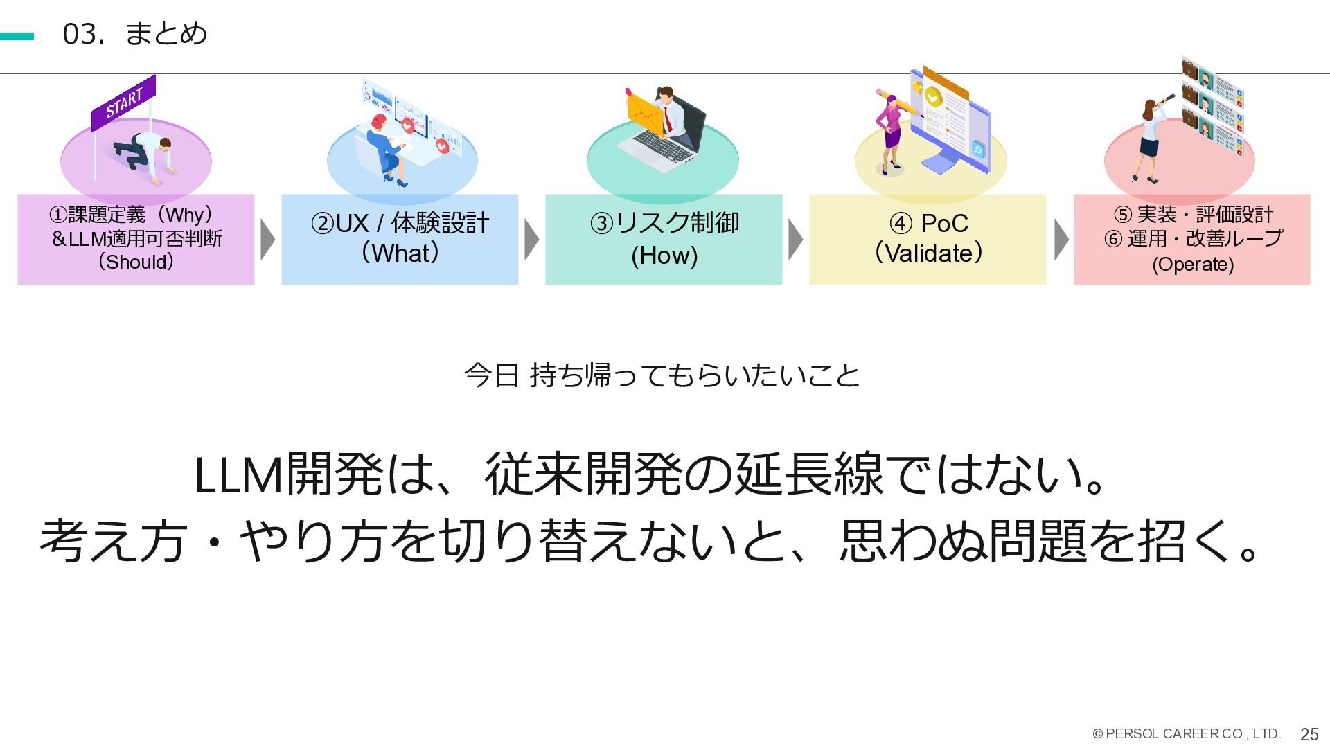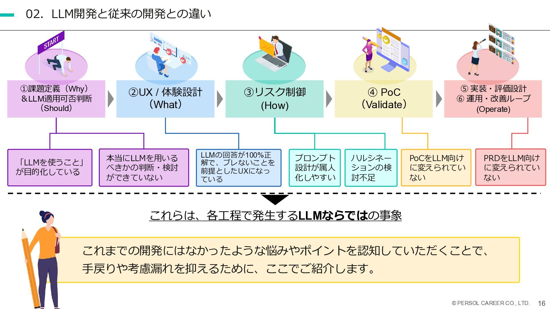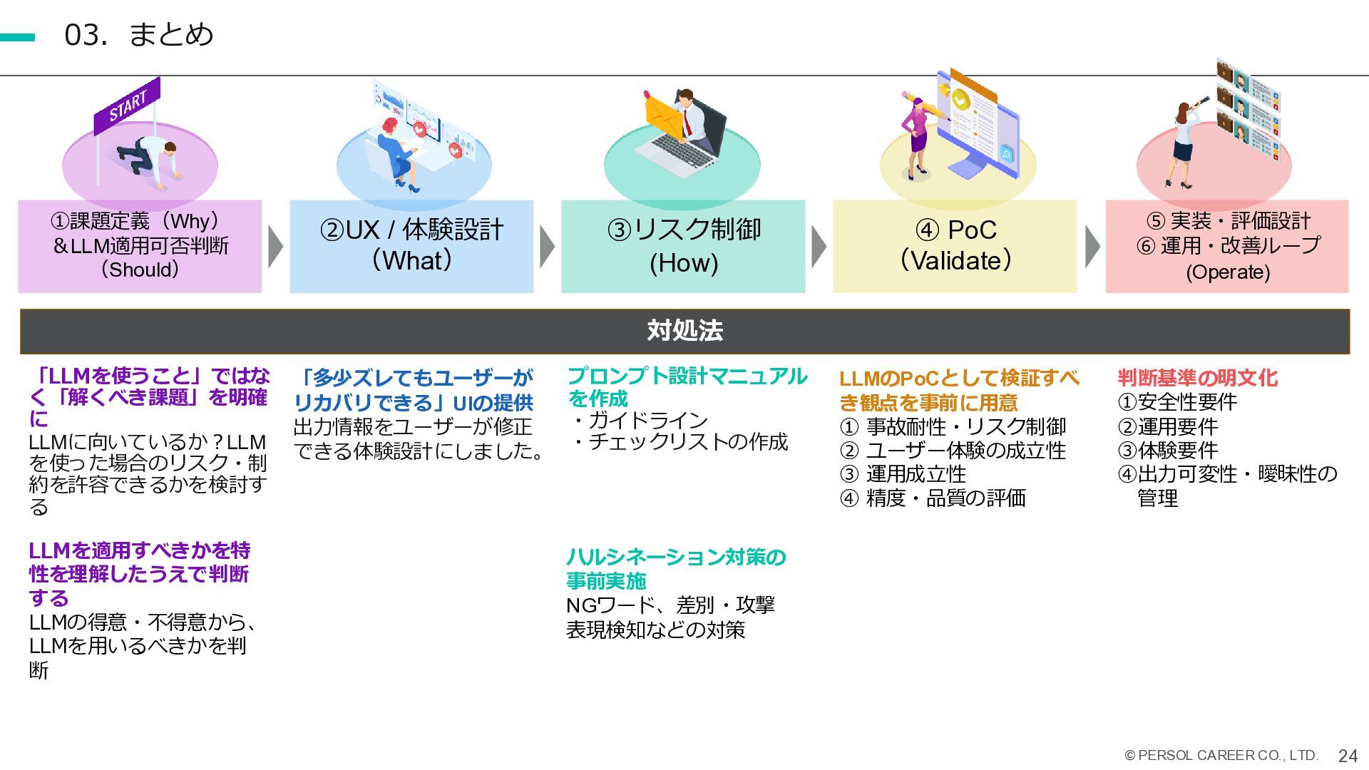 本資料は、LLM(大規模言語モデル)を使った開発をこれから始める人向けに、基本的な考え方をできる限りわかりやすくまとめたものです。dodaダイレクトの事例を通して、LLMが得意なこと・苦手なことや、従来の開発との違いを紹介しています。特に、「AIを使うこと」自体を目的にせず、ユーザーが安心して使える体験や、運用・リスクを考えながら進めることの大切さを解説しています。