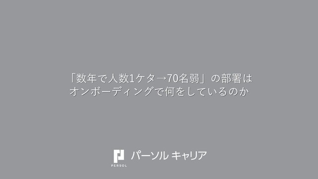 ること。 短期的にも、中長期的にも、新入社員と 受入組織の双方の期待値が満たされるこ とがオンボーディングの成功。 採用担当者とオンボーディング担当者は その道筋を作ることが役割、と言えるの ではないでしょうか。 「数年で人数1ケタ→70名弱」の部署は オンボーディングで何をしているのか パーソルキャリア株式会社 田口 雄一 どれか欠けると ミスマッチが発生 新入社員が 期待すること 受入組織が 期待すること 新しい職場で活躍したい 仕事で自己実現したい 収入、労働環境、プロジェクト、役職 会社と部署に馴染んでもらって 成果を挙げてもらいたい 定着して長く勤めてもらいたい 自分が業務に馴染むまでの サポートをして欲しい 会社や部署のミッションを遂行したい 新入社員に対して 受入組織に対して 中長期的成功:新入社員の定着と活躍、受入組織のミッションが達成されること 短期的成功 :新入社員が会社に馴染み自走できる状態になること オンボーディング の目的