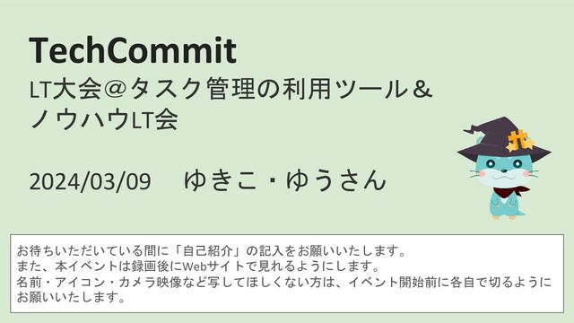 お待ちいただいている間に「自己紹介」の記入をお願いいたします。 また、本イベントは録画後にWebサイトで見れるようにします。 名前・アイコン・カメラ映像など写してほしくない方は、イベント開始前に各自で切るように お願いいたします。 TechCommit LT大会@タスク管理の利用ツール& ノウハウLT会 2024/03/09 ゆきこ・ゆうさん