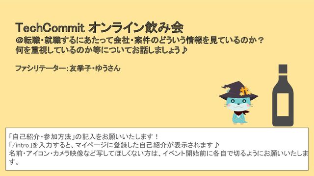 1. 1. 開催の挨拶・案内(10分) 2. 自己紹介タイム(10分) 3. 交流タイムのやり方説明 4. お題について(就職・案件選び・転職) 5. 来月のイベント企画について/来月のオンライン飲み会・朝活(5分)