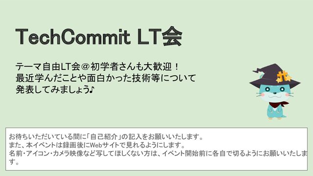 1分前に声をかけますのでご配慮下さい。 ◦ 基本的に画面共有でスライドなど見せられるものをご用意下さい。 ◦ 登壇の前後でスライドの PDFをSlackへ共有お願いしております。※なくても OKです! ◦ 飛び入りも時間内であれば歓迎です!※発表資料がなくても大歓迎です ✨ • 視聴 ◦ 質問時以外はミュートでお願いします。 ◦ (登壇者は寂しいので)積極的にチャットやスタンプで応援しましょう。 ◦ 発表始めるタイミングで、聞き手の方は拍手やクラッカーでリアクションお願いします! LT大会 基本ルール