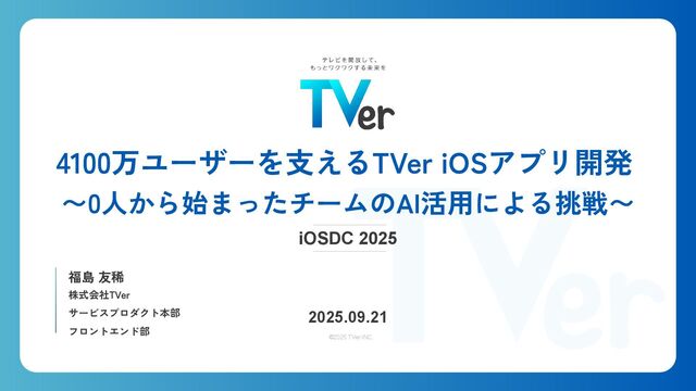 ©2025 TVer INC. 4100万ユーザーを支えるTVer iOSアプリ開発 〜0人から始まったチームのAI活用による挑戦〜 2025.09.21 福島