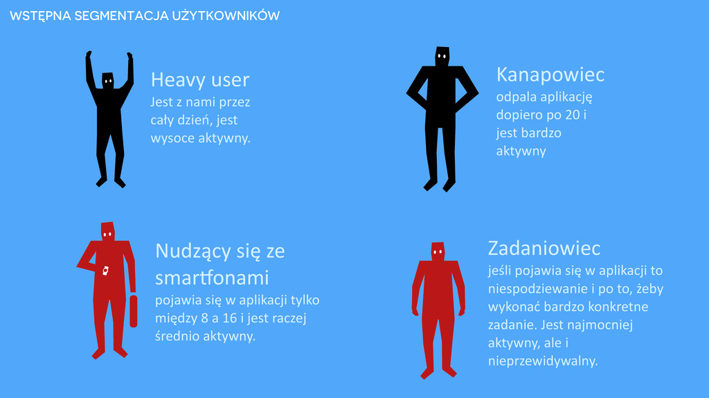 cały dzień, jest wysoce aktywny. Kanapowiec odpala aplikację dopiero po 20 i jest bardzo aktywny Nudzący się ze smar8onami pojawia się w aplikacji tylko między 8 a 16 i jest raczej średnio aktywny. Zadaniowiec jeśli pojawia się w aplikacji to niespodziewanie i po to, żeby wykonać bardzo konkretne zadanie. Jest najmocniej aktywny, ale i nieprzewidywalny.