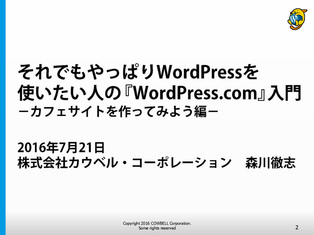 2016年7月21日、コワーキングスペース『sankaku』(福井市)で開催したWordPress.comセミナーで使ったスライドです。
