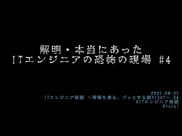 【オンライン】ITエンジニア怪談 ~背筋も凍る、ゾッとする話Night~ #4 https://gaiax.connpass.com/event/220010/ の発表資料です。