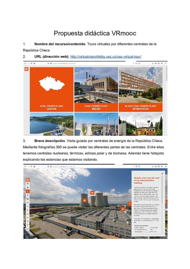 diferentes centrales de la República Checa 2. URL (dirección web): http://virtualniprohlidky.cez.cz/cez-virtual-tour/ 3. Breve descripción. Visita guiada por centrales de energía de la República Checa. Mediante fotografías 360 se puede visitar las diferentes partes de las centrales. Entre ellas tenemos centrales nucleares, térmicas, eólicas,solar y de biomasa. Además tiene hotspots explicando las estancias que estamos visitando.