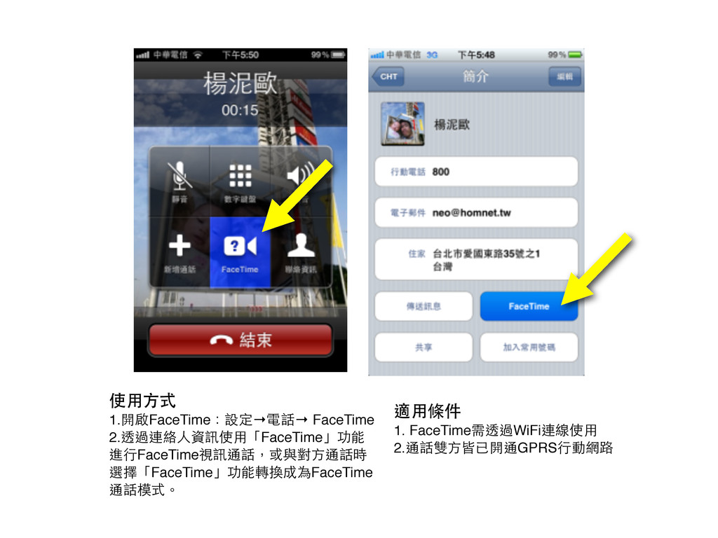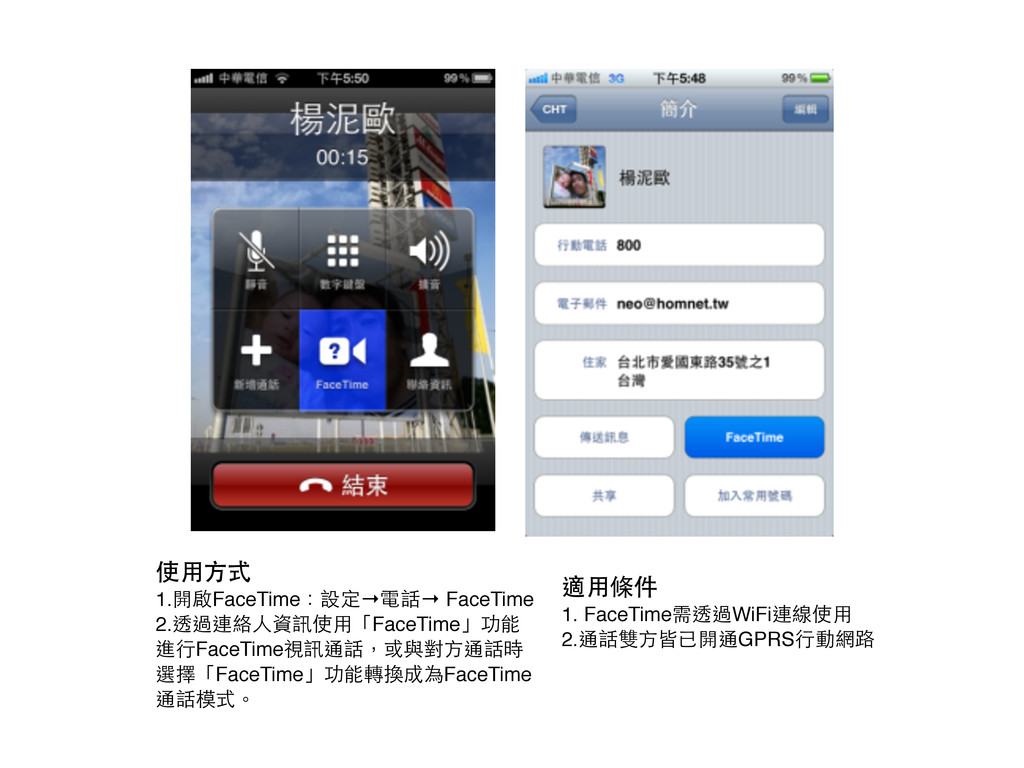 適⽤用條件 1. FaceTime需透過WiFi連線使⽤用 2.通話雙⽅方皆已開通GPRS⾏行動網路 使⽤用⽅方式 1.開啟FaceTime:設定→電話→ FaceTime 2.透過連絡⼈人資訊使⽤用「FaceTime」功能 進⾏行FaceTime視訊通話,或與對⽅方通話時 選擇「FaceTime」功能轉換成為FaceTime