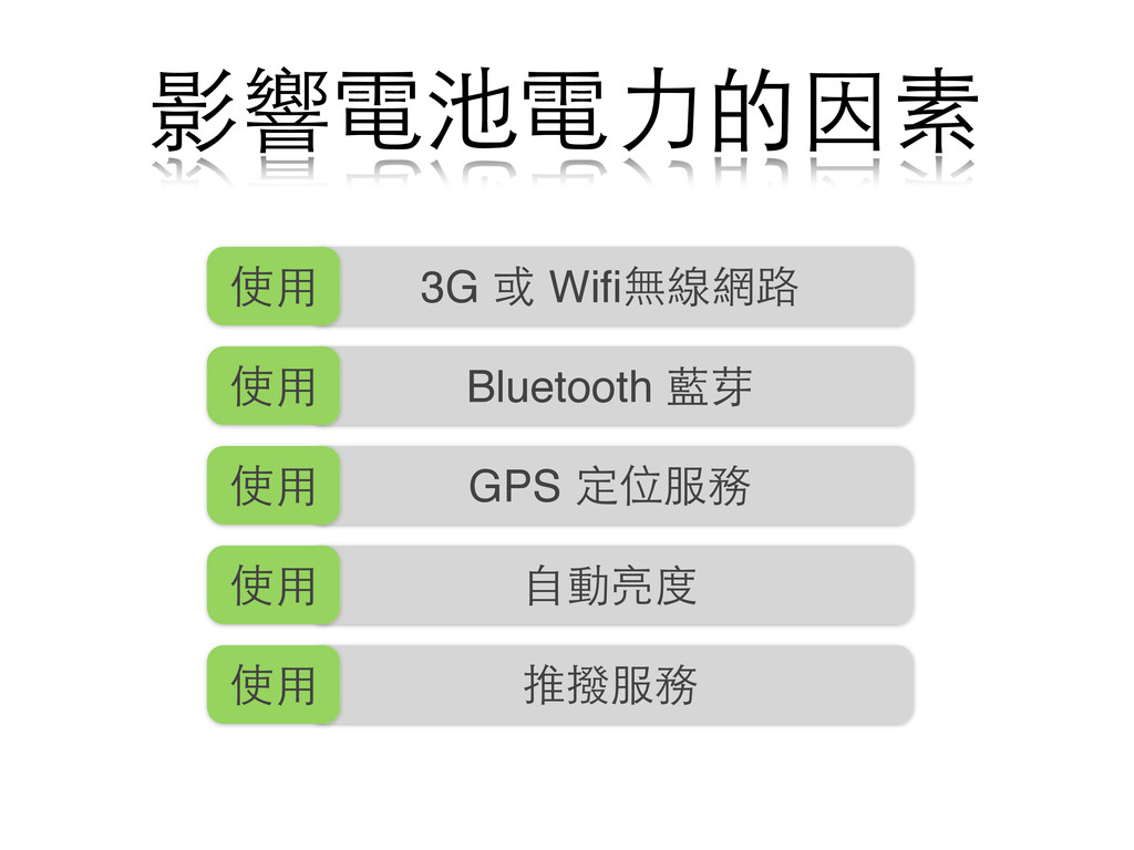⾃自動亮度 使⽤用 推撥服務 使⽤用 影響電池電⼒力的因素